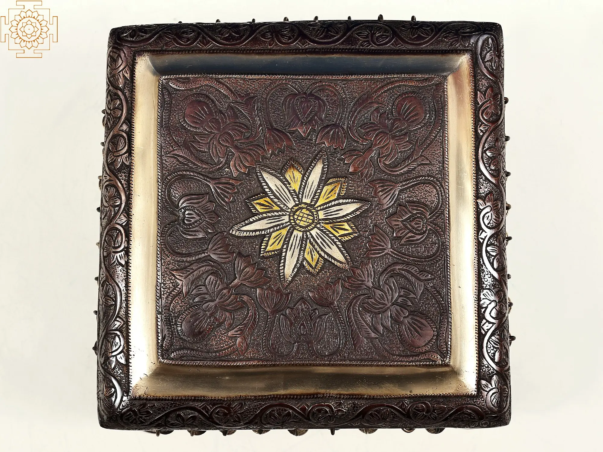 This Chowki, a celestial pedestal, emerges as a symphony of craftsmanship in the tapestry of Indian culture. Handmade with devotion, its brass canvas unfolds a narrative of intricate floral motifs, etched with a dance of elegance.