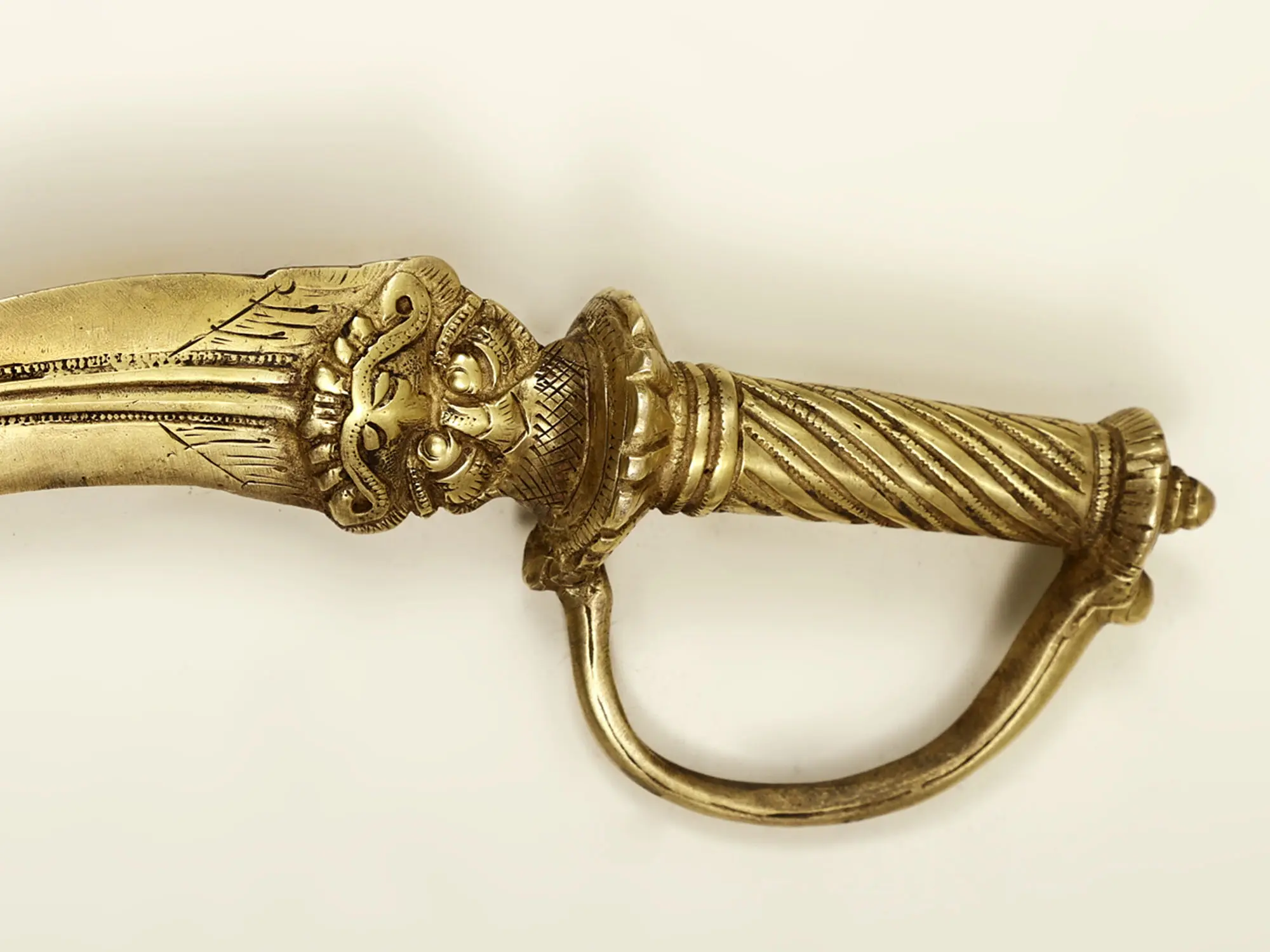 Elevate your home decor with this exquisite brass dagger, a piece that speaks of rich cultural heritage and masterful craftsmanship. Meticulously cast from high-quality brass, this decorative item boasts a substantial feel and a warm, inviting glow that will instantly add character and a touch of exotic allure to any room. Its design is deeply rooted in tradition, featuring the formidable Kirtimukha, a fearsome yet protective face often found in South Asian art and architecture, believed to ward off evil and bring good fortune.