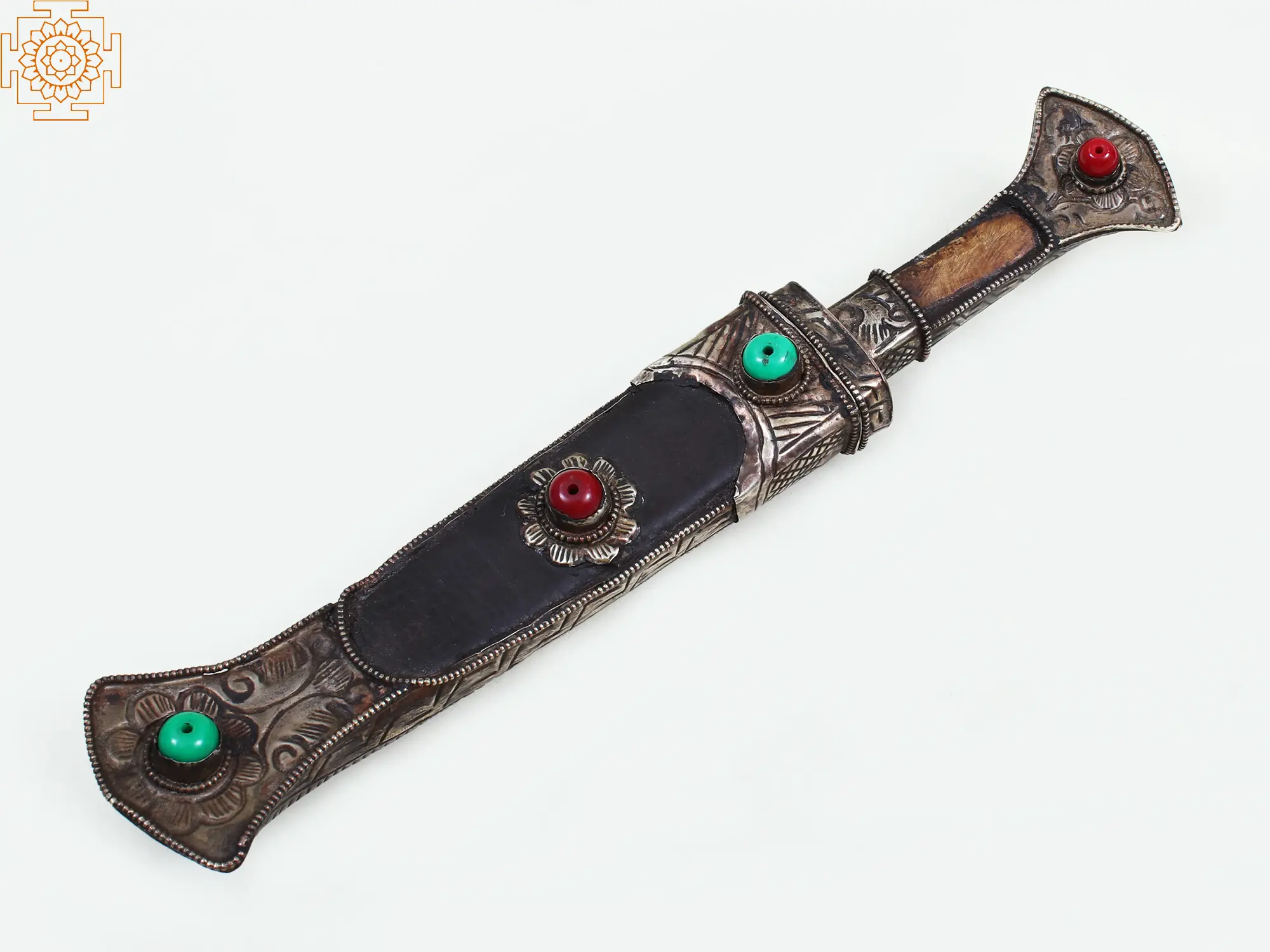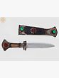 Whether displayed on a mantelpiece, a bookshelf, or within a curated collection of art objects, this decorative knife is guaranteed to draw the eye. Its unique design, blending traditional craftsmanship with captivating embellishments, makes it a standout piece that can elevate the ambiance of any room. It serves not only as a decorative accent but also as a conversation starter, inviting admiration for its artistry and the story it tells. The combination of the metallic sheen, the warm tones of the wood, and the vivid hues of the stones creates a visually engaging piece that is both striking and elegant. This item is a testament to the enduring appeal of handcrafted objects that carry a sense of history and cultural significance.