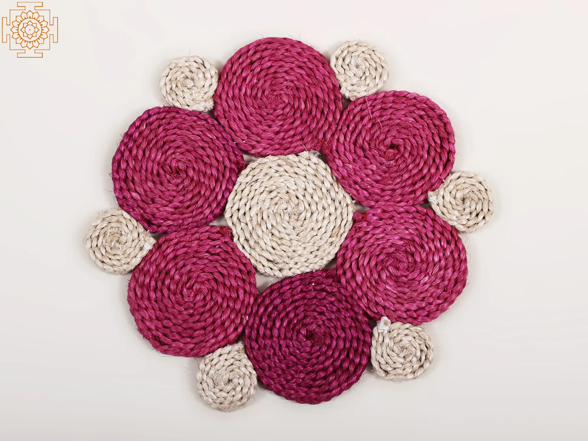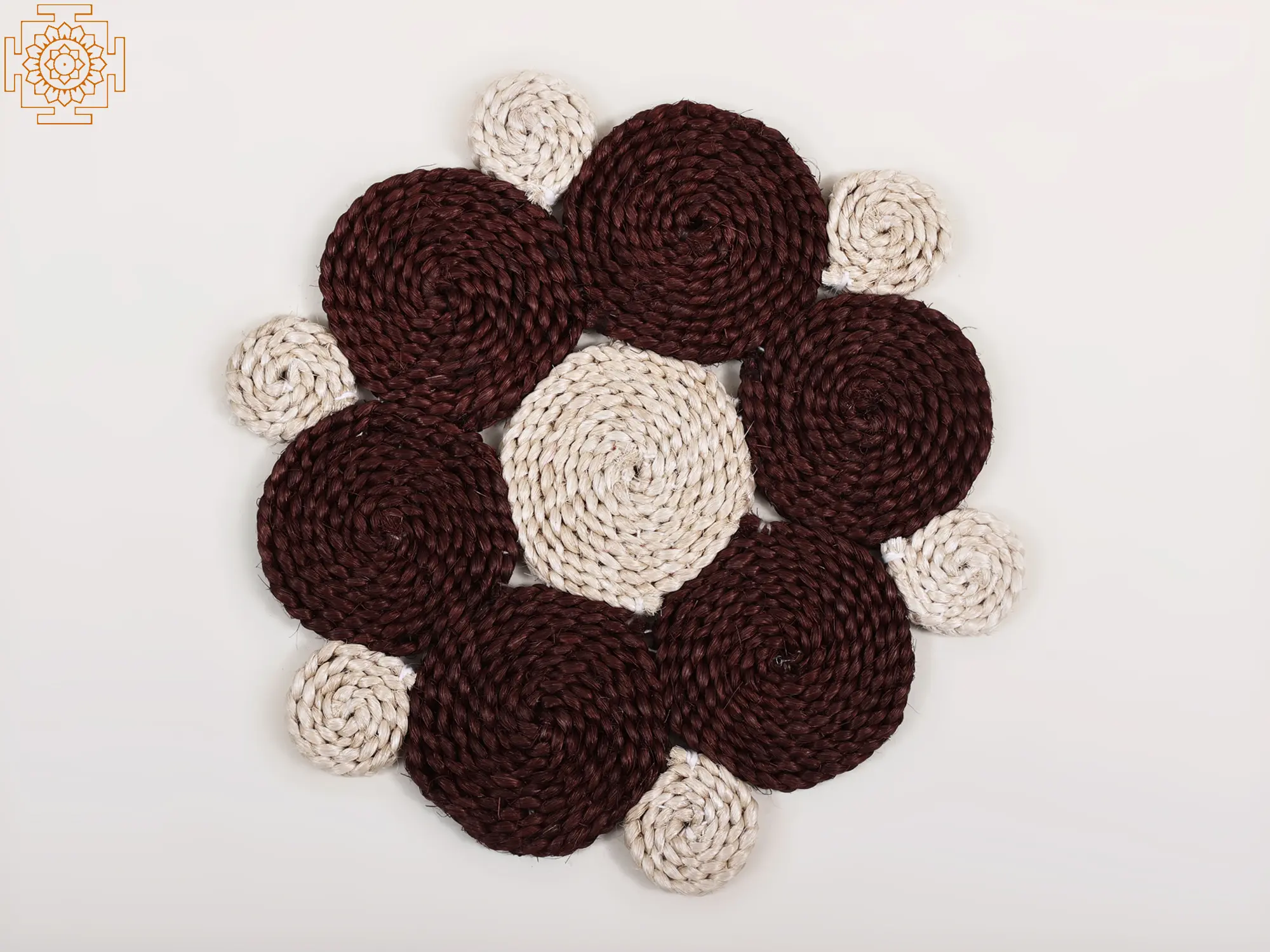 The fibre table mat, adorned with intricate patterns, weaves a tale of elegance beneath the touch of craftsmanship.