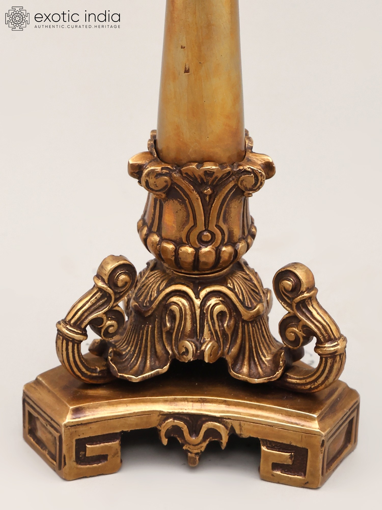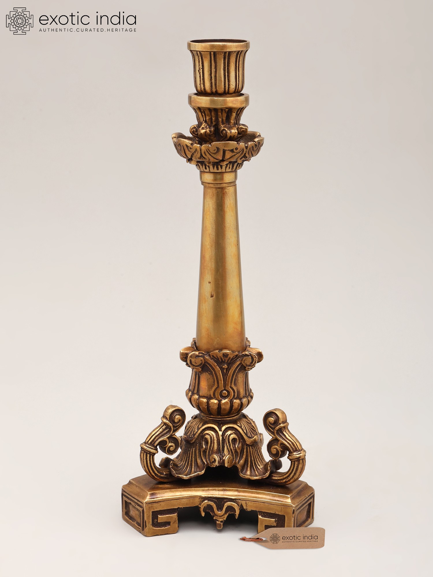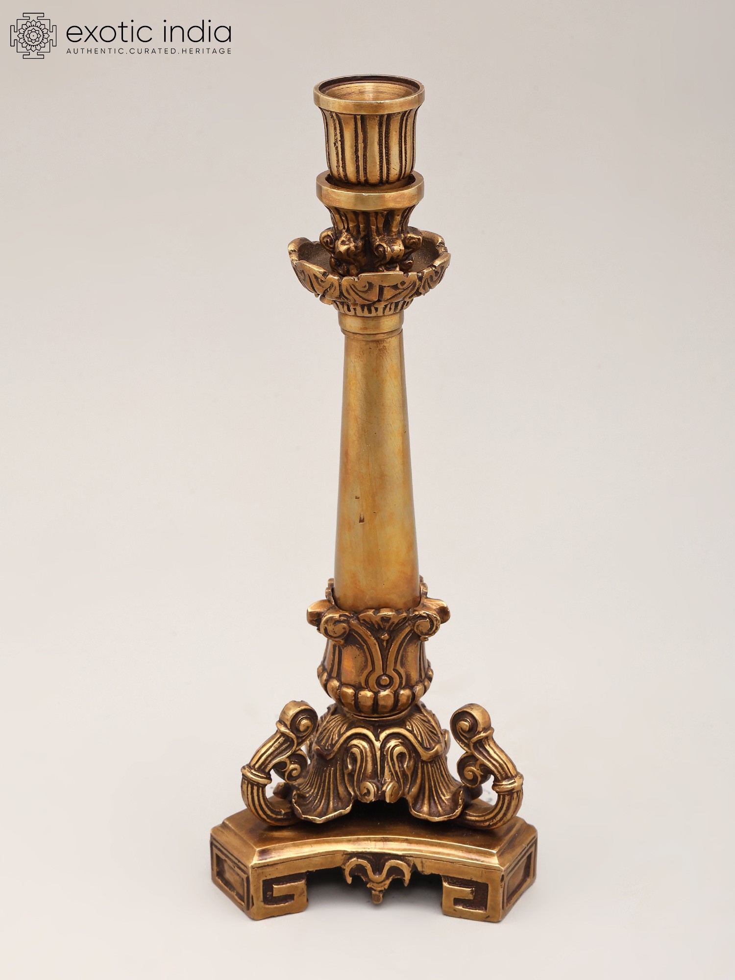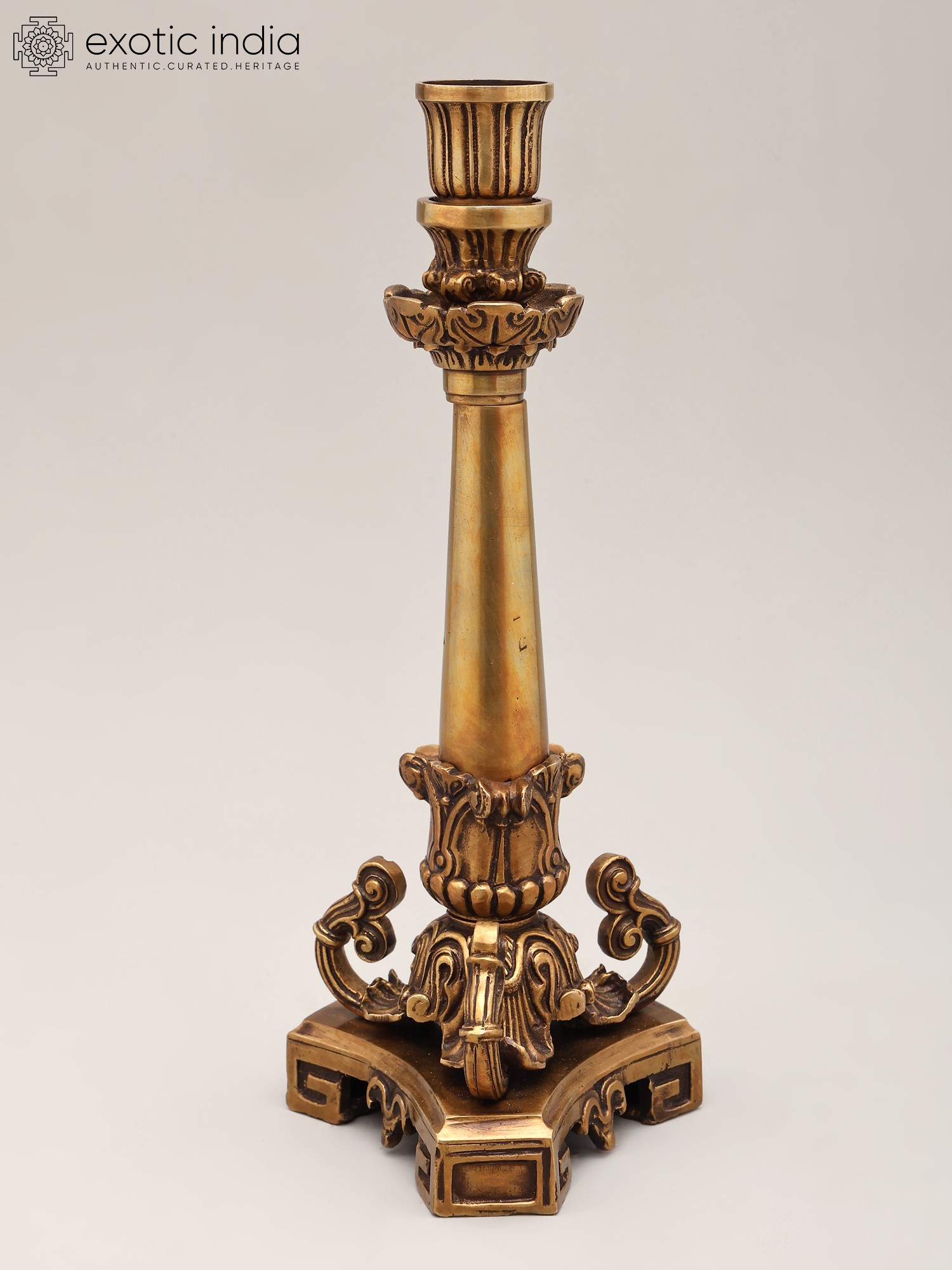 Elevate your home's ambiance with this exquisite handcrafted brass candle holder. Standing at an impressive eleven inches tall, this piece is a testament to traditional craftsmanship and sophisticated design. Its lustrous brass finish exudes a warm, inviting glow, perfectly complementing the gentle flicker of candlelight. The intricate detailing, from the ornate base to the delicately fluted candle cup, speaks of meticulous attention paid to every curve and contour. This is more than just a candle holder; it is a statement piece that adds a touch of regal charm to any interior.