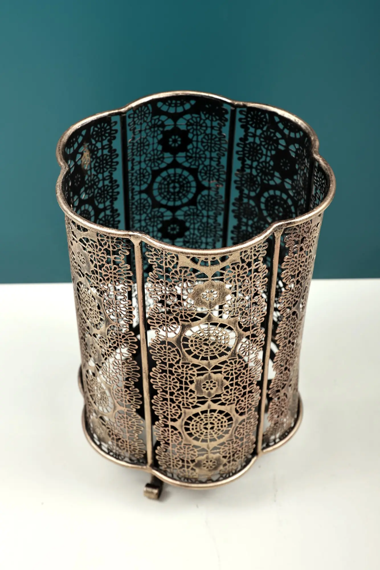 Each candle holder is meticulously handcrafted, making it a truly unique and special piece. The iron construction ensures durability and longevity, while the handcrafted details add character and charm. Small variations in the finish and design are inherent to the handmade process, making each piece one-of-a-kind. The attention to detail is evident in every aspect of this candle holder, from the intricate openwork to the gracefully curved feet. It is not just a functional object, but a work of art that will enhance the beauty of your home. Let this stunning piece illuminate your space and add a touch of elegance to your life.