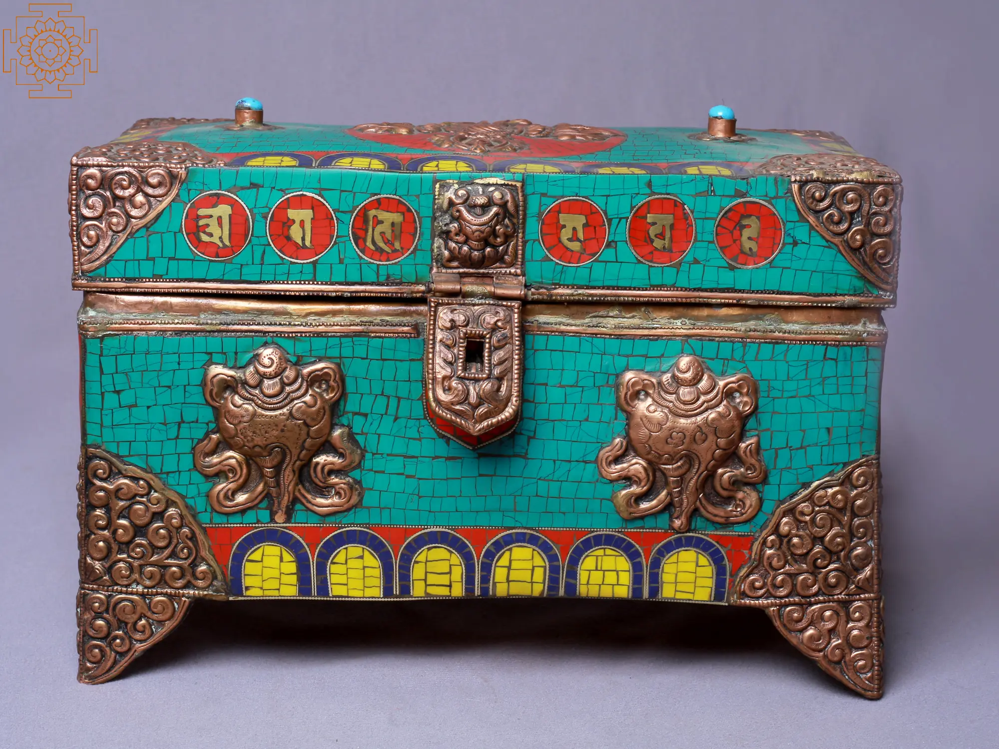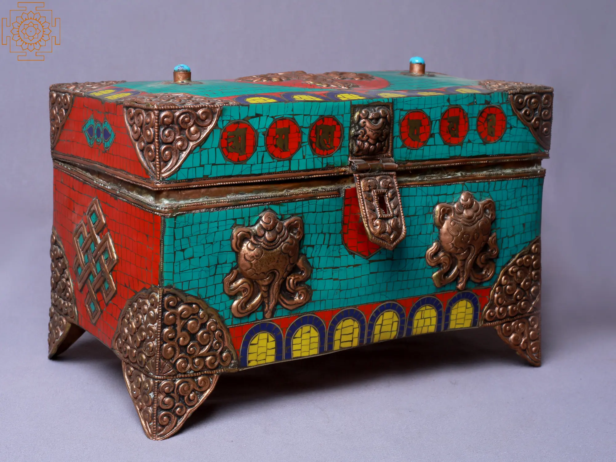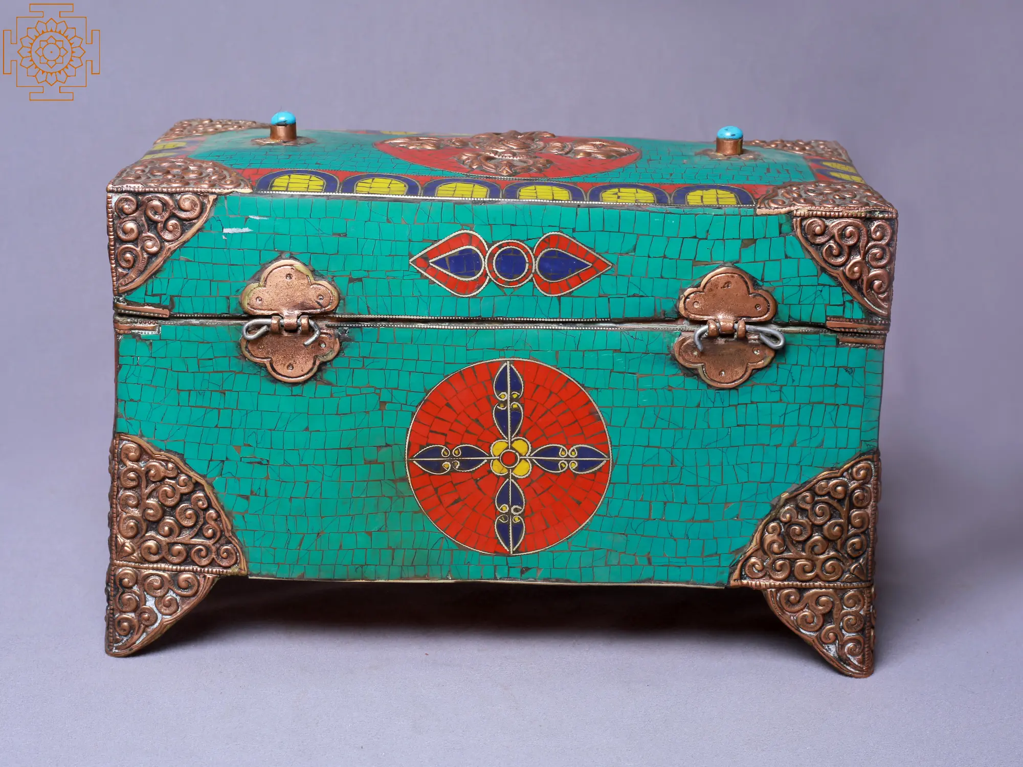 Constructed primarily from copper, this jewelry box is a fusion of traditional craftsmanship and spiritual symbolism. The use of colored stones like coral, lapis lazuli, and turquoise enhances its beauty, bringing vibrancy and elegance. This Beautiful Tibetan chest is not just a jewelry box; it is a work of art that encapsulates the spiritual essence and cultural richness of the Himalayan region.