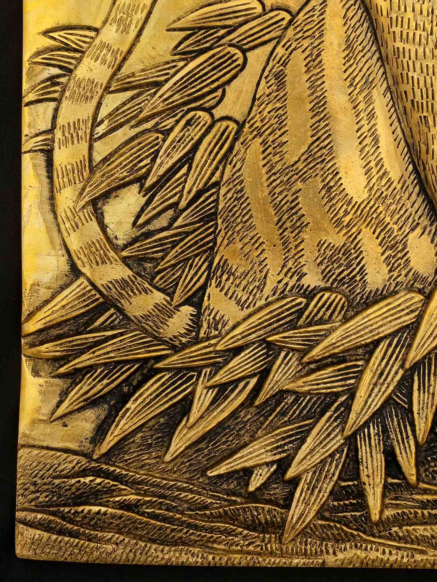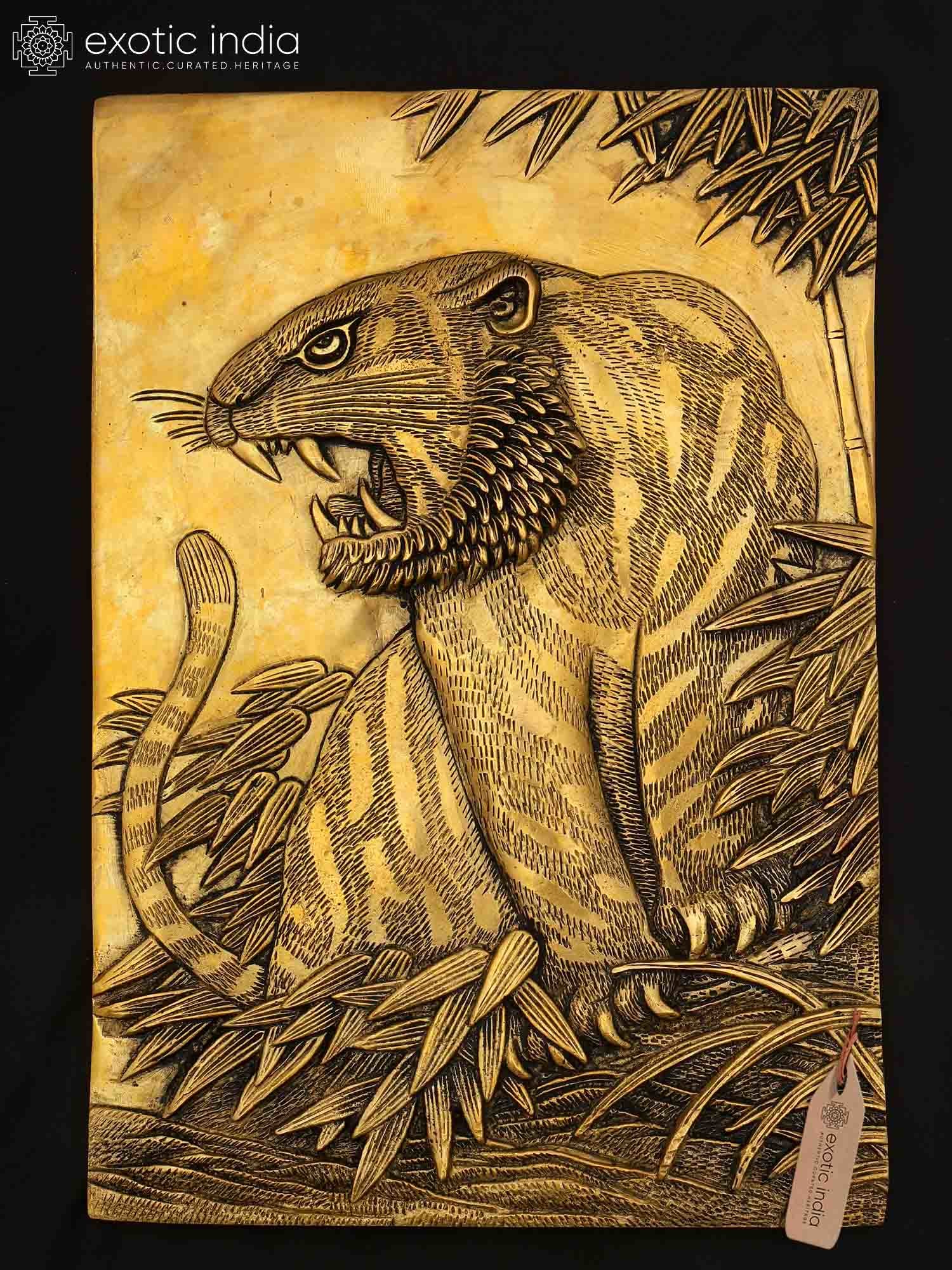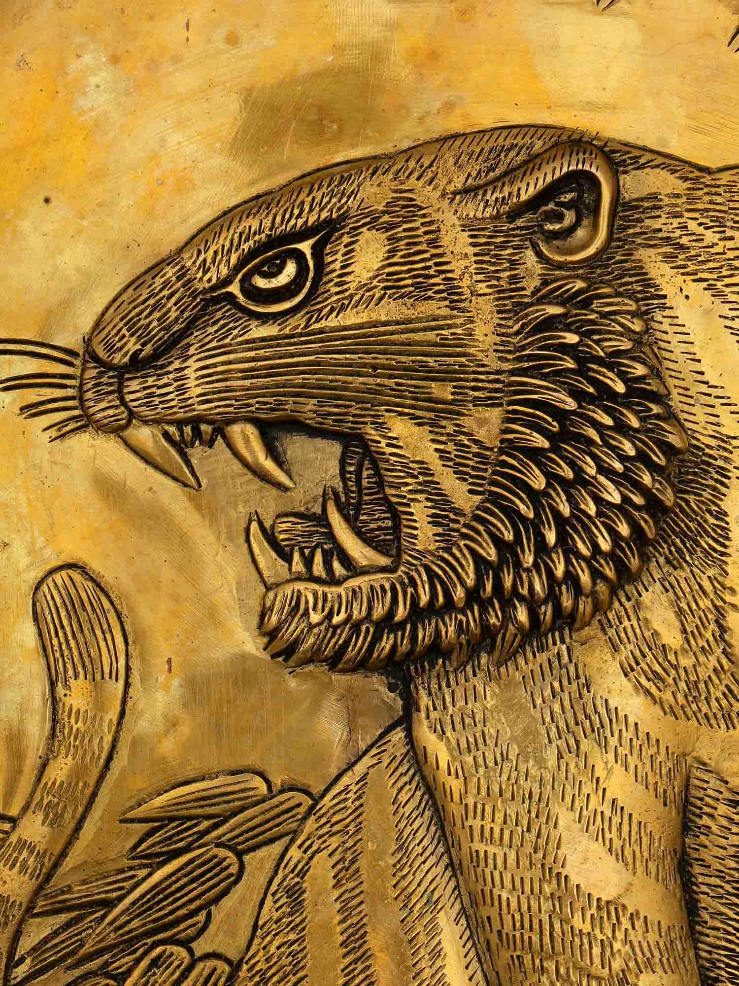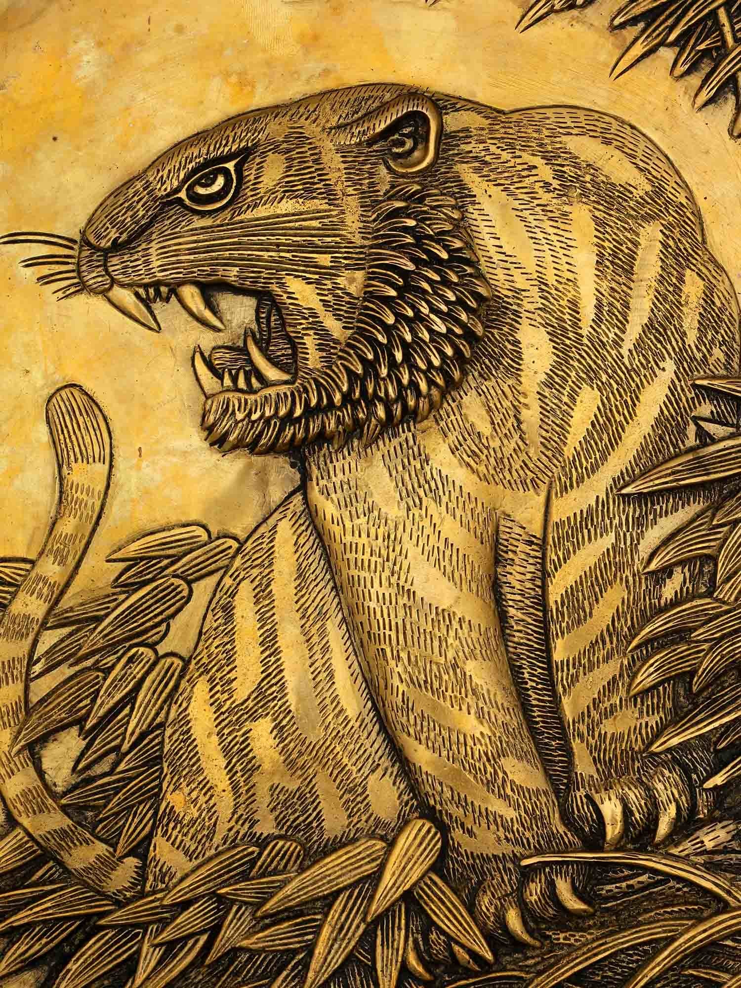 Bring the untamed spirit of the wild into your home with this breathtaking brass wall hanging. This exquisite piece captures a majestic tiger in its natural habitat, exuding power, grace, and an aura of primal beauty. The meticulous craftsmanship brings the feline to life, showcasing every stripe, whisker, and fang with stunning detail.