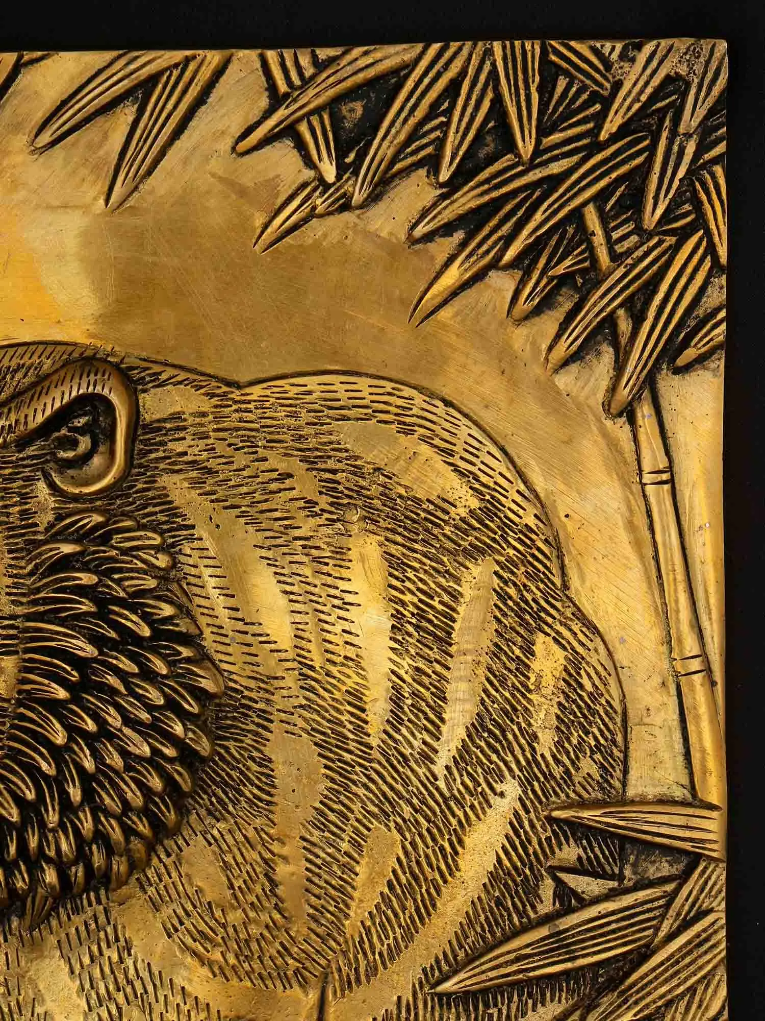 The tiger, a symbol of strength and courage, is depicted amidst lush foliage, hinting at the dense jungle it calls home. Bamboo stalks rise majestically in the background, adding to the authentic jungle atmosphere. The tiger's expression is one of intense focus and raw power, with its mouth slightly open, revealing sharp fangs, suggesting a moment of alertness or a guttural roar. The intricate detailing of its mane and the texture of its fur are rendered with remarkable precision, making this piece a true work of art. The warm, golden hue of the brass enhances the regal presence of the tiger, making it a captivating focal point for any room.