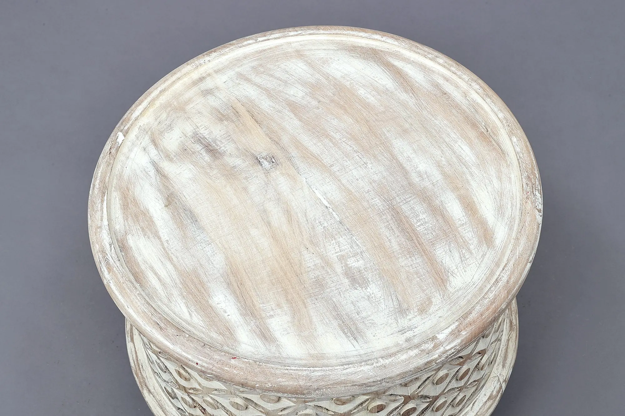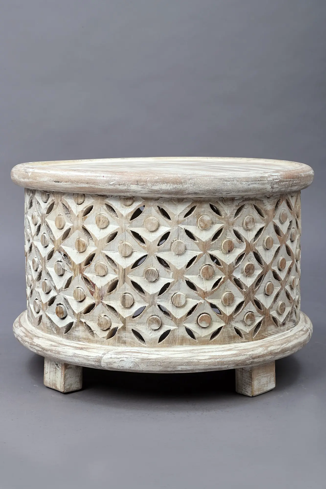 Elevate your decor with the Medium Wooden Lattice Chowki (Pedestal), a fusion of heritage and contemporary charm. Adorned in a captivating rust-white hue, the rough polish imparts a distinct character to this pedestal. The intricate patterns, reminiscent of traditional jaal work used for Jharokhas, are meticulously carved, adding a touch of cultural richness. This piece combines artistic flair with functional versatility, making it a unique addition to any space. Whether as a standalone accent or to showcase cherished items, this pedestal exudes timeless elegance and cultural finesse, inviting admiration for its craftsmanship and aesthetic allure.