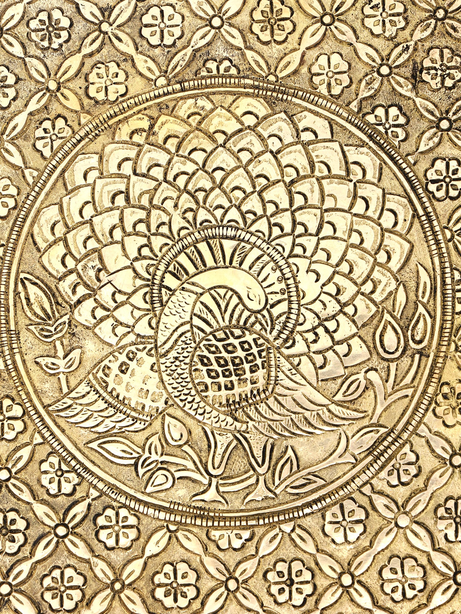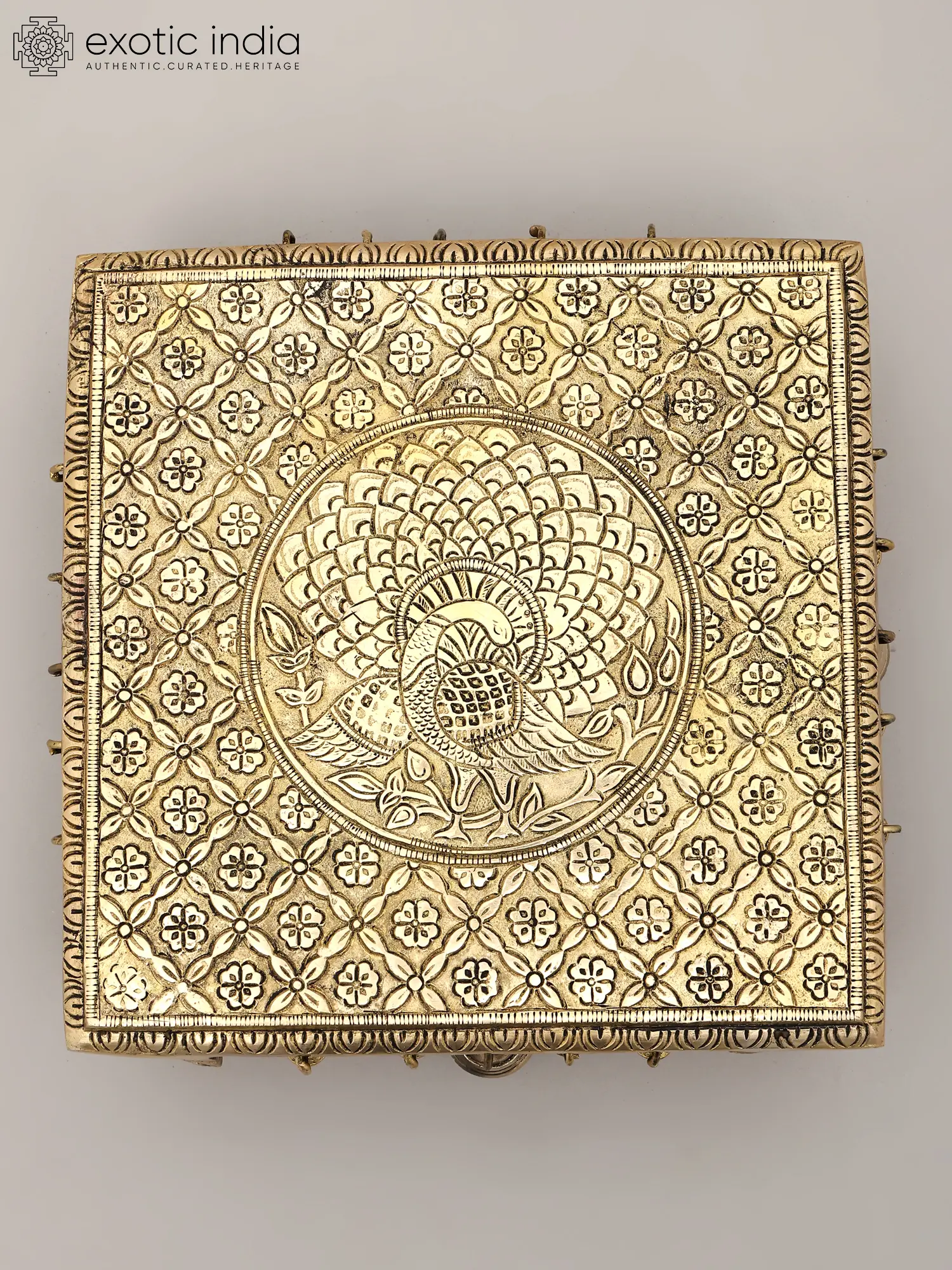 Elevate your sacred space or home decor with this stunning brass chowki, a true testament to artisanal skill and traditional Indian aesthetics. This square-shaped pedestal, designed with meticulous attention to detail, embodies elegance and spiritual significance. Crafted from high-quality brass, it radiates a warm, timeless glow that will enhance any setting. The intricate peacock motif, subtly woven into the design, speaks of beauty, grace, and prosperity, making it a perfect addition for religious ceremonies, deity placement, or as a captivating decorative accent.