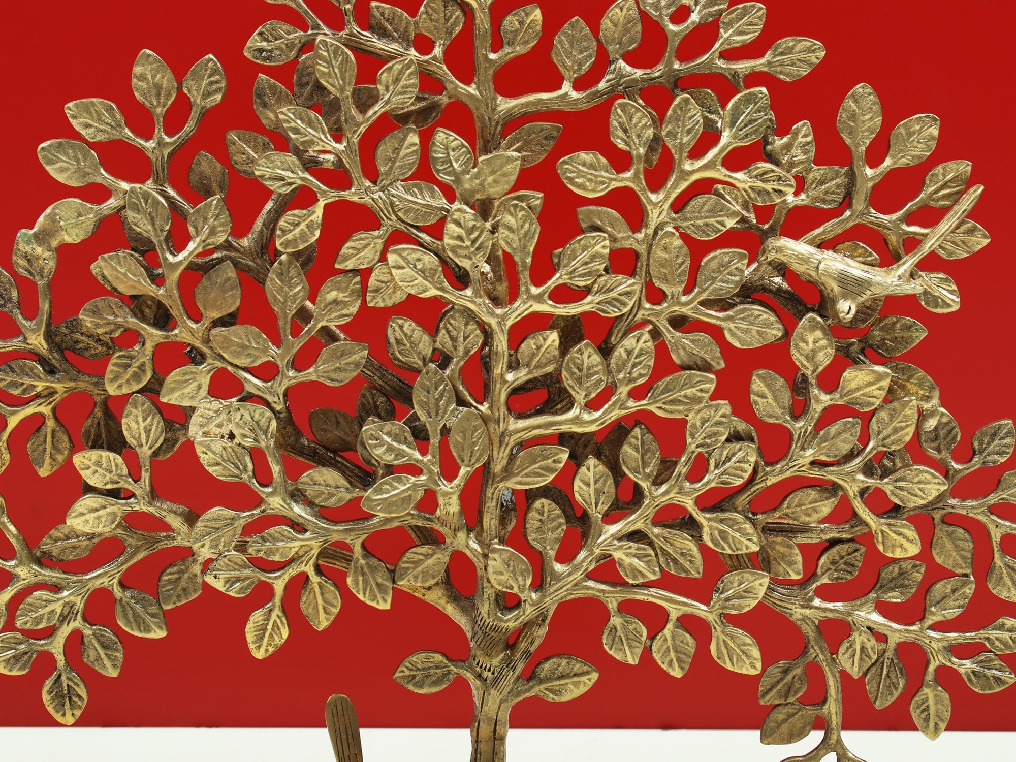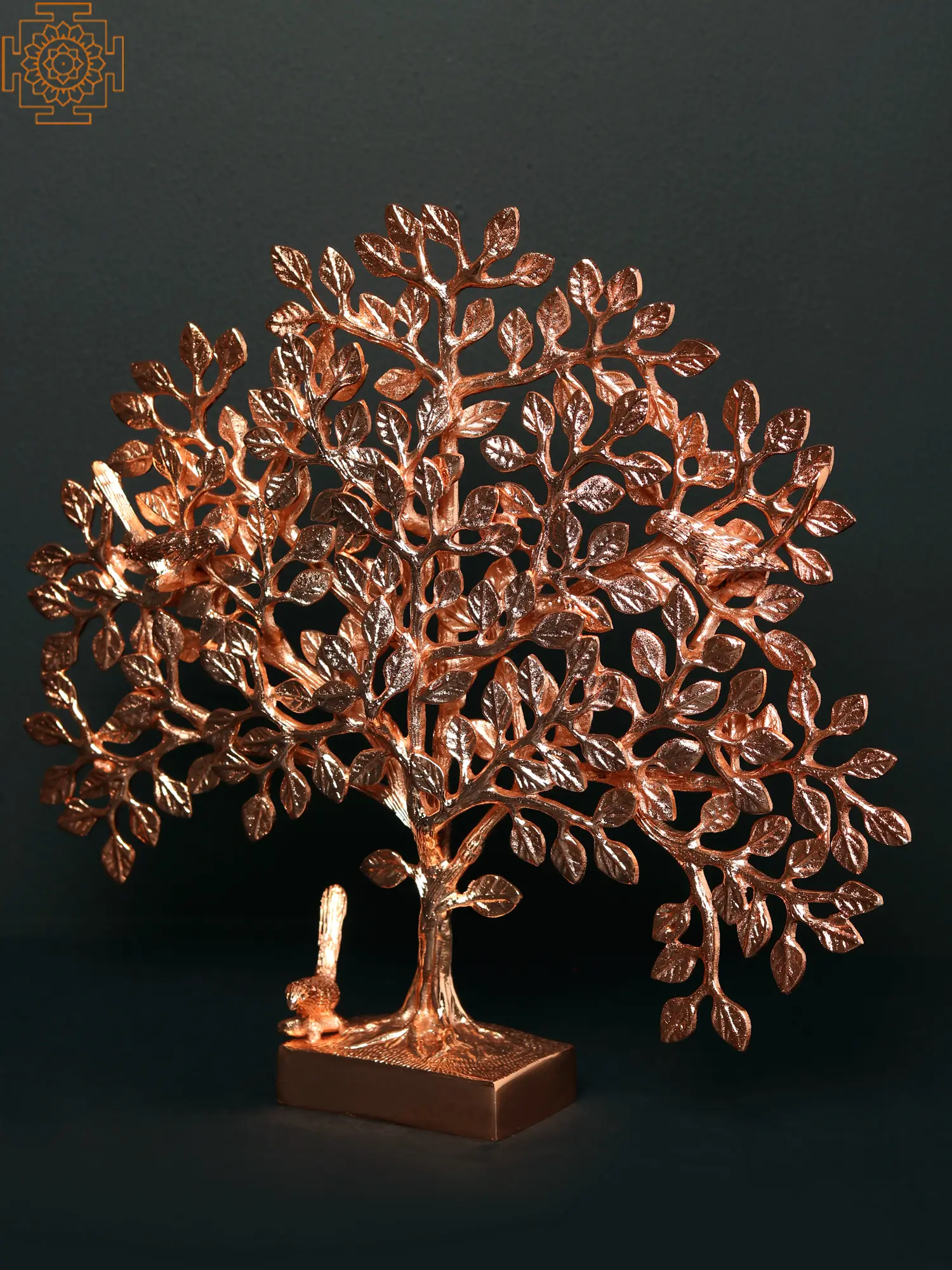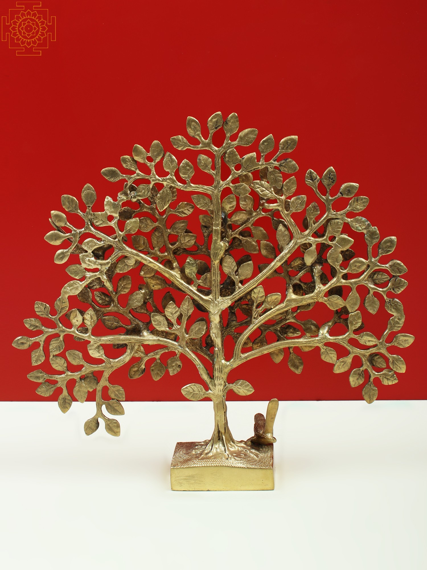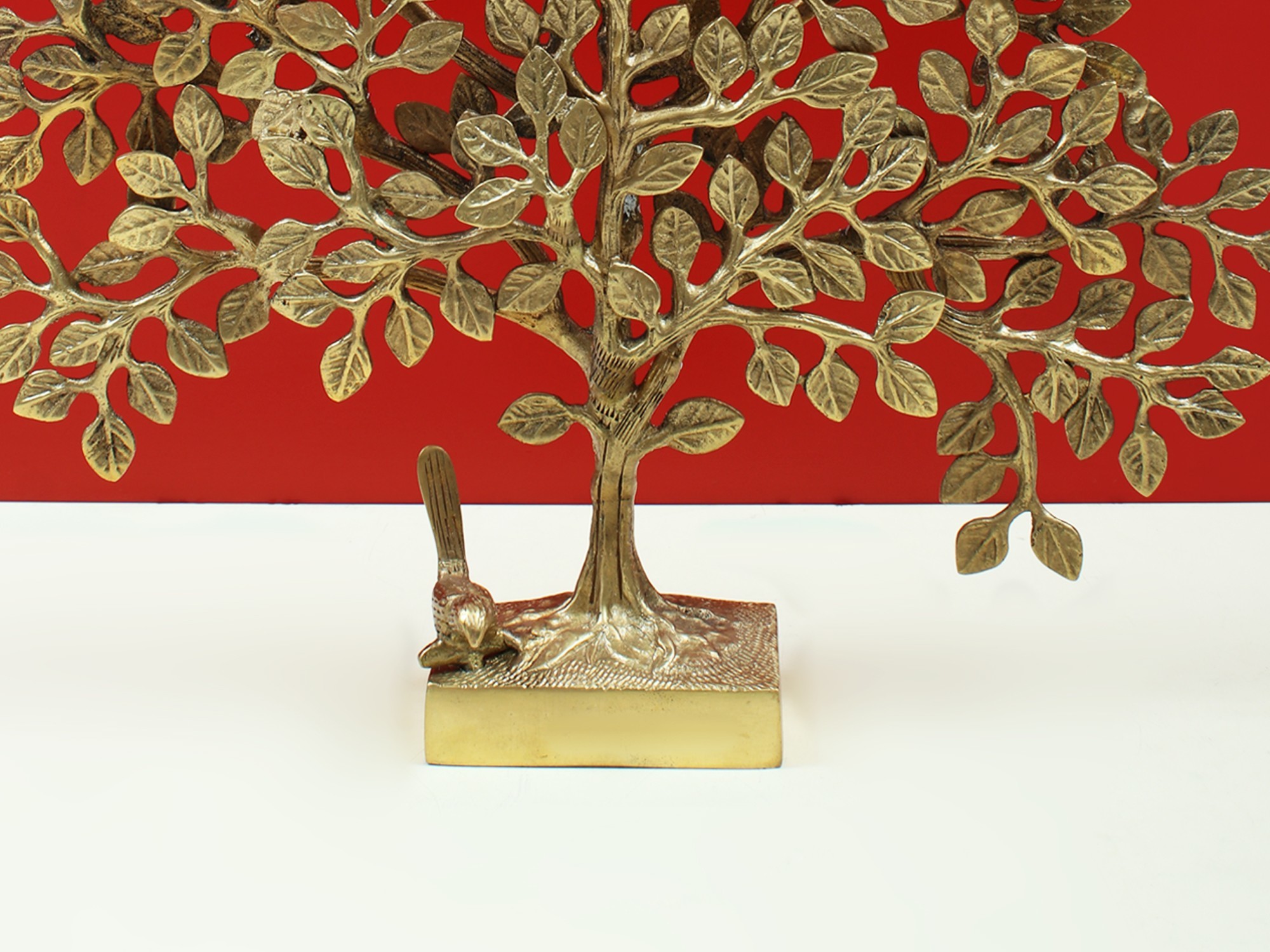 This small brass tree resembling a Plumeria tree or Gour Champa tree, is a simple yet elegant depiction of the beautiful being of a silent tree. The Plumeria or Gour Champa is an auspicious flower generally found in graveyards for its nature of giving peace. The Plumeria is also used for making essence that cures migraine. This home decor piece of the Gour Champa plant is an auspicious and beautiful addition to a space that will bring peace, harmony and spiritual growth. The depiction of two parrots sitting and playing on the tree is a string that connects the metallic art with the nature. Keeping a small Diya or placing a statue alongside it will not only enhance its beauty but also generate some very pious energies.