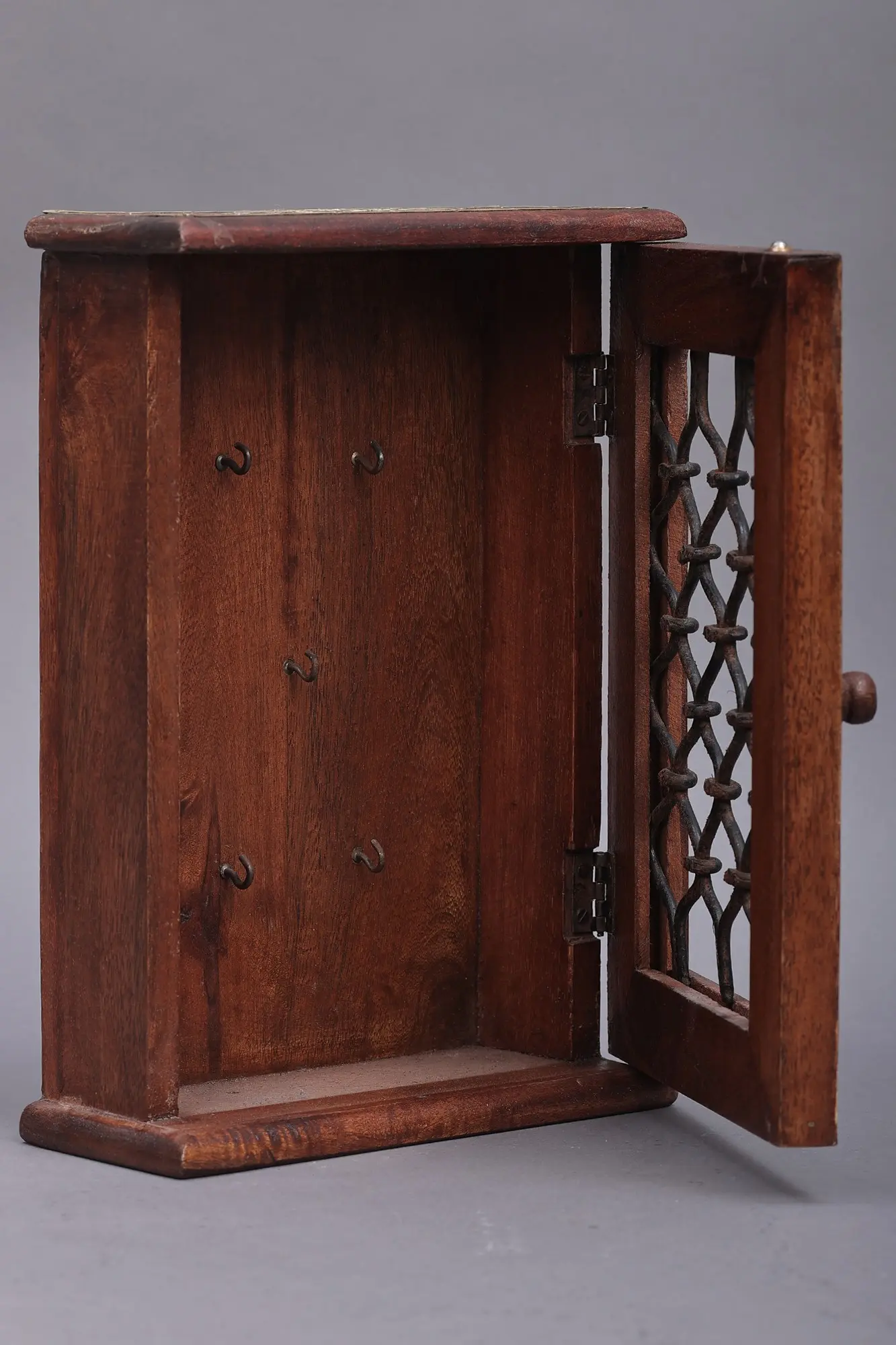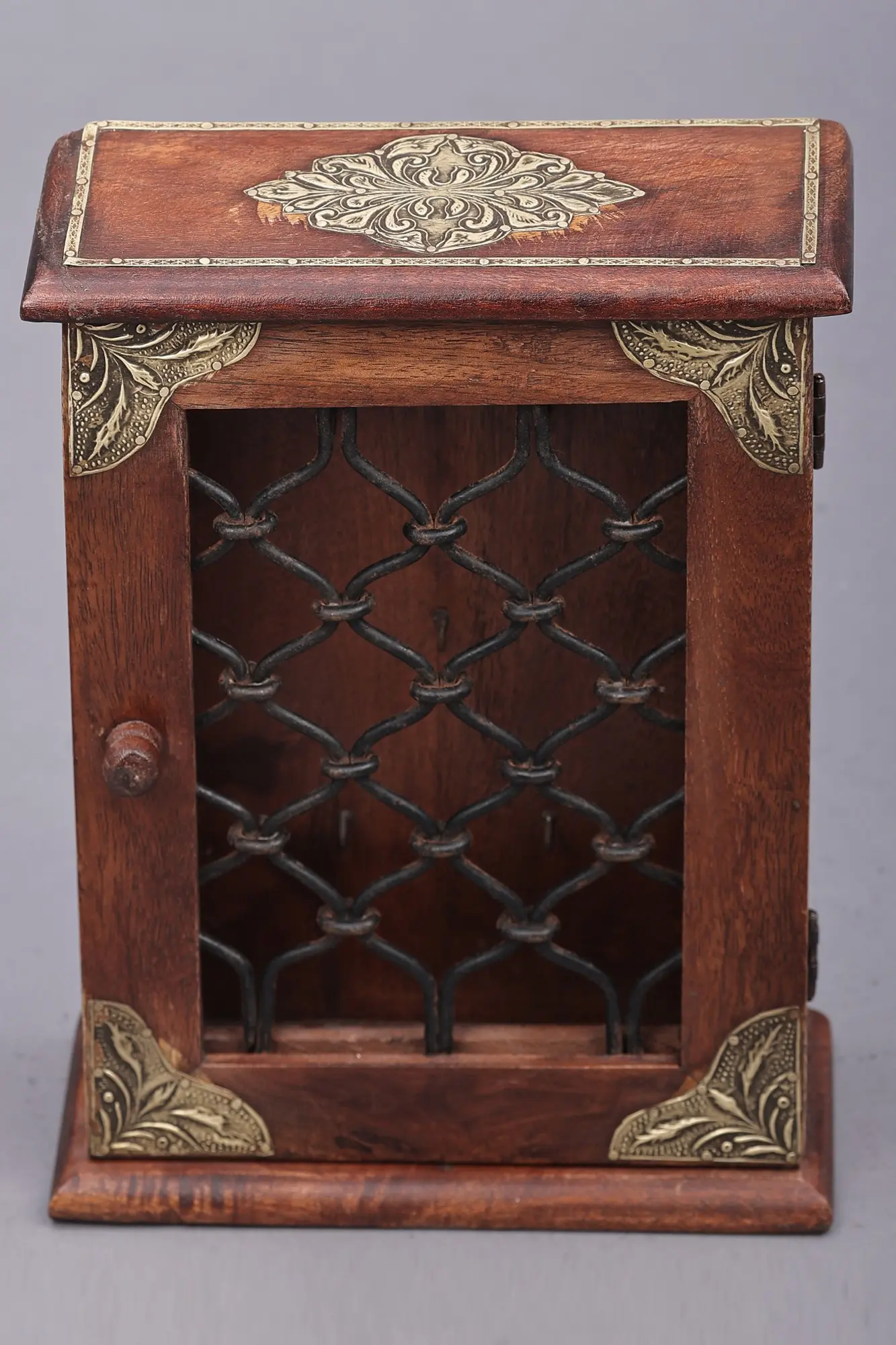 This key holder is more than just a functional item; it's a work of art. Skillfully handcrafted in India, each piece possesses its own unique character. The rich, warm tones of the wood create a welcoming aesthetic, while the intricate brass detailing adds a touch of vintage elegance. The combination of materials provides a sophisticated contrast that will elevate the look of your space. Notice the delicately etched brass corners which enhance the antique look. The woven wire provides a peek inside, creating an inviting and charming detail. The rustic style knob gives a farmhouse touch, adding to the overall beauty of the piece.