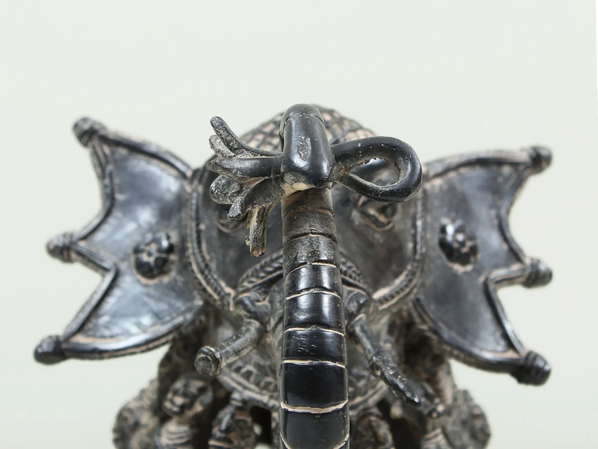This Brass Elephant, crafted in Tribal Dhokra Art, is made keeping the traditional Nari-Gunjara motifs in mind. In the Nari or Nar Gunjara, human figures are utilized to create an animal figurine. It carries a lacquer finish, also known as an artificial patina. The Dhokra art that has been used to create this piece is also associated with a belief system. In Tribal hamlets, animals are considered the base of life, and this shows in this piece.