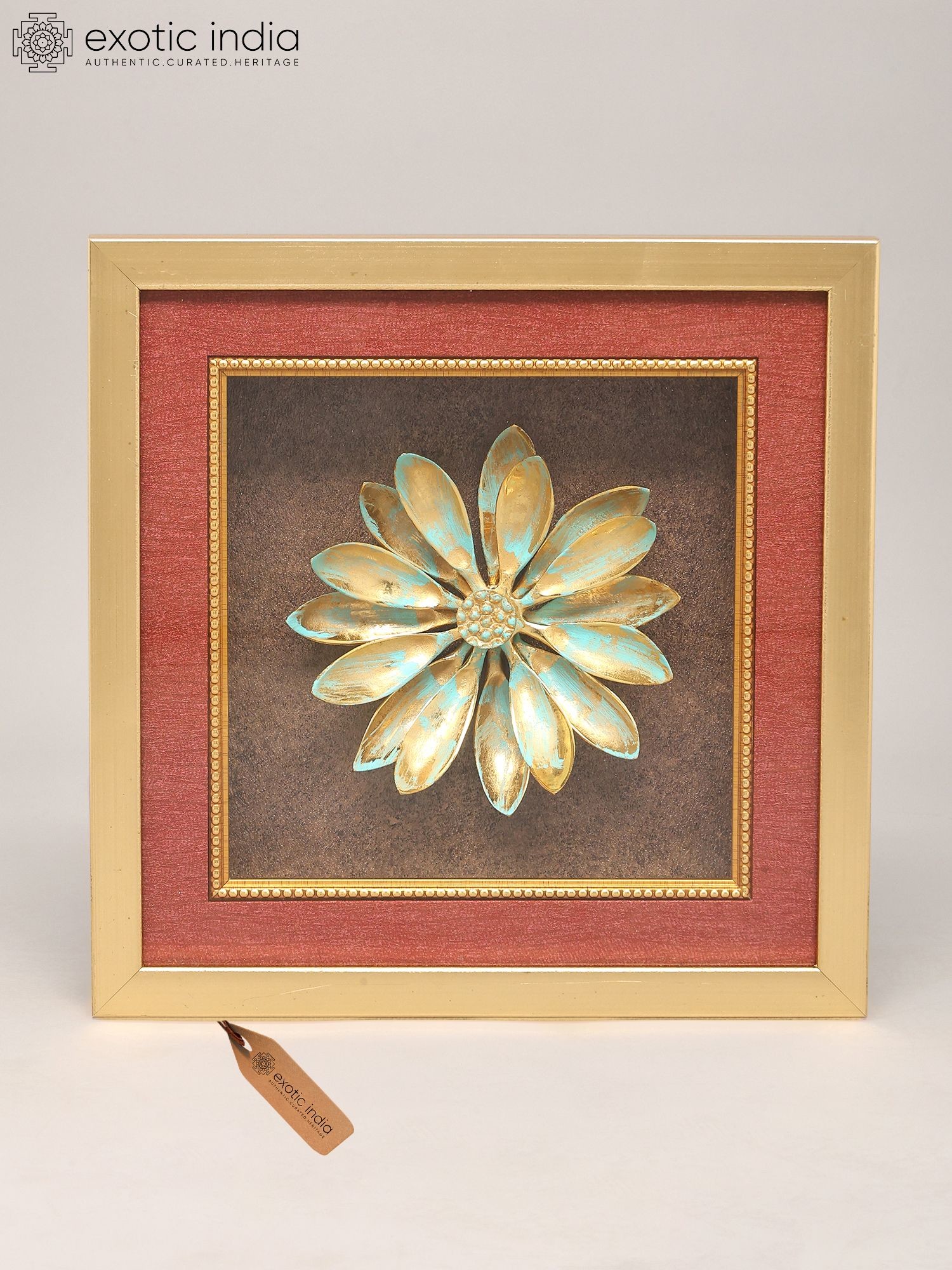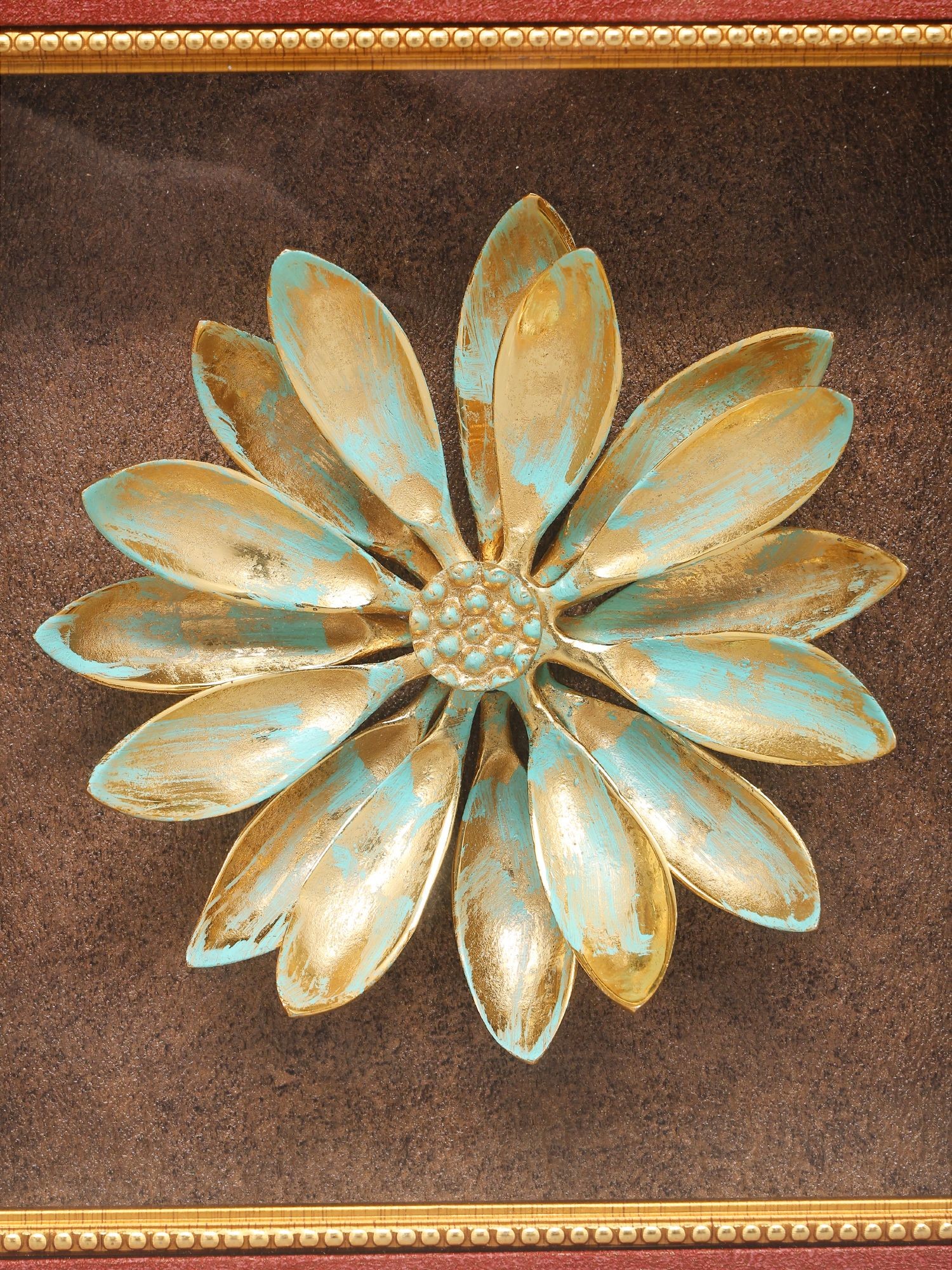 Features a textured gold and turquoise patina finish for visual depth.