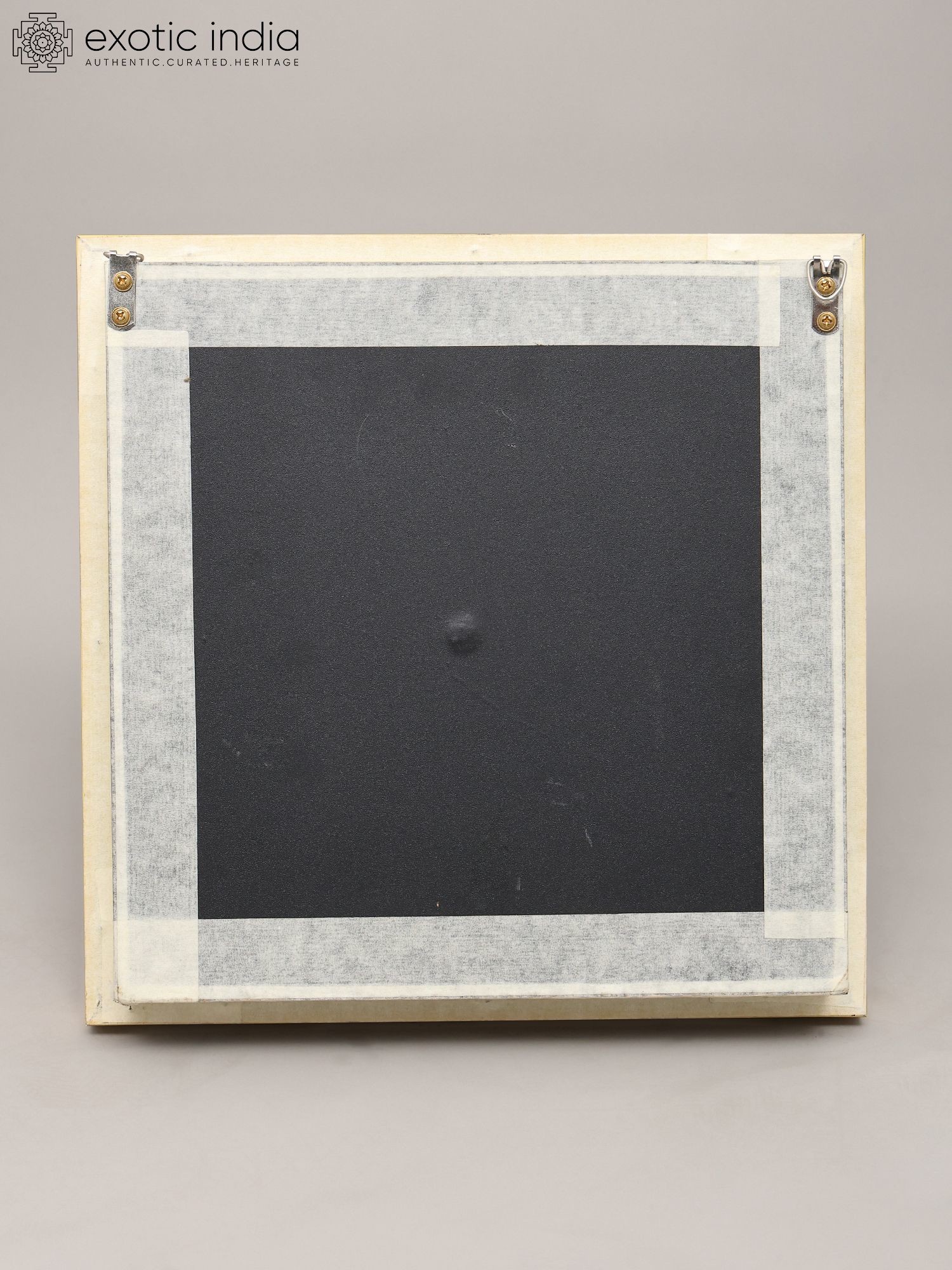 Mounted on a dark brown textured background within a decorative frame.