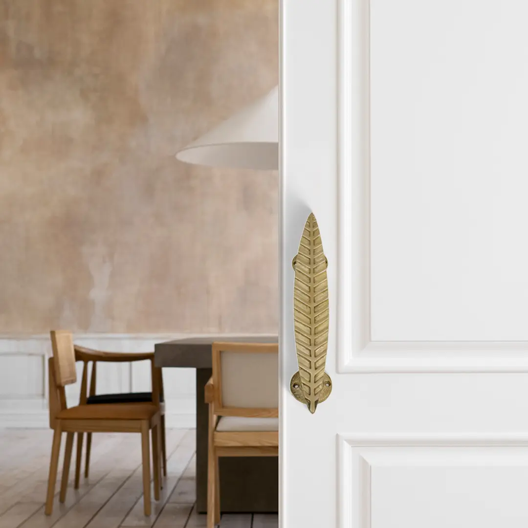 Even the simple, secondary elements in your interiors are an expression of your inner space. With this aesthetically made brass leaf door handle, express your luxuriousness effortlessly. Symmetrical lines all over the handle recreate the veins of the leaf, while delicate incised lines on the fixings bring artistic value to the piece, making it a rich addition to your doors.