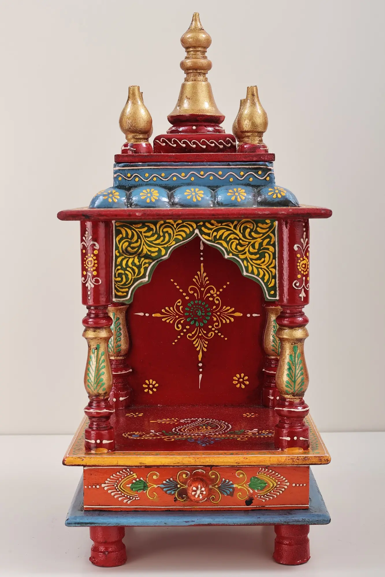 Every element of this temple speaks to the artistry and care that goes into its creation. The base material is Mango wood which is carefully selected for its strength and durability, ensuring that this temple will be a cherished part of your home for years to come. The temple's form features elegantly carved pillars that support the structure, complemented by a multi-tiered roof adorned with decorative finials that add a touch of grandeur. The attention to detail is apparent in every curve and flourish, making it a truly special object.