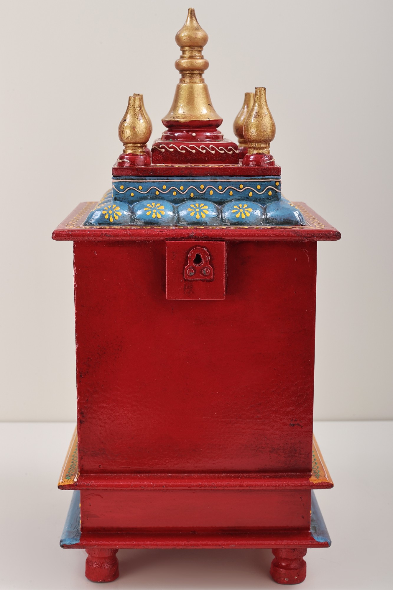 The temple is painted in a rich and harmonious palette, making it stand out. The base is primarily painted in a deep red which is a color that has deep associations with good fortune and festivity. Interwoven throughout the structure are intricate floral and paisley motifs, rendered in hues of gold, green, blue, and white. The colorful artwork enhances the structure and adds a joyful and optimistic feel. The combination of colors and patterns creates a visually stunning effect, reflecting the rich artistic heritage of India.
