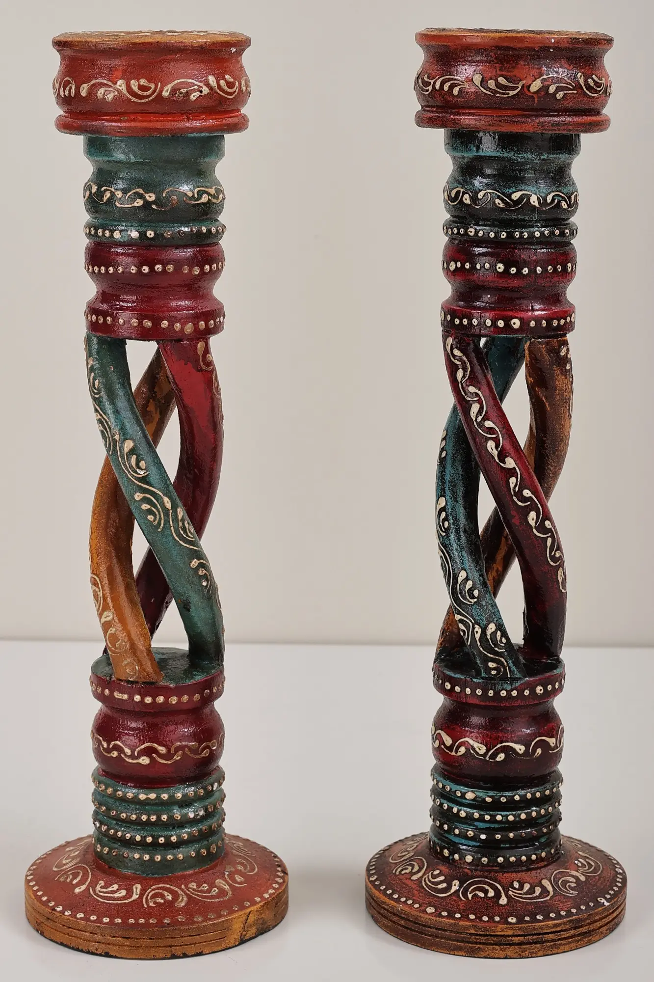 Candle stands are beautiful utility objects invented to accommodate the messengers of wisdom- candles. This Decorative, Colorful Candle Stand pair is no different. The stem, resembling a captivating coiled structure, weaves three wooden tubes spiraling in harmony. Circular bases and tops provide stability and symmetry to the design. Painted in an array of bright colors, this pair is a testament to eclectic aesthetics. Each piece seamlessly combines form and function, creating a captivating visual impact. Elevate your ambiance as the swirling design and lively colors transform these candle stands into dynamic focal points, casting a warm and artistic glow into your living space.