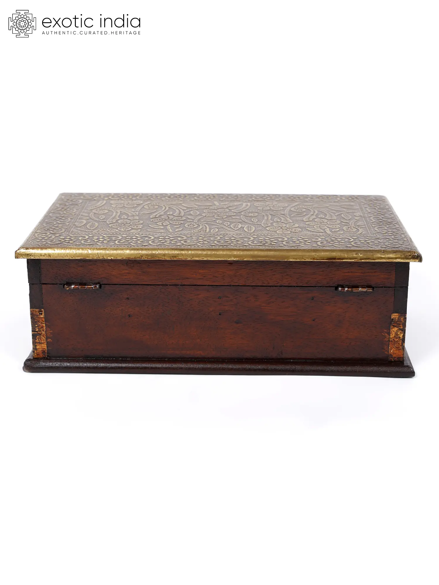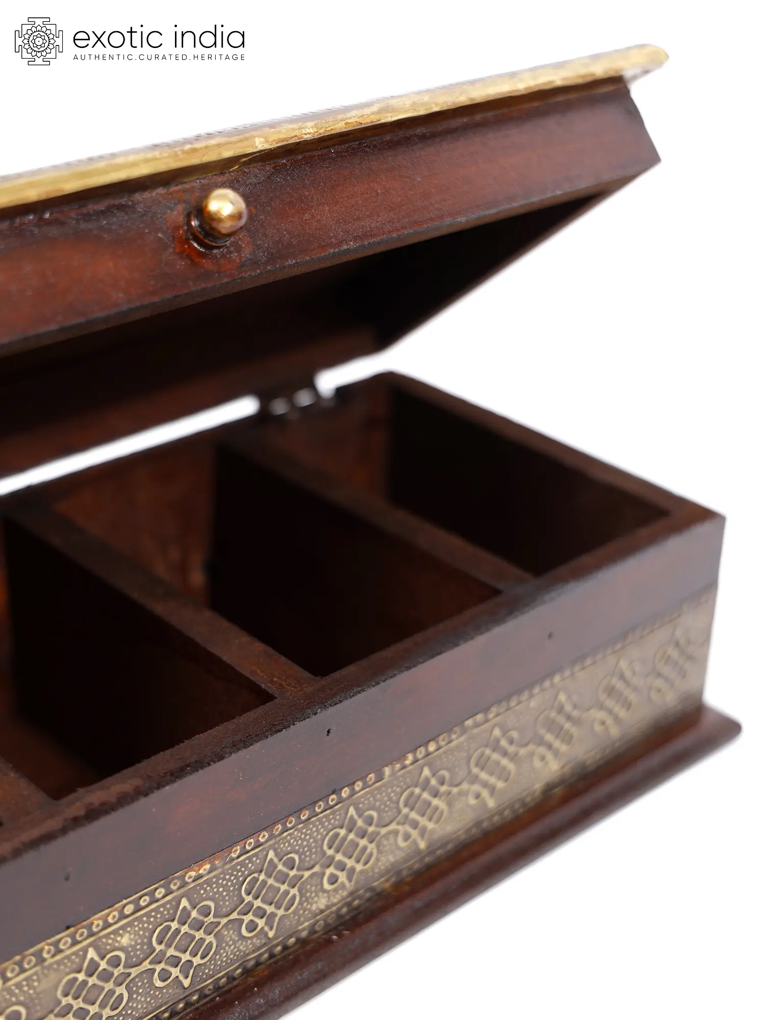 Brass embossing is a significant art form, showcasing intricate craftsmanship and cultural heritage. This Designer Wooden Tea Bag Box with Brass Work beautifully exemplifies this technique. The lower portion features Kollam patterns, traditional motifs rich in symbolism and tradition, adding cultural depth. Meanwhile, the lid boasts exquisite floral motifs, enhancing its elegance.