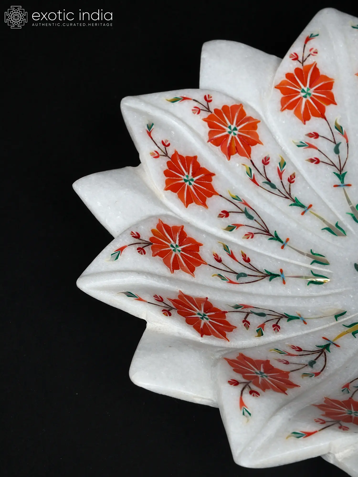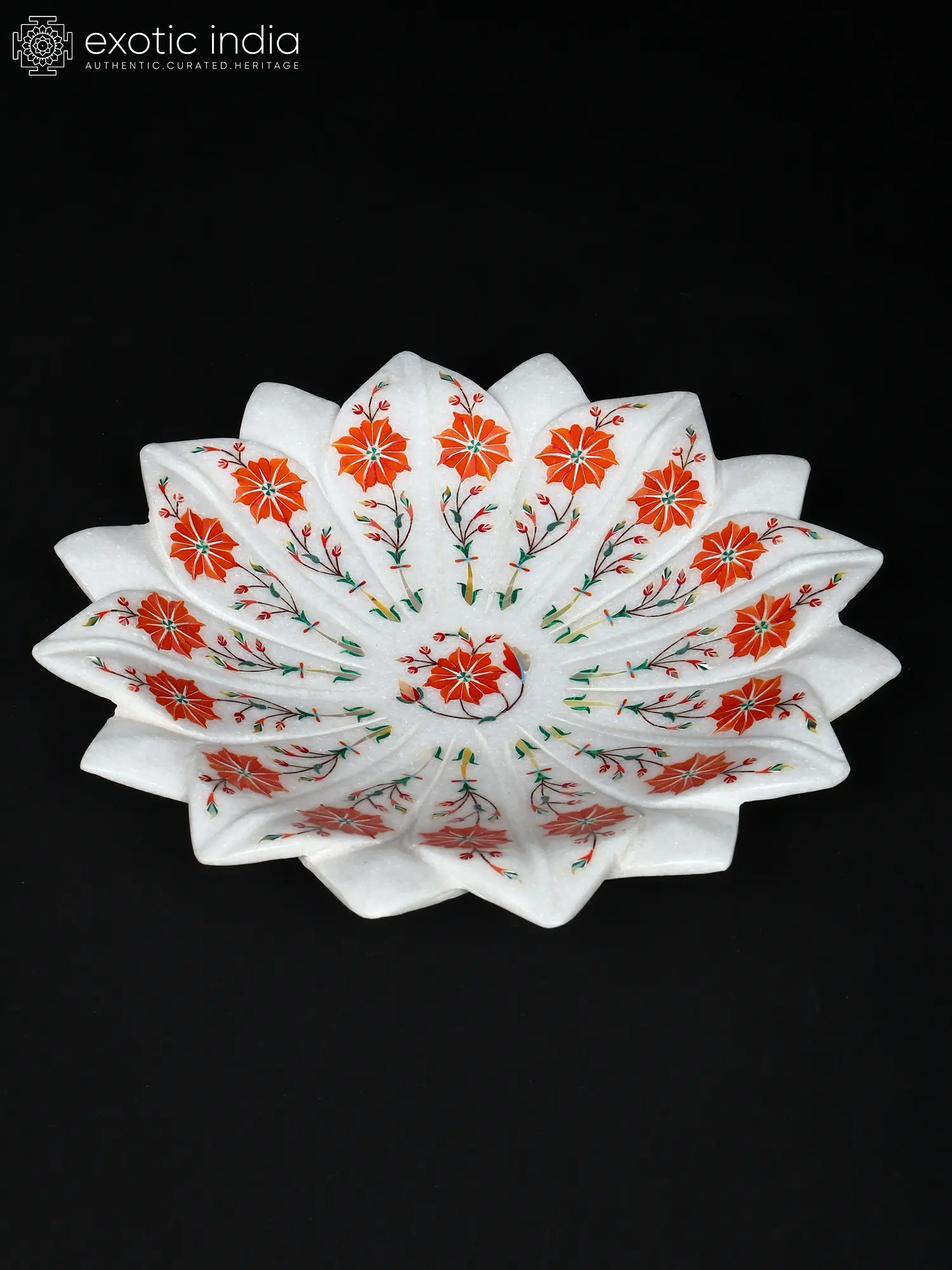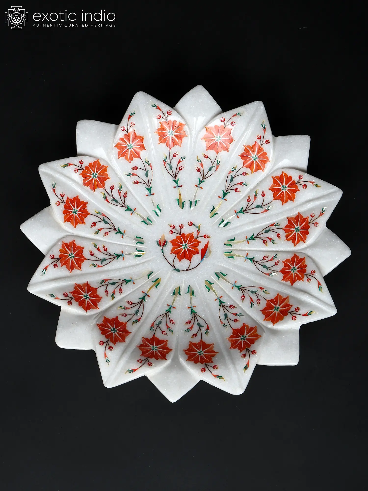 Its form mimics the delicate unfolding of a lotus flower, gracefully shaped to present a captivating visual experience. The generous twelve-inch diameter ensures it commands attention, while the subtle one-and-a-half-inch height allows it to rest elegantly without overpowering its surroundings. You'll be drawn to the harmonious blend of the pristine white marble and the vibrant floral motifs, each petal adorned with meticulously inlaid semi-precious stones that add depth and character. This piece is not merely decorative; it's a sculpted work of art.