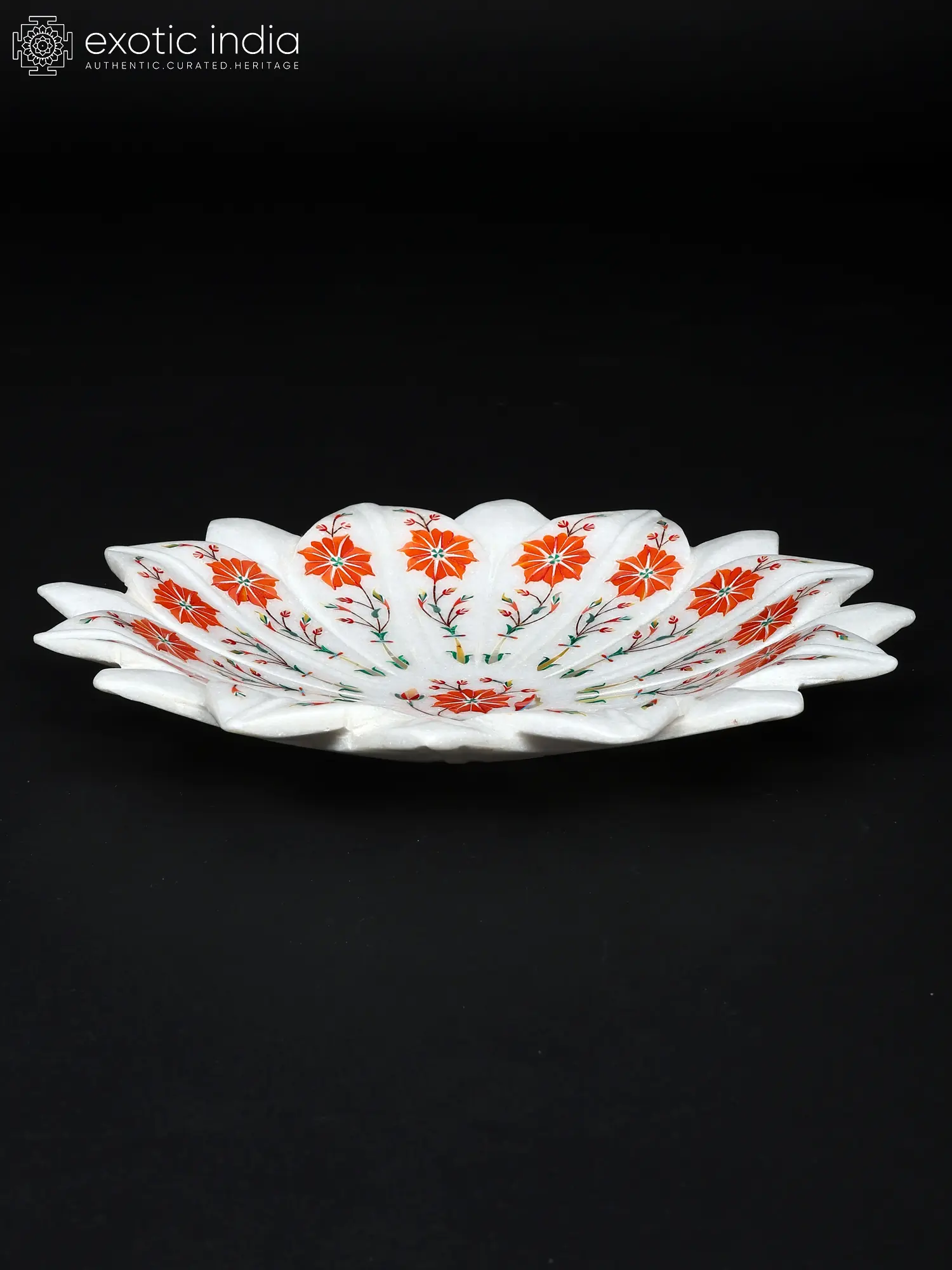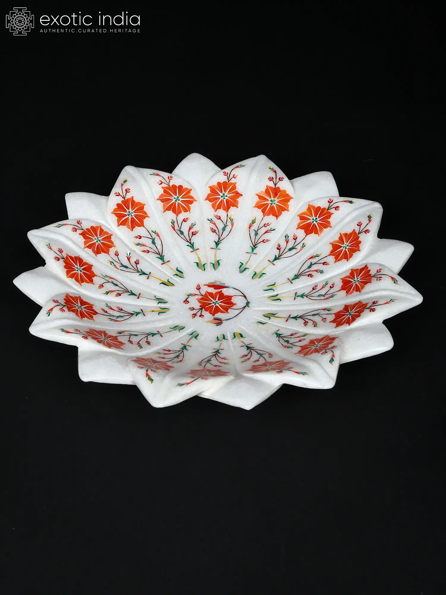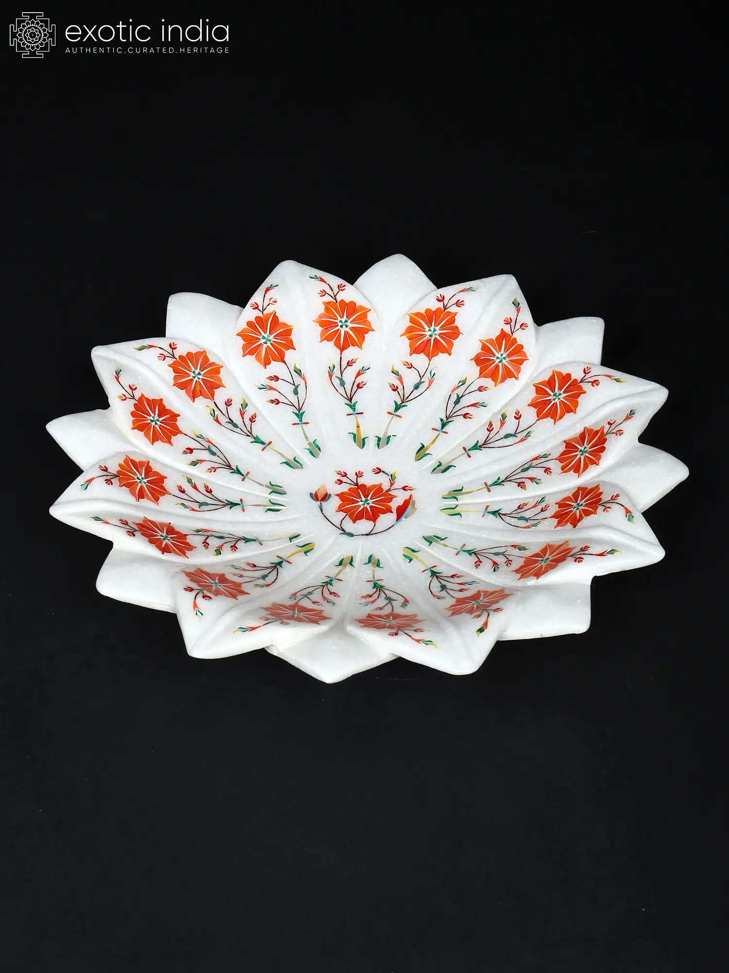 Its form mimics the delicate unfolding of a lotus flower, gracefully shaped to present a captivating visual experience. The generous twelve-inch diameter ensures it commands attention, while the subtle one-and-a-half-inch height allows it to rest elegantly without overpowering its surroundings. You'll be drawn to the harmonious blend of the pristine white marble and the vibrant floral motifs, each petal adorned with meticulously inlaid semi-precious stones that add depth and character. This piece is not merely decorative; it's a sculpted work of art.