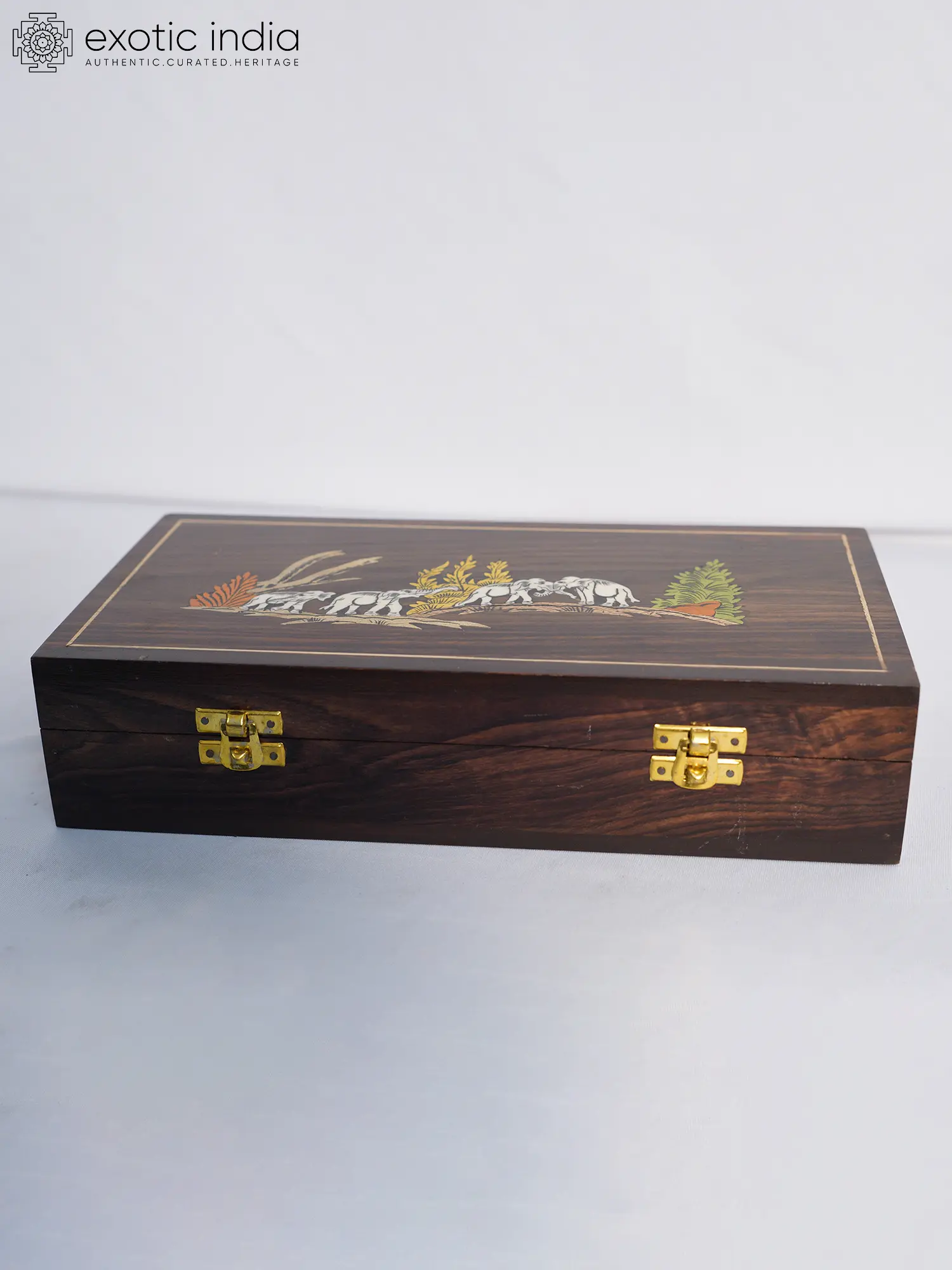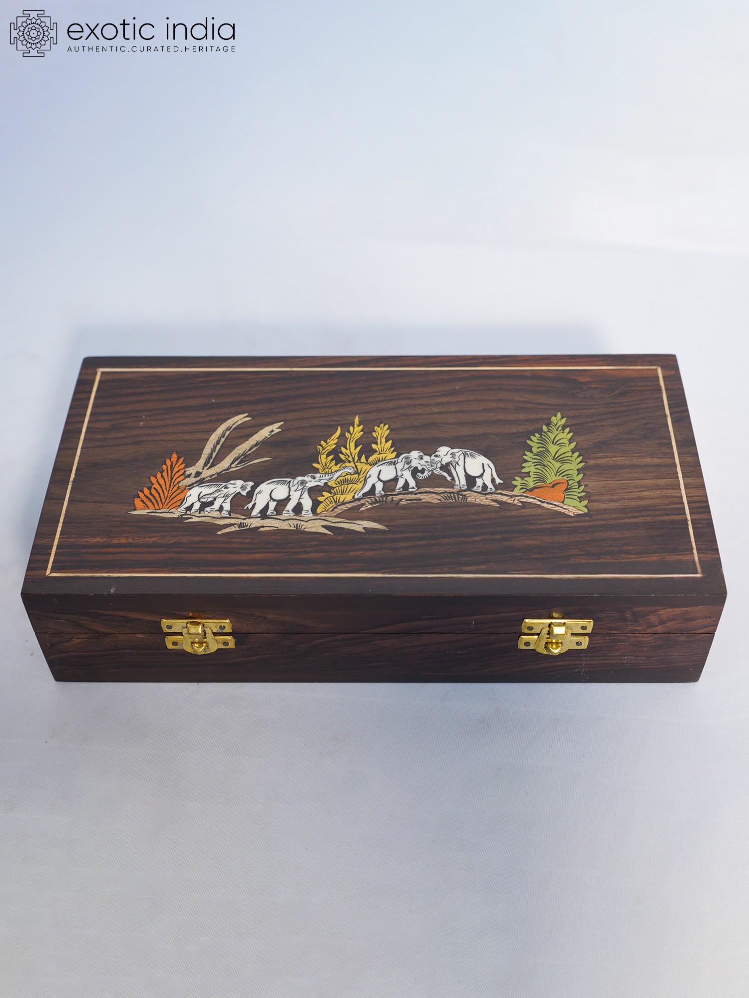 5" Roaring Elephants Wood Jewellery Box With Inlay Work