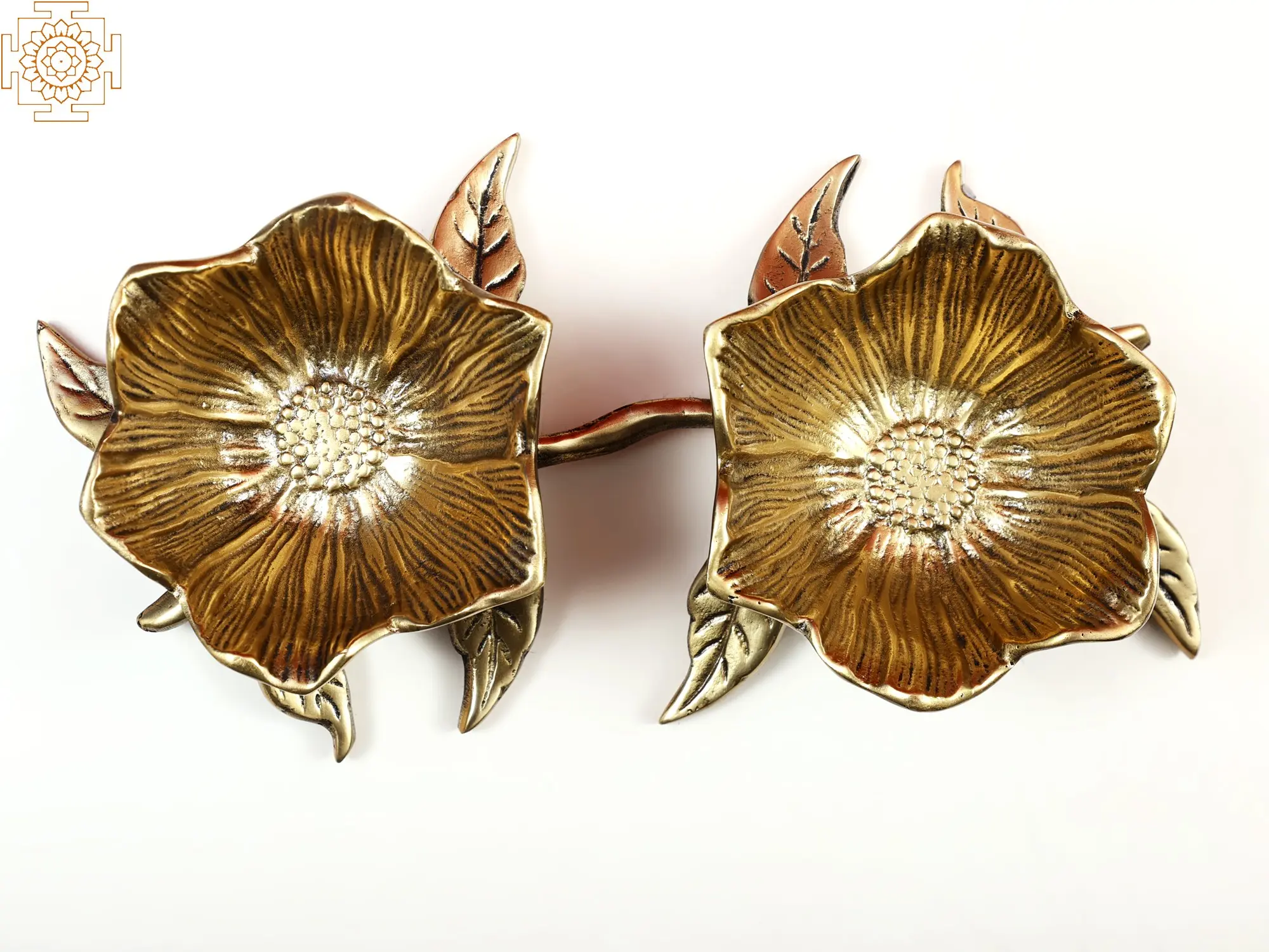 Elevate your home decor with this exquisite pair of handmade brass bowls, meticulously crafted to resemble blooming lotus flowers. Each bowl is artfully supported by a delicate brass branch adorned with intricately detailed leaves, creating a captivating display that brings the beauty of nature indoors. The warm, golden hue of the brass adds a touch of timeless elegance and sophistication to any setting.