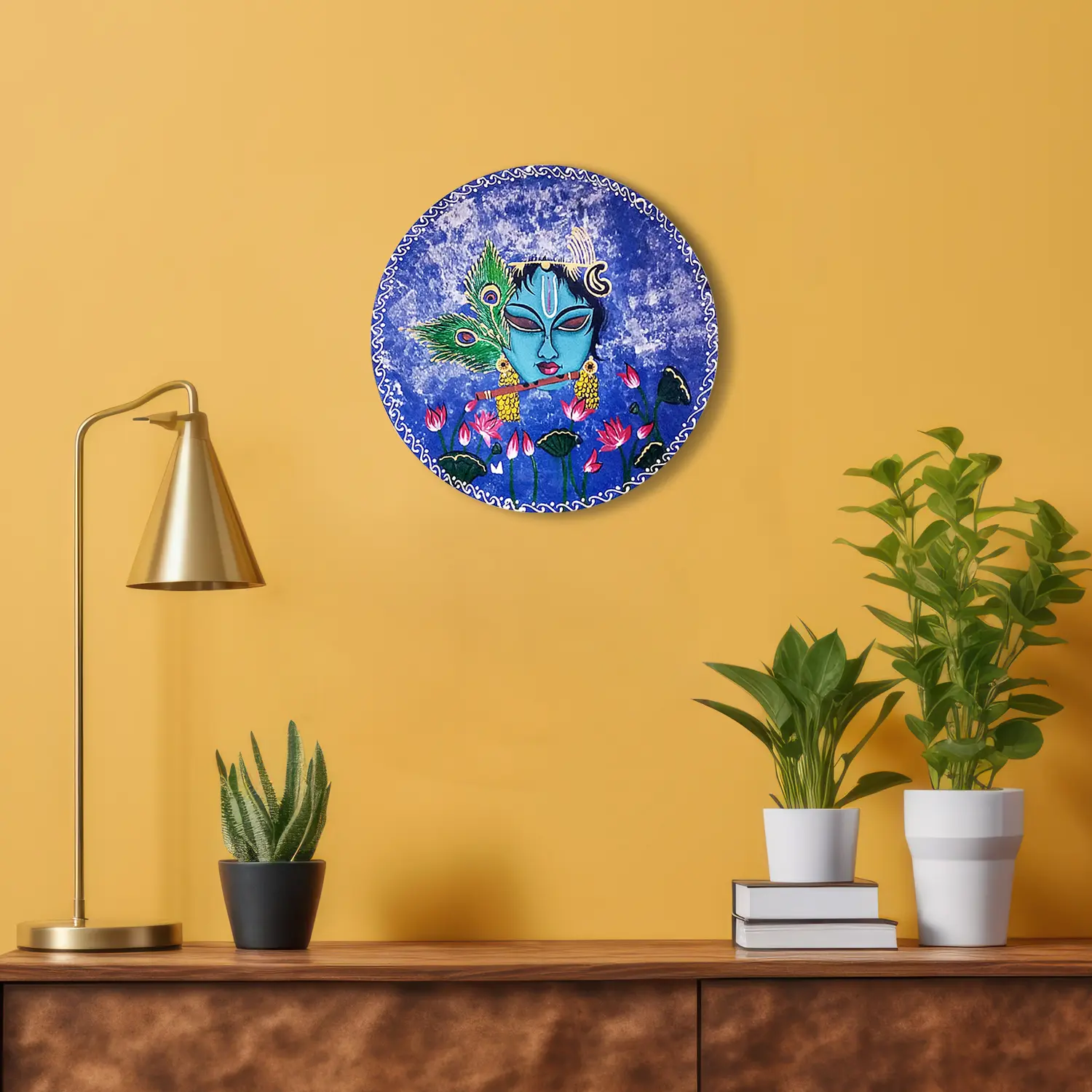 This folk-art piece transcends mere decoration, serving as a divine focal point for homes. The fusion of cultural richness and artistic finesse makes it not just a wall plate but a visual ode to the cosmic melody played by Lord Krishna, resonating with spiritual and aesthetic harmony.