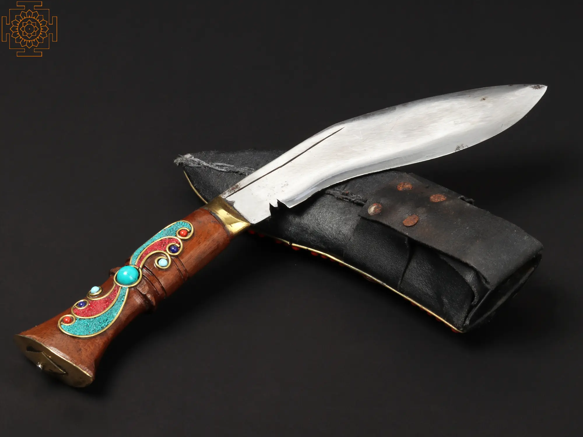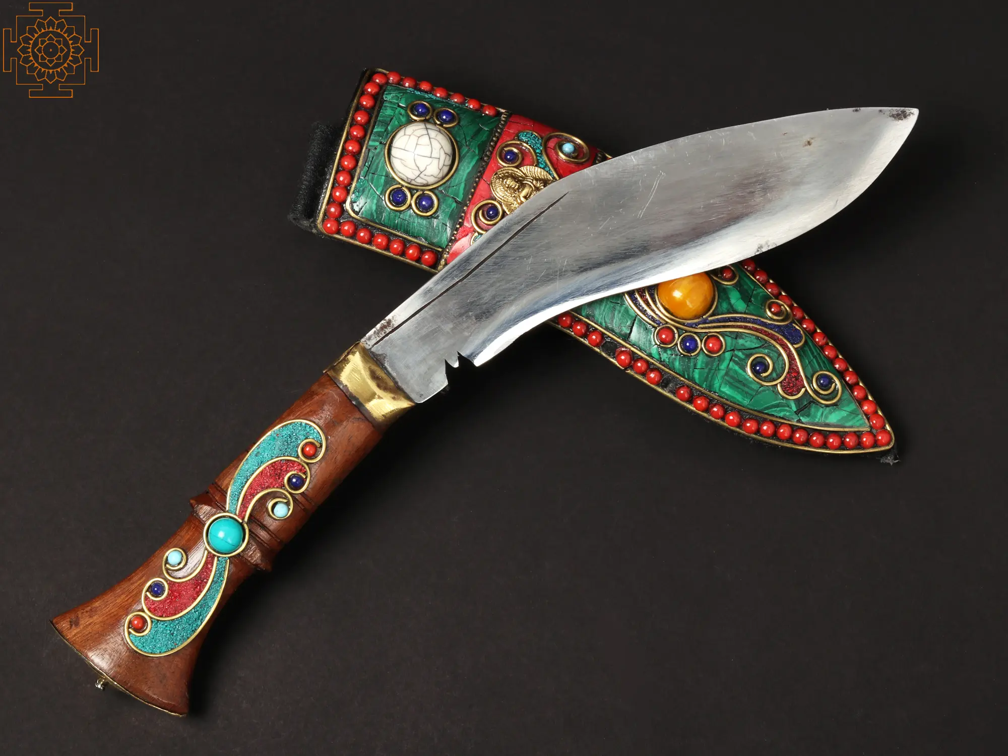 It has an inlay decoration on the handle and the cover. The excellent use of deep green lapiz lazuli along with red stones increases the vibrancy of the piece. There is a small Buddha statue on the cover of the Kukri that symbolizes protection. This Kukri is not only a weapon but also a legacy that can be passed down to generations.