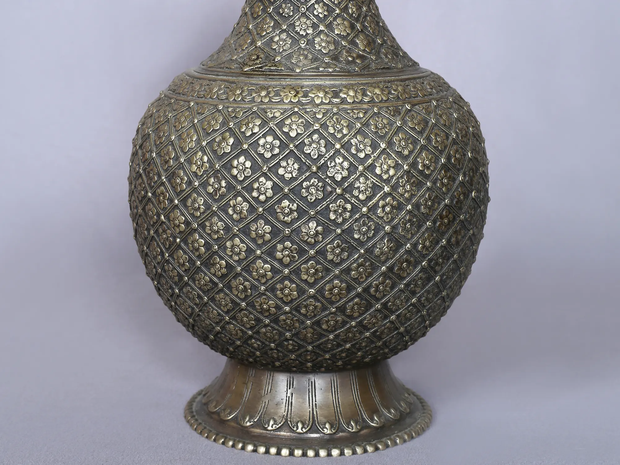 The surface of this remarkable vase is adorned with a stunning, all-over floral pattern. Tiny, perfectly formed flowers are set within a delicate diamond lattice, creating a mesmerizing texture that draws the eye and invites admiration. This detailed ornamentation speaks to the patience and skill of the artisans who brought this piece to life. The motifs are deeply ingrained, showcasing the quality of the metalwork and the dedication to preserving ancient artistic traditions. The slightly antique patina further enhances its charm, hinting at stories and histories from the land of the Himalayas.