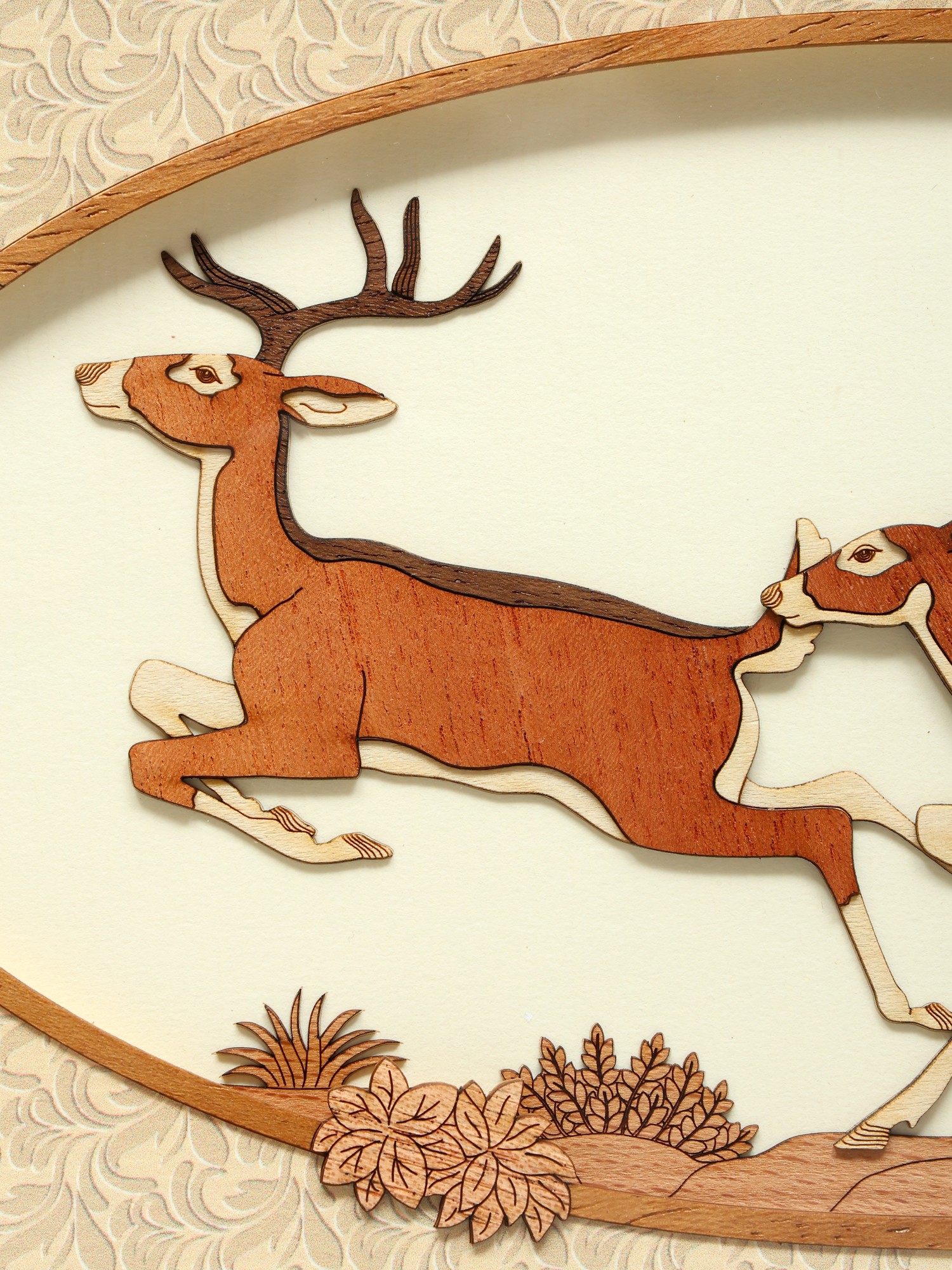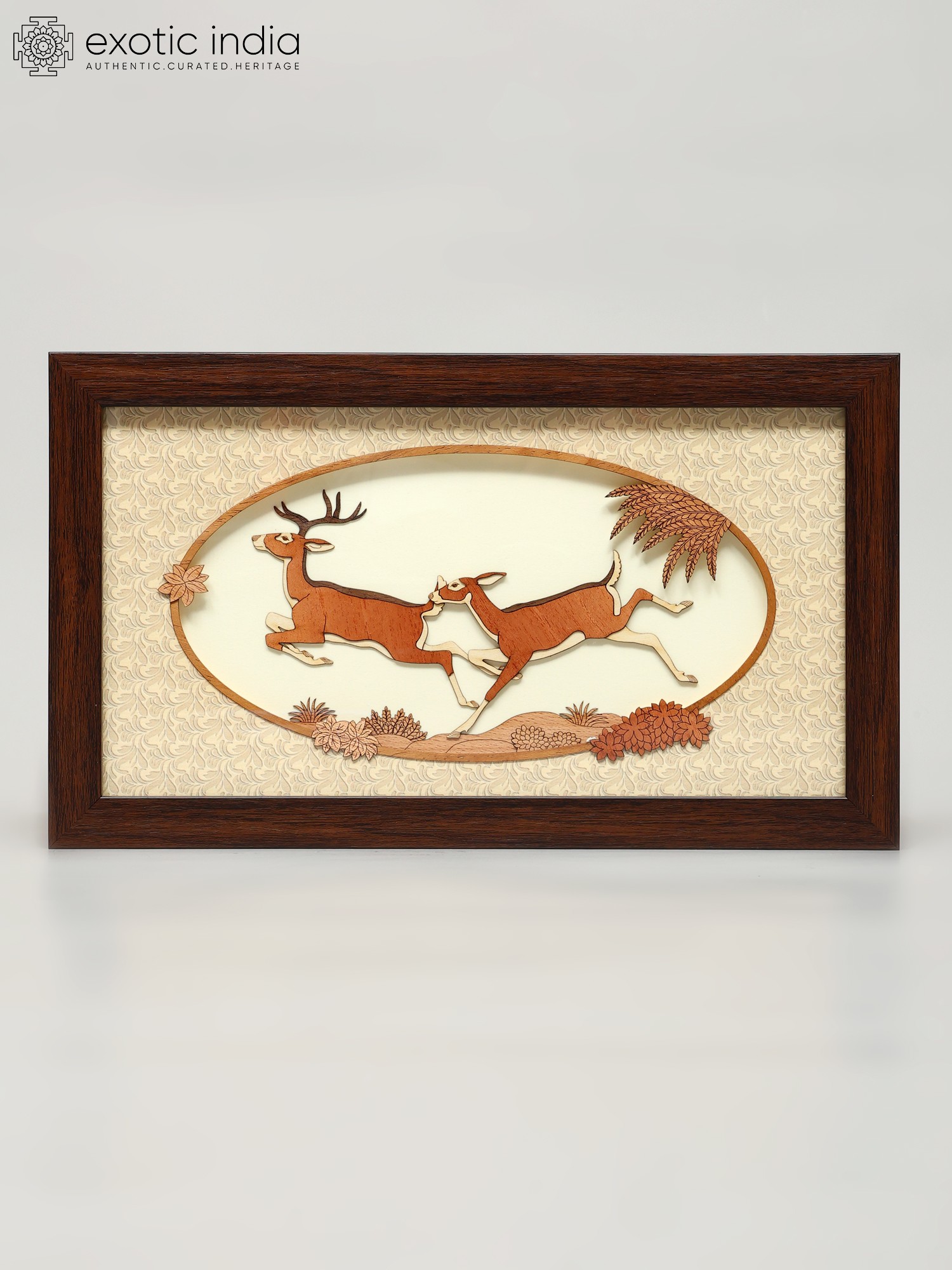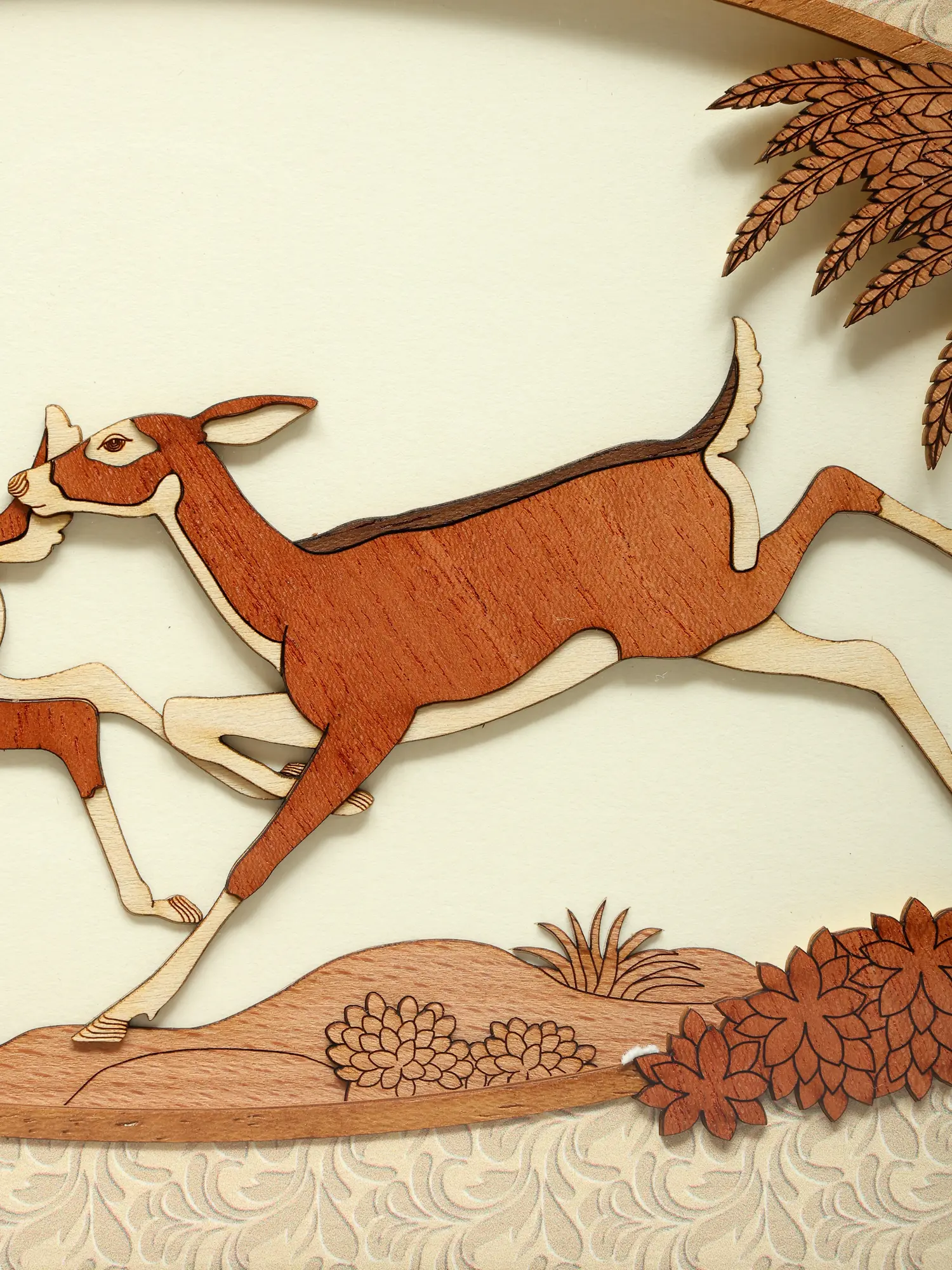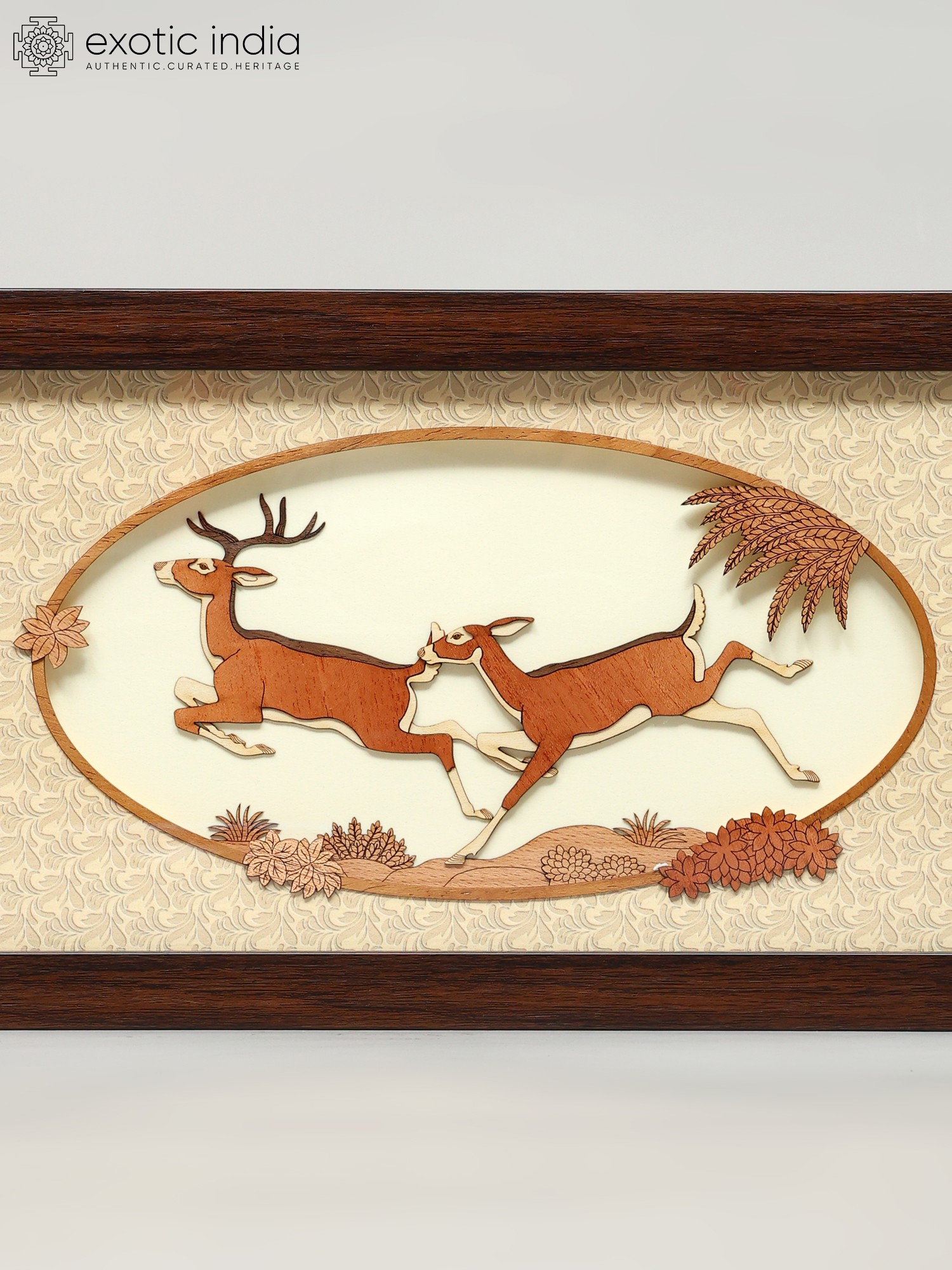 12" Running Deers | Wood Carved Frame | Wall Hanging