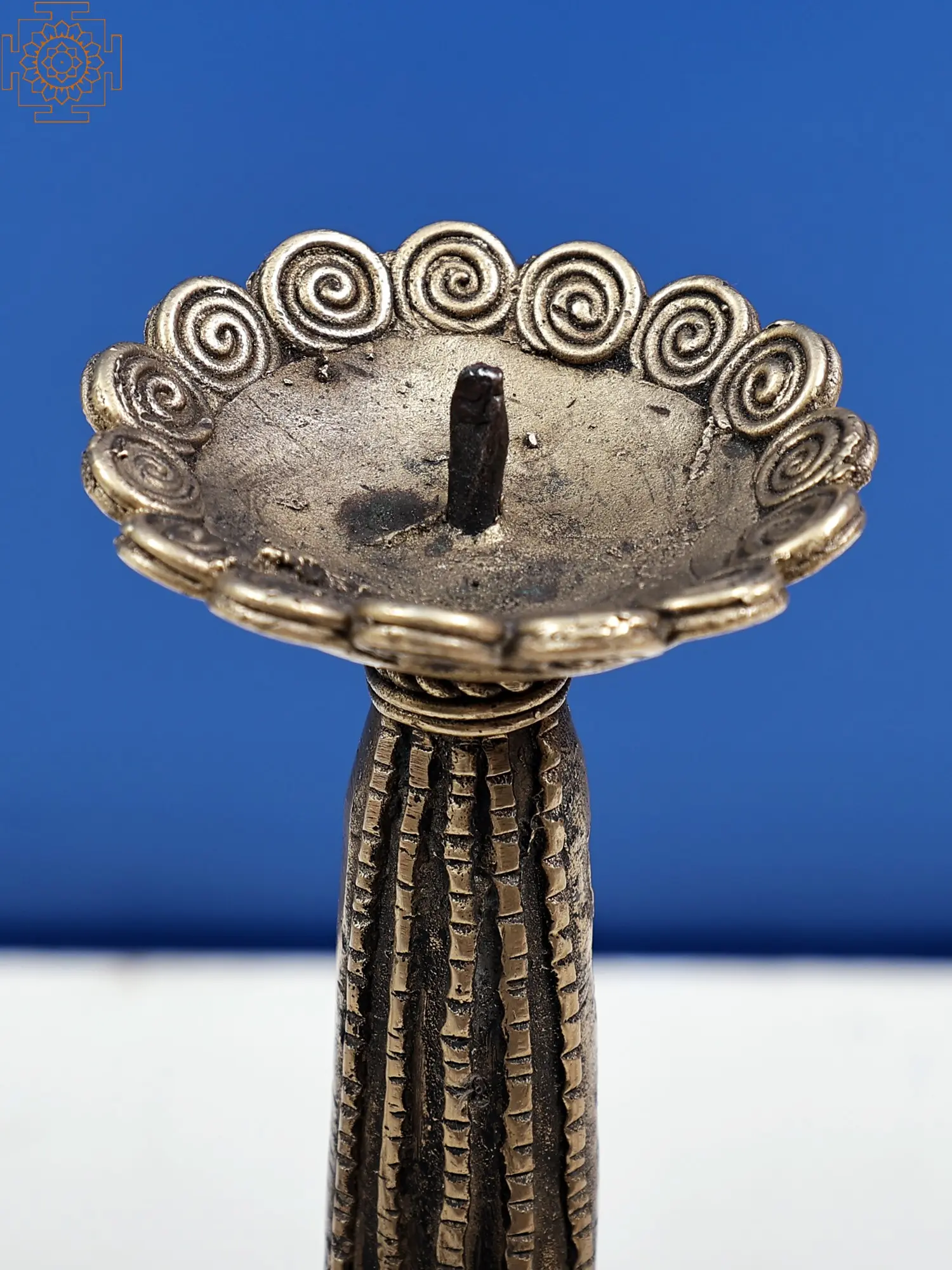 The Tribal Candle Stand, crafted from brass, is a mesmerizing piece that combines functionality with artistic expression. Resembling a lotus atop a straight stem merging into a human head, it features two figures on either side playing musical instruments. The Dhokra style, characterized by its traditional lost-wax casting technique, adds a rustic charm to the piece.