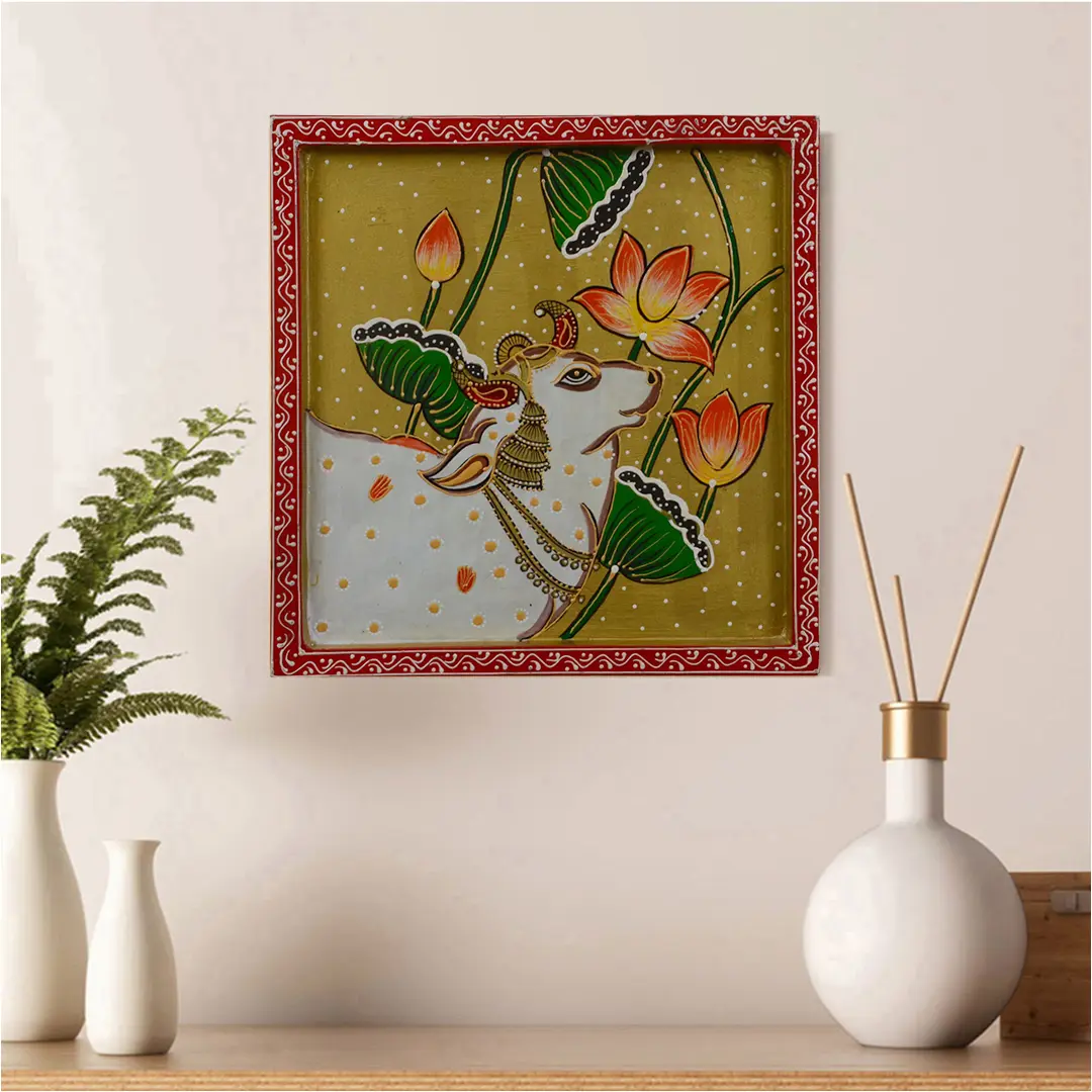 This “Pichwai artwork,” a hand-painted wooden folk masterpiece, will enchant your living space with its ethereal charm. Pichwai art is a traditional form of painting that began in the village of Nathdwara in Rajasthan, India. This magnificent wall plate surpasses conventional design; rather, it is a doorway to serenity, invoking a sense of heavenly beauty.
