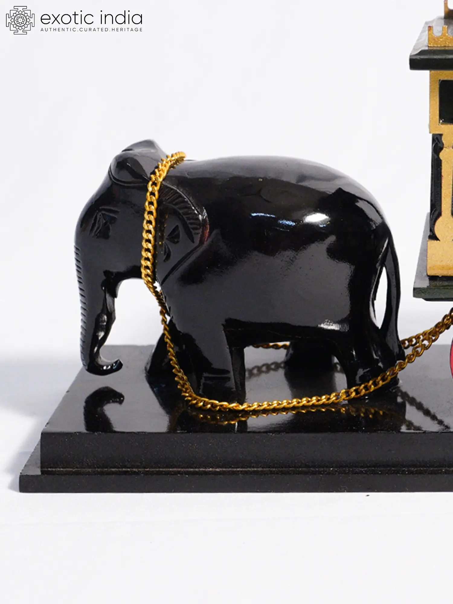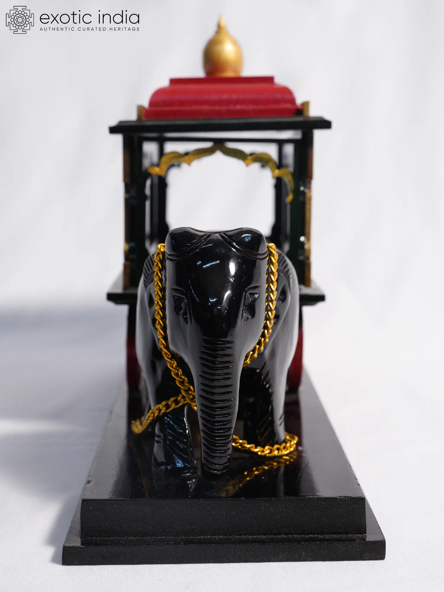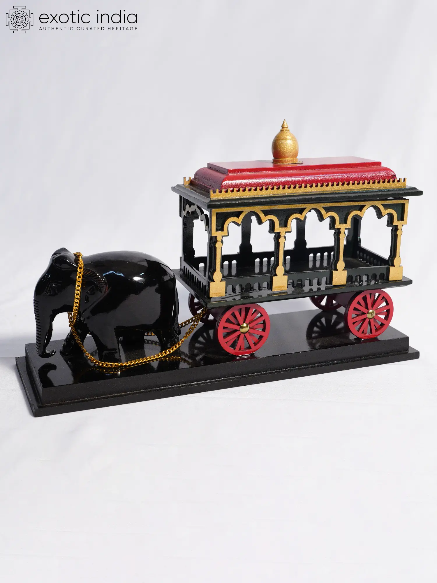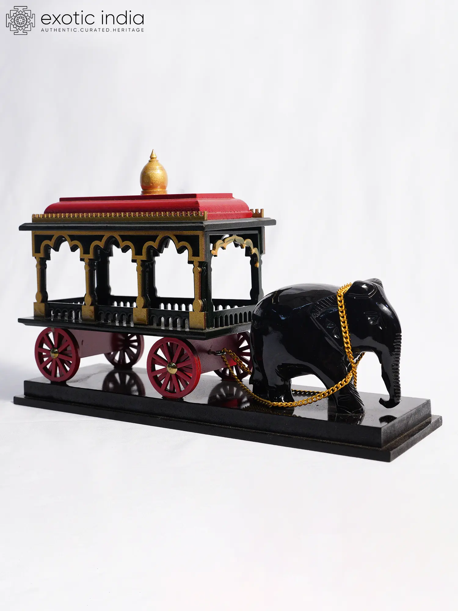 Features a detailed rosewood sculpture of an elephant pulling an ornate cart, inspired by ceremonial processions.