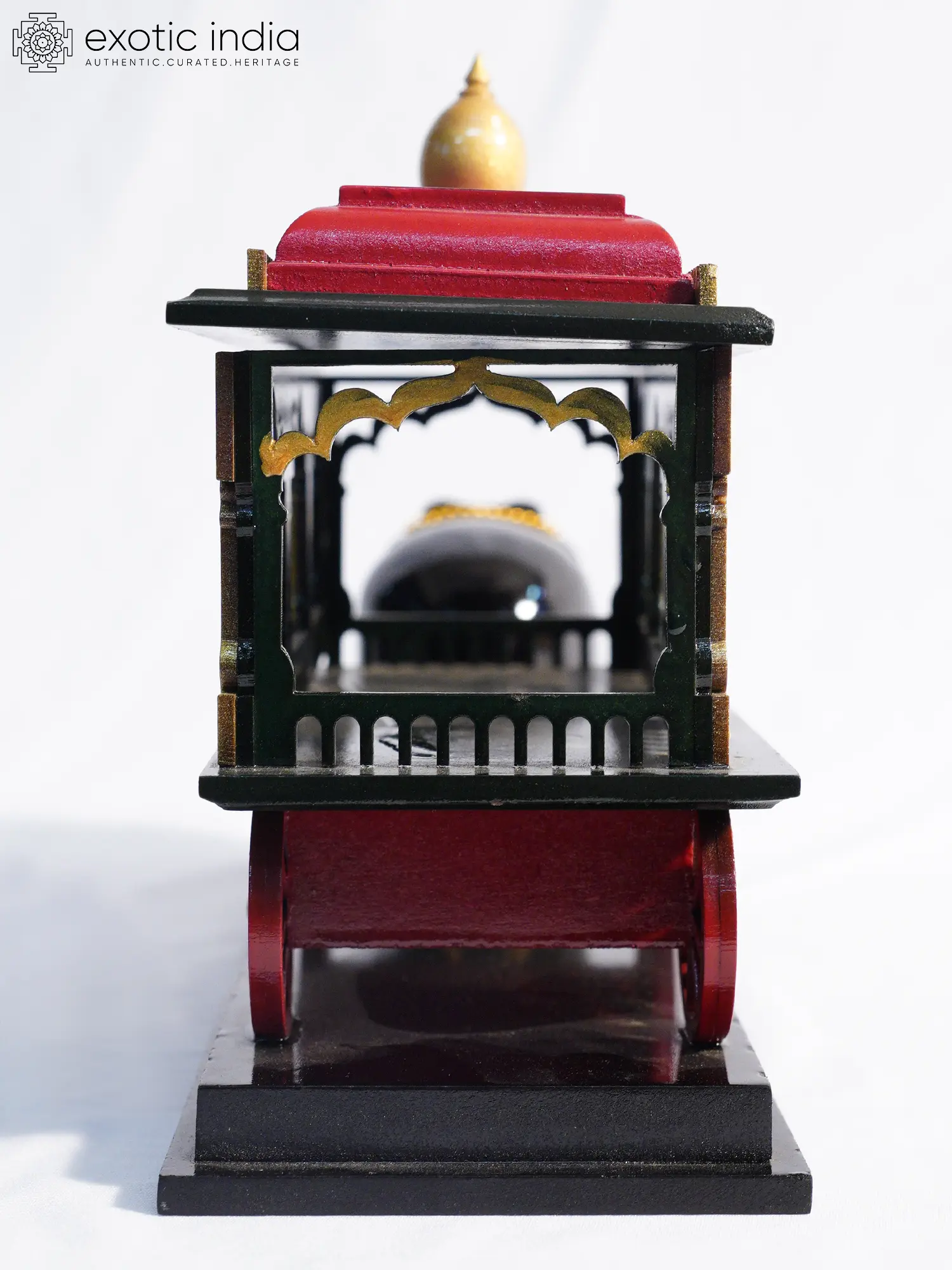 The striking contrast between the glossy black elephant and the richly colored cart immediately captures the eye. The cart itself is a marvel of design, featuring a vibrant red canopy adorned with golden accents and delicate latticework, suggesting ornate architecture. Its bright red wheels, reminiscent of traditional chariots, add a dynamic flourish. The entire composition, measuring approximately 11.5 inches wide by 4 inches deep and standing 8 inches tall, is presented on a sleek black base, enhancing its visual impact and stability.