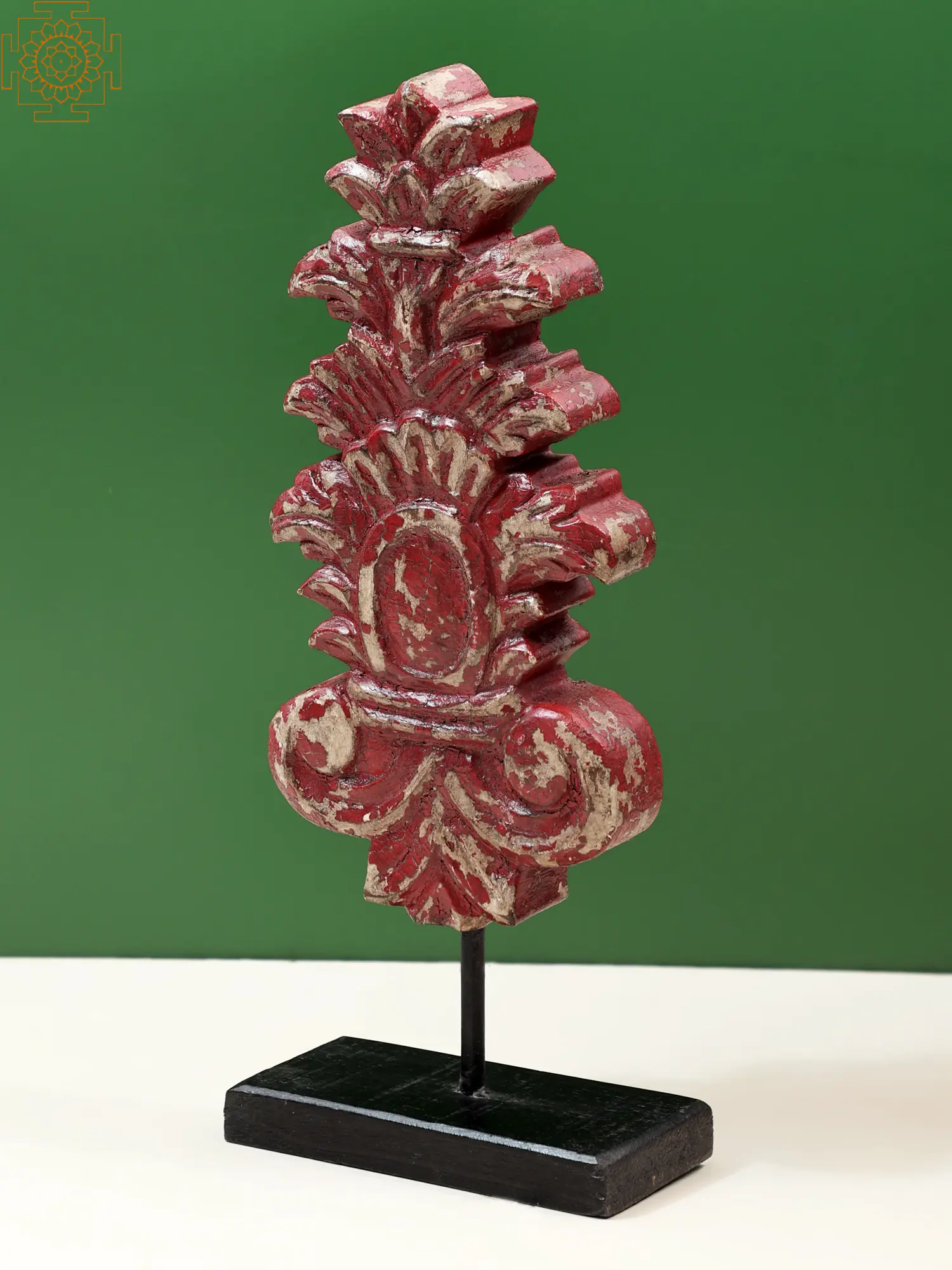This Wooden Floral Design Table Decor is reminiscent of the Leaf of Akanthos Mollis, (Raguenet). Made with the finest quality wood and placed on an iron bar secured on a wooden platform. The piece is painted in an antique tone of red. There are marks of wear and tear on the piece that showcase that the piece has survived the test of time. The Akanthos leaf placed as the central image of this piece is the most well-liked decorative pattern derived from plants. The Greeks first used it and it has since been repeated in all Western styles. This Table Decor is a well-defined addition to any home decor idea that exudes the old-world charm.