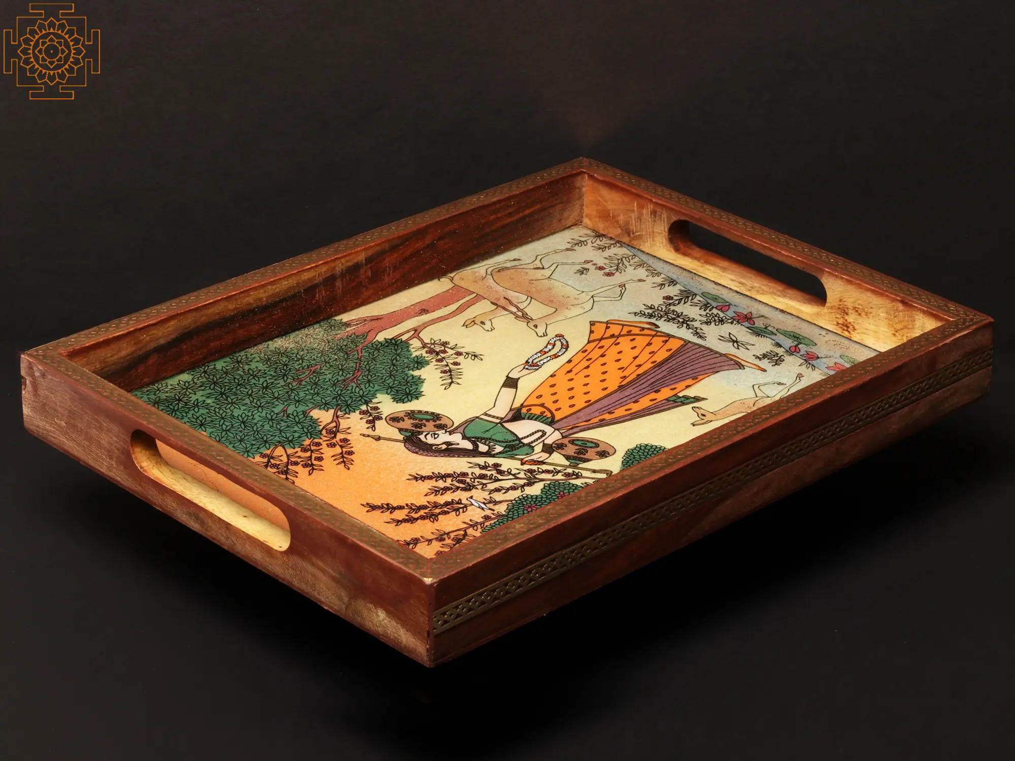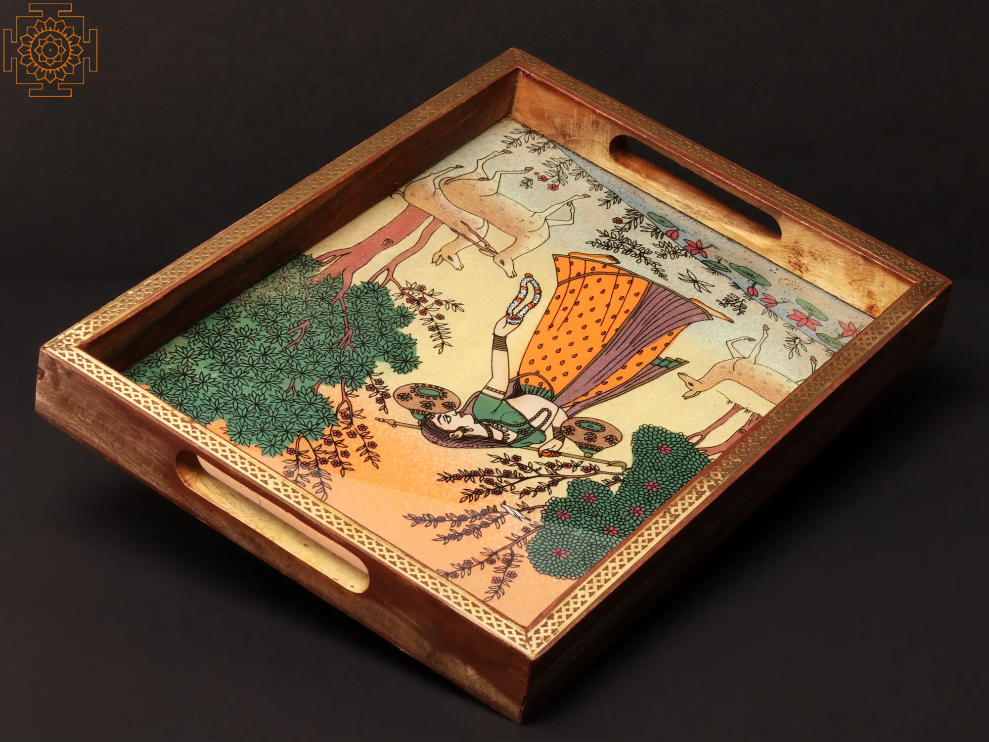 Close your eyes and imagine a rustic village—the scent of earth, the rustle of leaves. Now open them to behold this wooden tray. The village lady, her saree billowing, moves gracefully amidst a tranquil landscape. Deer graze nearby, their eyes mirroring the serenity of dawn. The carvings on this tray tell tales of simplicity—the warmth of home-cooked meals, the laughter of children. Whether you’re serving breakfast or displaying cherished mementos, let this tray whisper stories of rural life and quiet beauty.