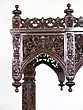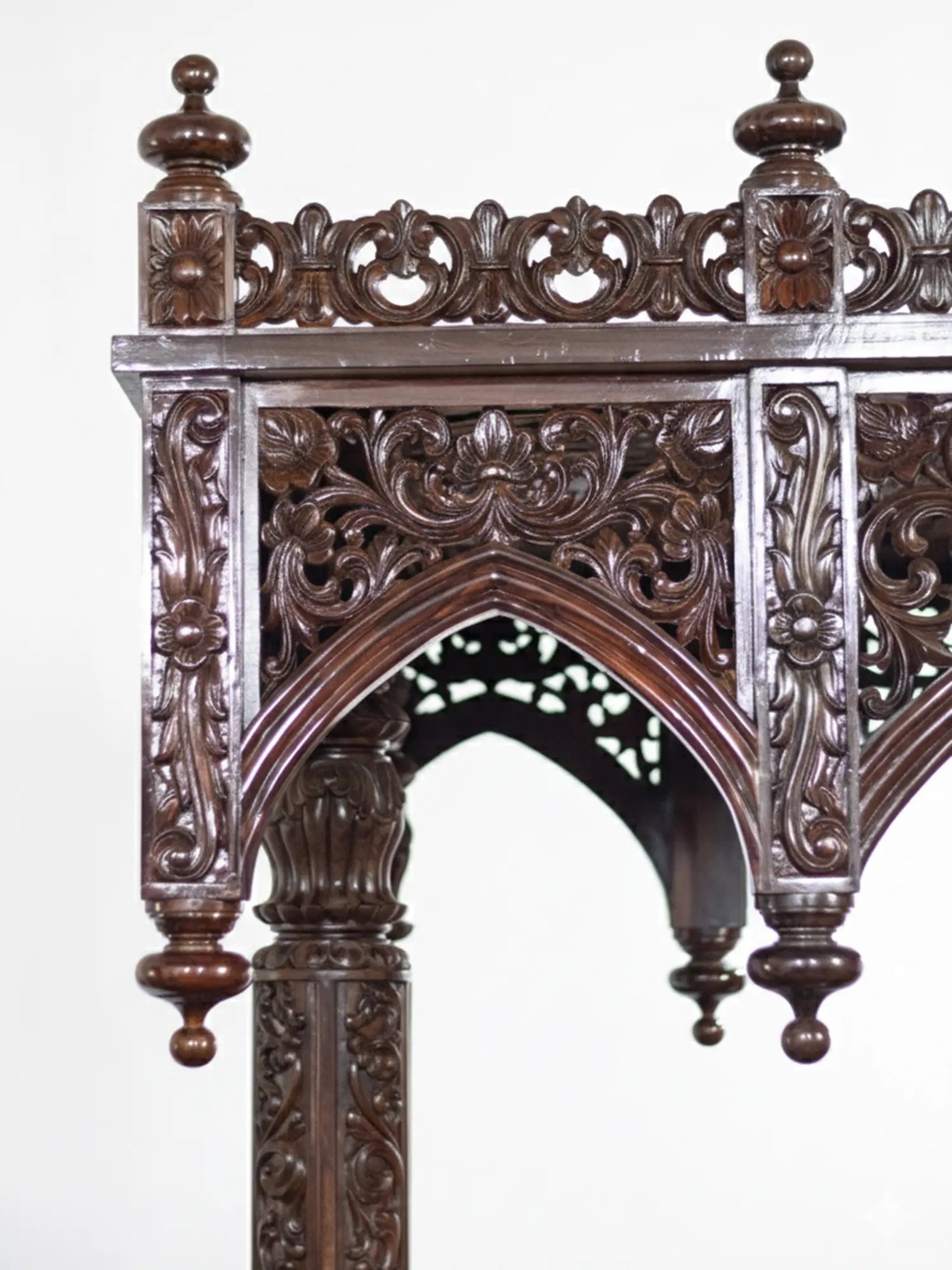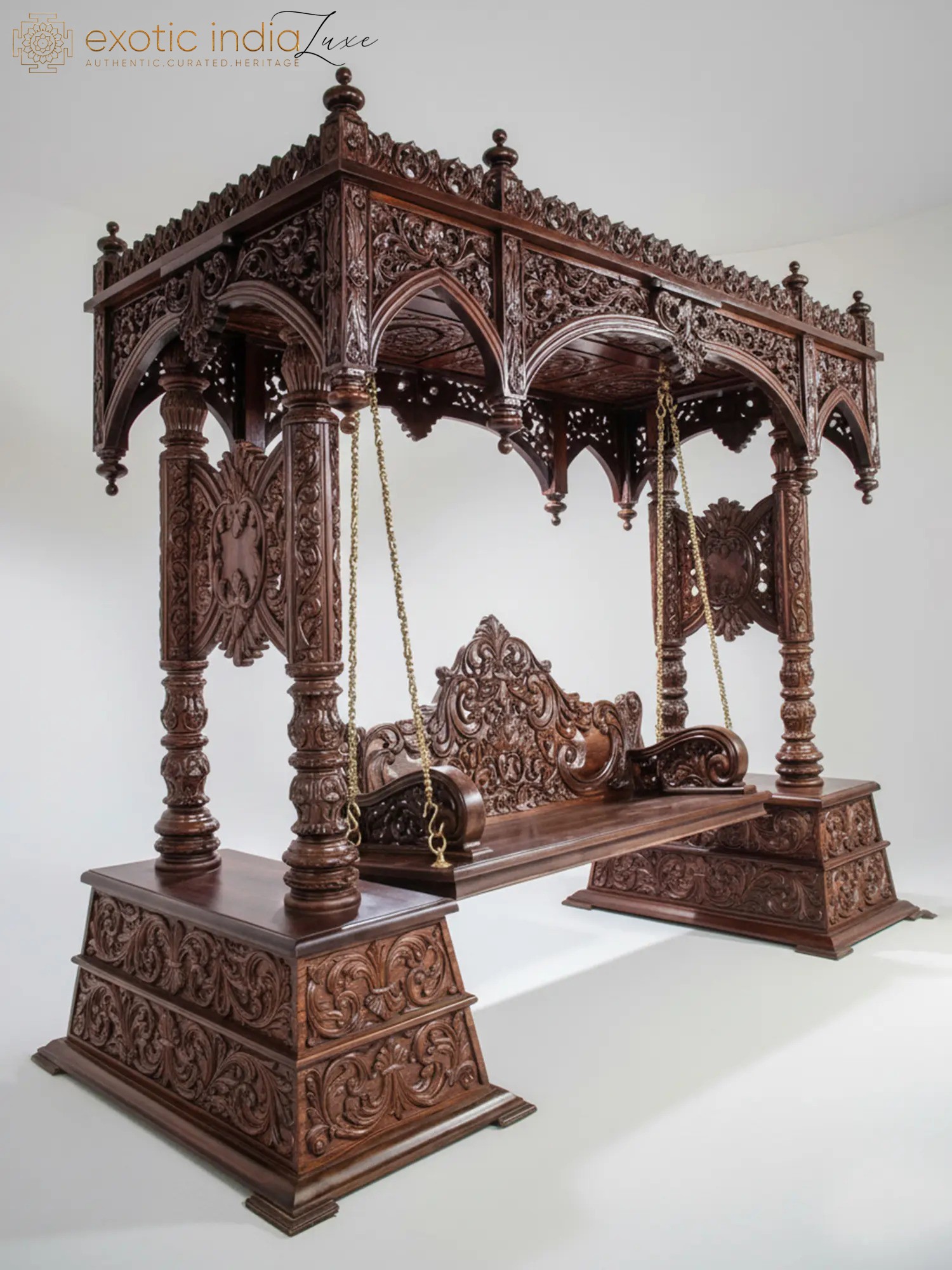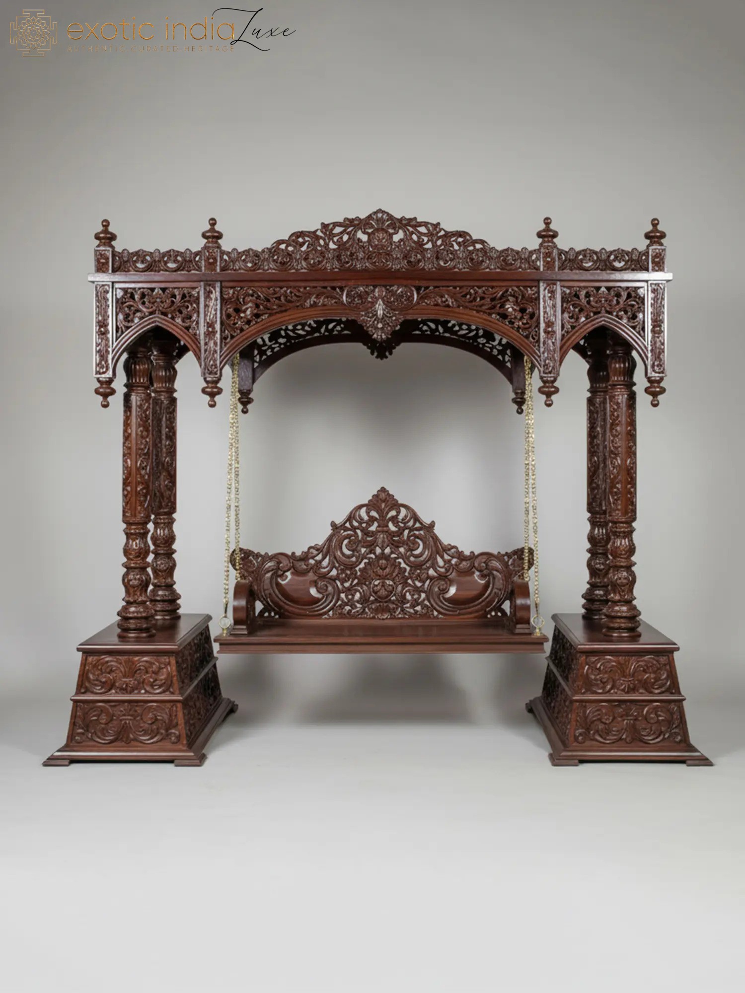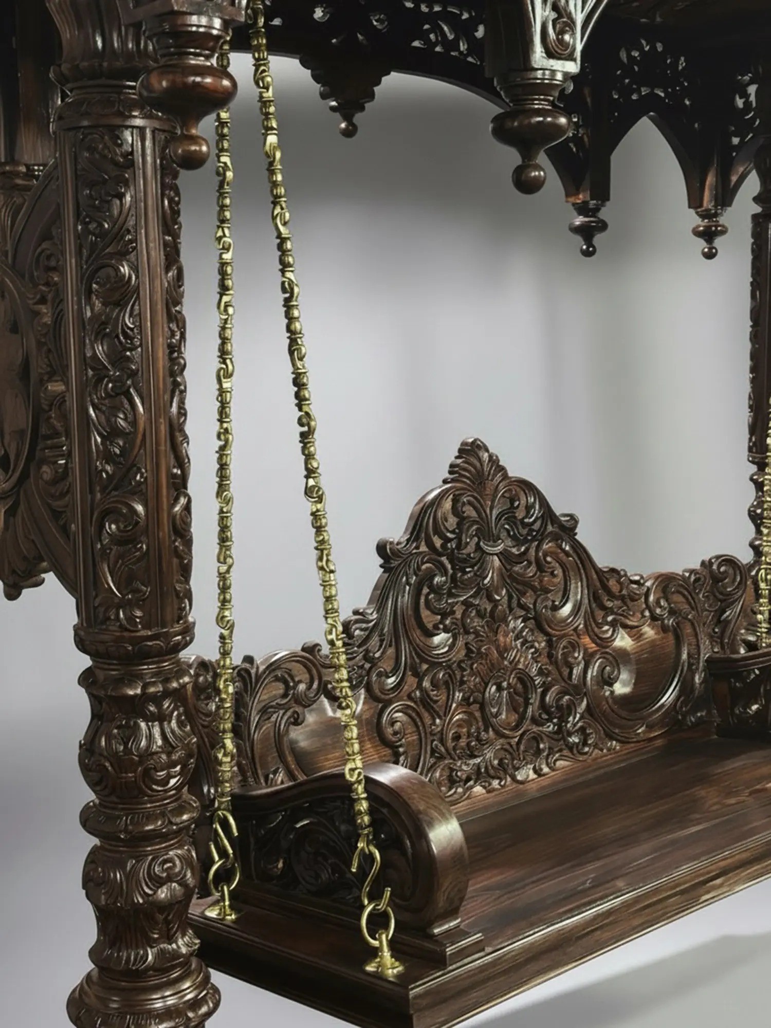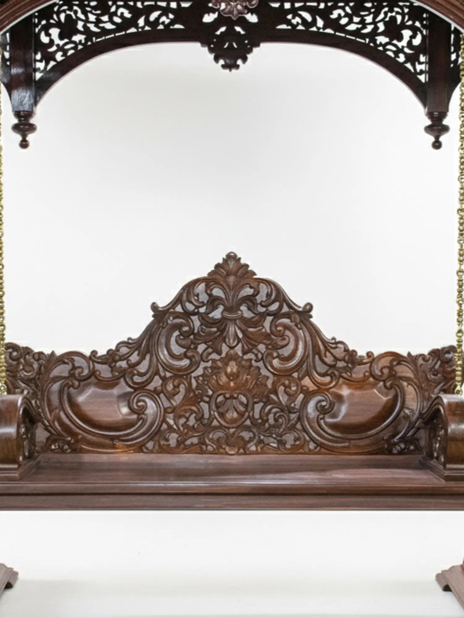 The defining feature of this extraordinary swing is its exquisite hand-carved detailing. Every surface is adorned with a symphony of delicate floral motifs, each petal and leaf meticulously rendered to perfection. The deep, intricate carvings create a mesmerizing play of light and shadow, adding depth and dimension to the already stunning piece. The arched canopy, supported by robust, yet elegantly carved pillars, is a marvel of decorative artistry, reminiscent of ancient palaces and revered temples. The swing seat itself boasts a similarly ornate backrest, providing both comfort and an unparalleled visual experience.