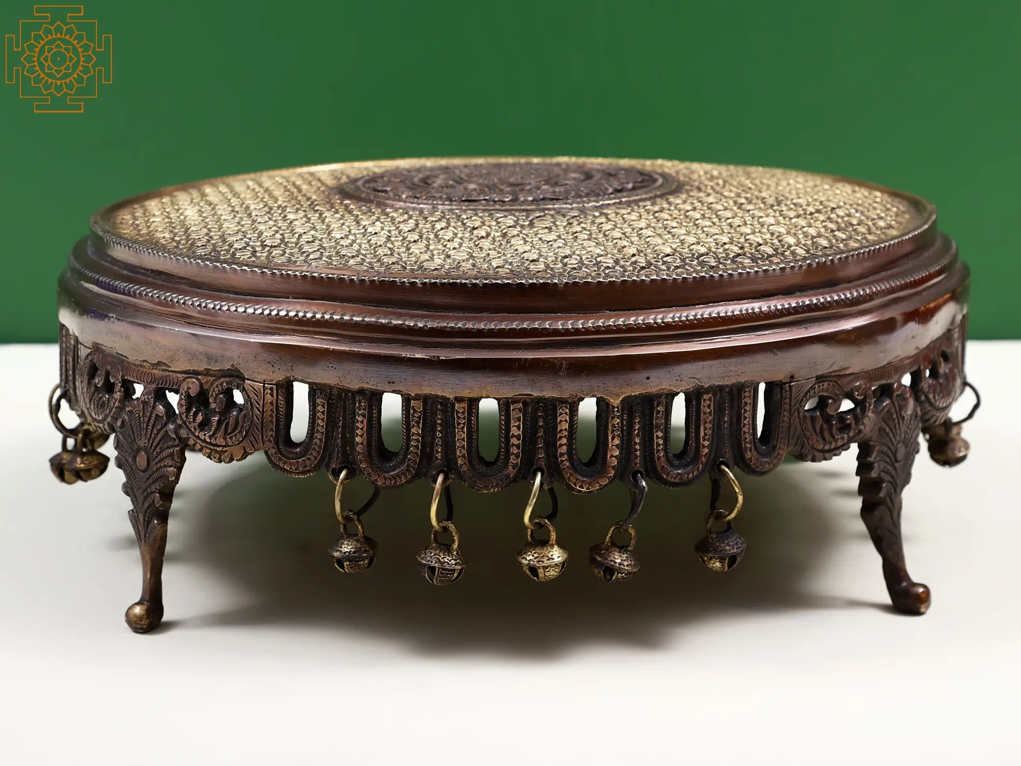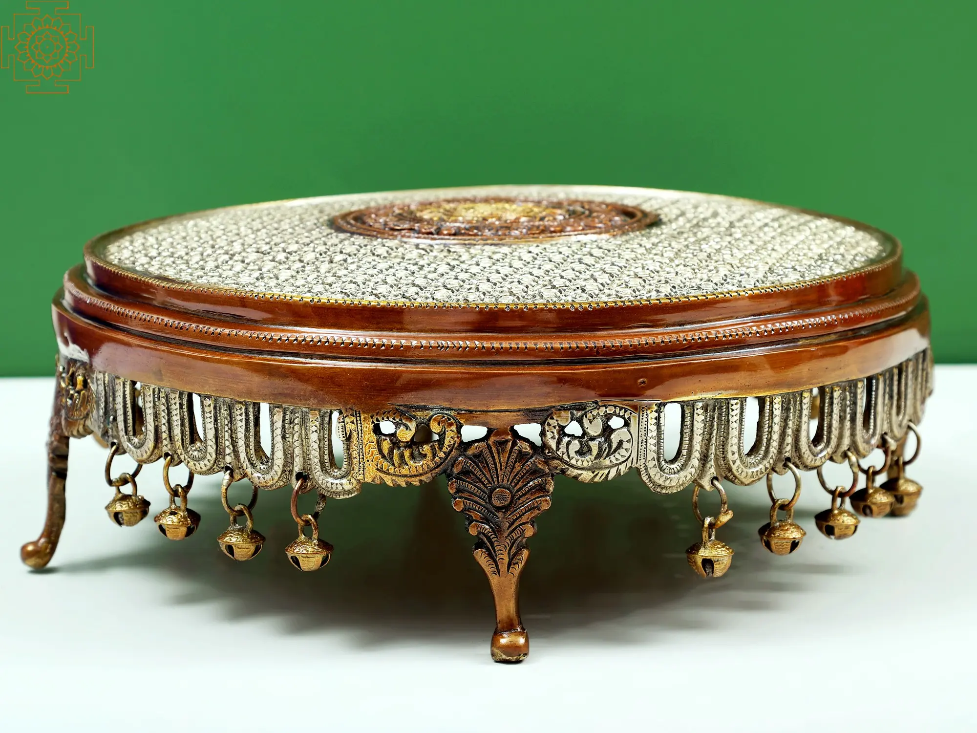 This magnificent Pedestal (Chowki), adorned with intricate blossoms and delicate bells, emerges as a symphony of nature and artistry. Crafted in brass with meticulous precision, it transcends mere aesthetics, serving as a vessel for ceremonial significance. This enchanting chowki becomes a sacred space, a tangible poetry of devotion and celebration. Each petal, a whisper of enchanting elegance, and every bell, a melodious echo of devotion. As a versatile emblem, it finds purpose in spiritual rituals, meditative practices, or as a centrepiece in festive occasions. Symbolising the unity of beauty and spirituality, this artwork becomes a harmonious tapestry of reverence and grace.