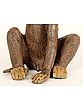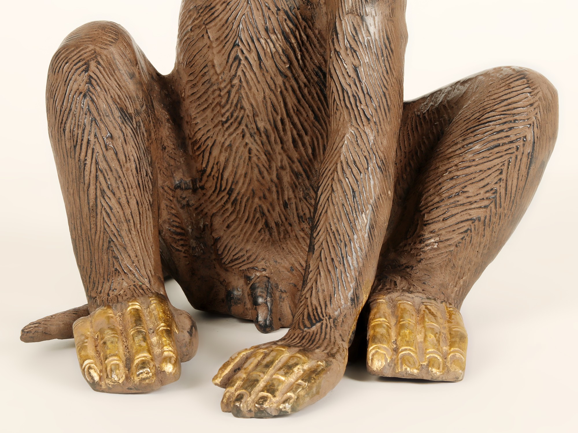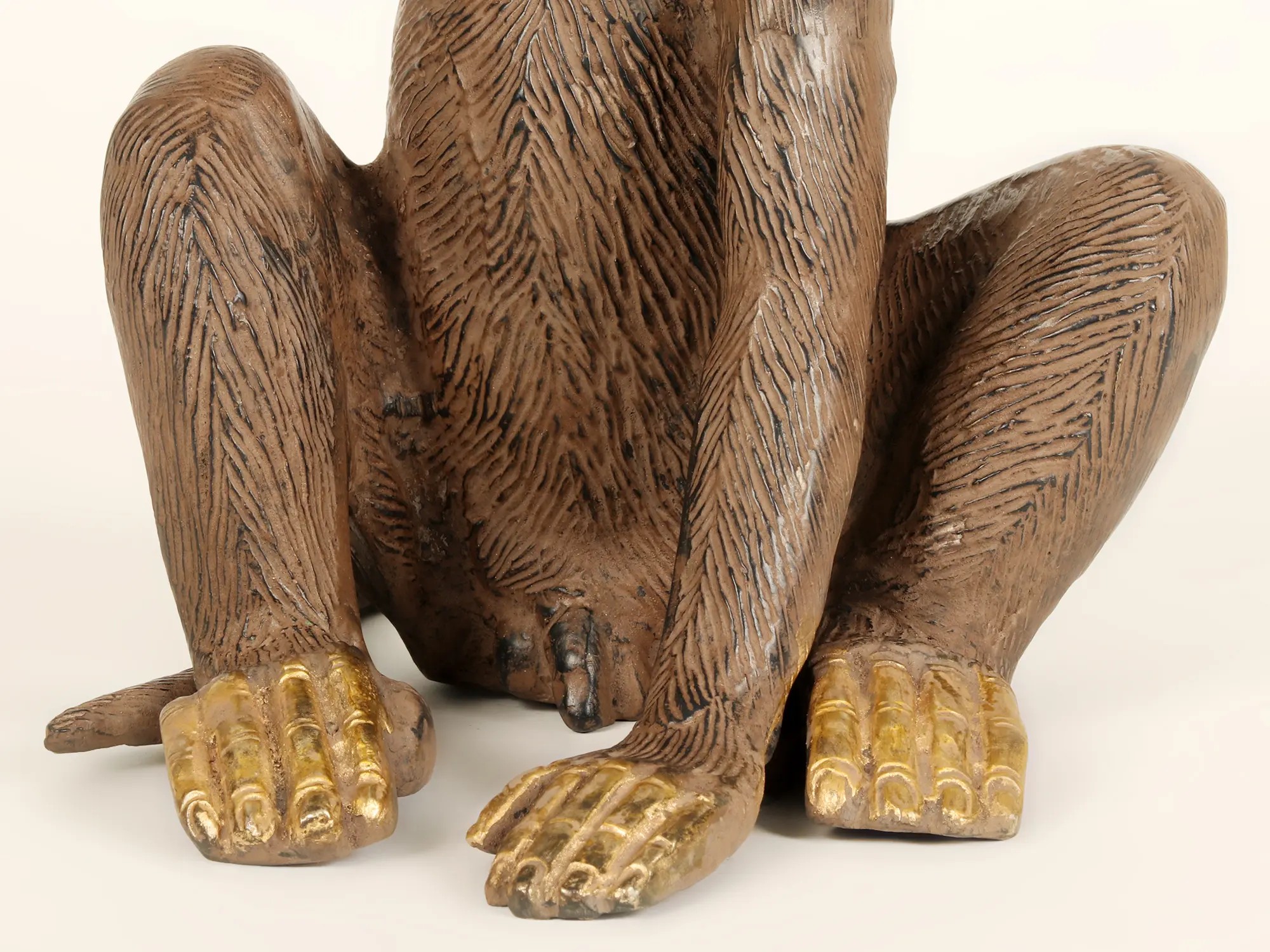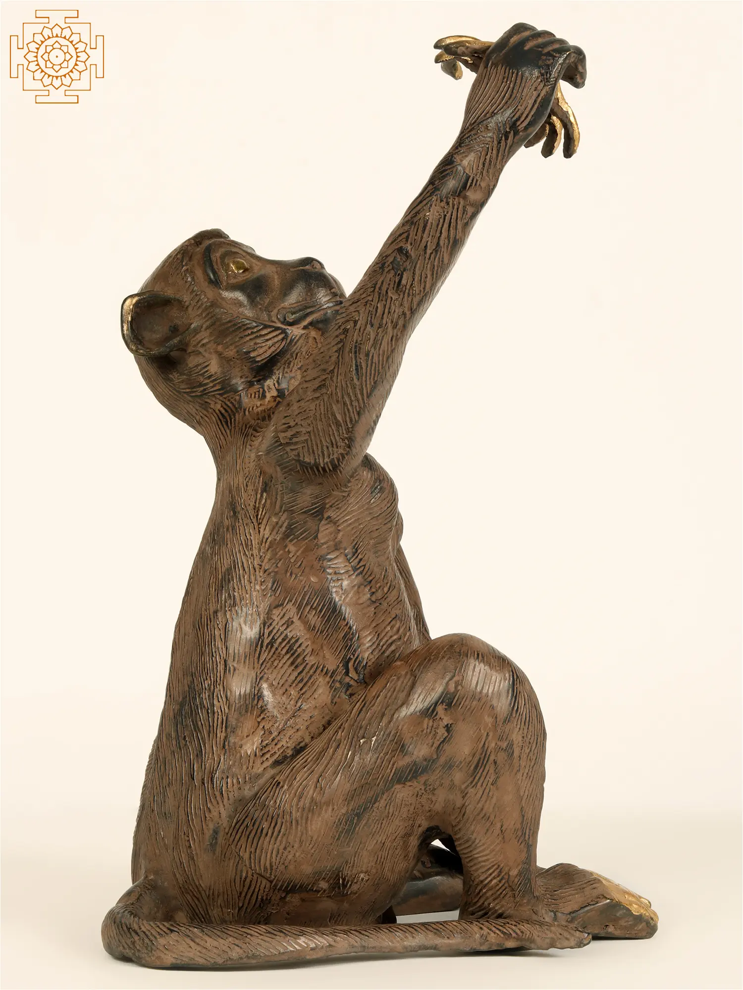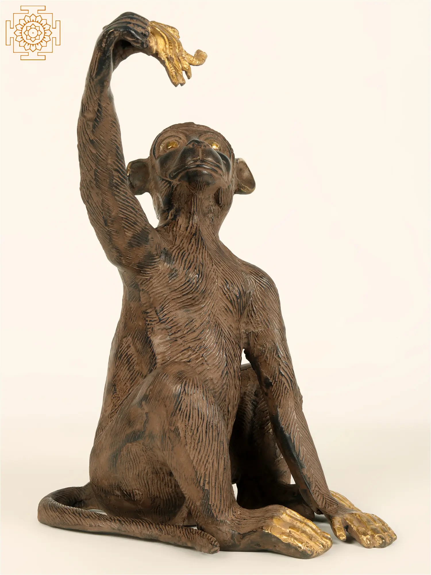 The hair on the monkey's body has been finely depicted with the chiseling technique and filled with brown sediments. The hands and feet of the monkey are painted golden, and the crab is also painted golden to bring focus to it. The monkey holds the crab high as if trying to throw it. This is a very interesting art piece inspired by the folktales that bring a rustic charm to the home decor.