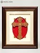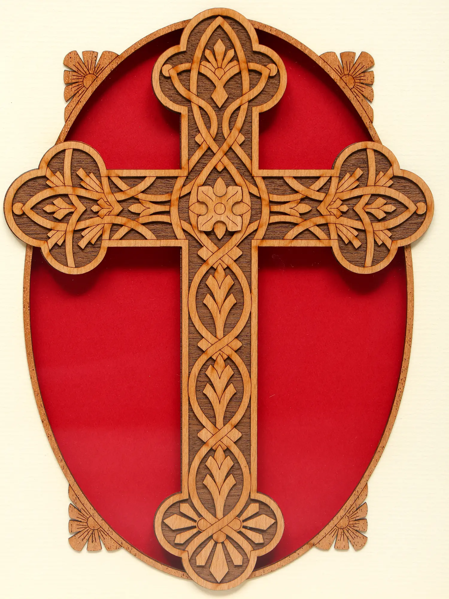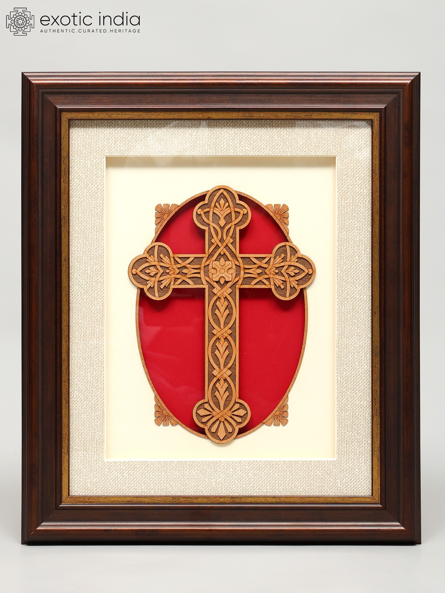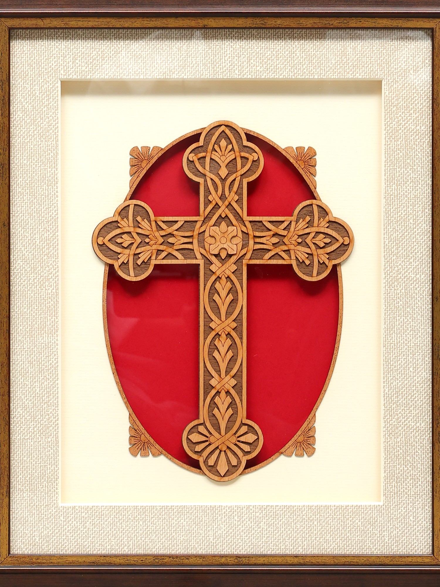 The focal point of this wall hanging is the meticulously carved wooden cross. Its delicate latticework and floral motifs intertwine to create a captivating design that draws the eye and invites contemplation. The natural warmth of the wood contrasts beautifully with the surrounding layers. A rich red oval backing highlights the carvings, providing depth and a pop of color that complements the earth tones of the frame. The neutral inner mat creates a buffer that allows the carving to stand out as the main element.