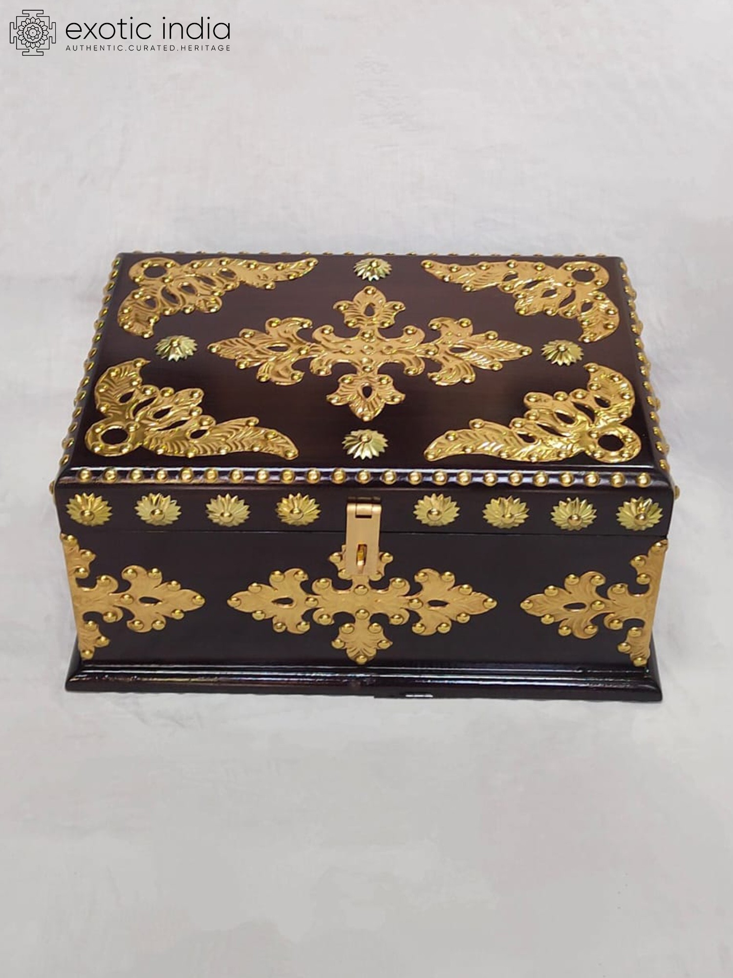 15" Decorative Brass And Metal Floral Design Wooden Jewelry Box