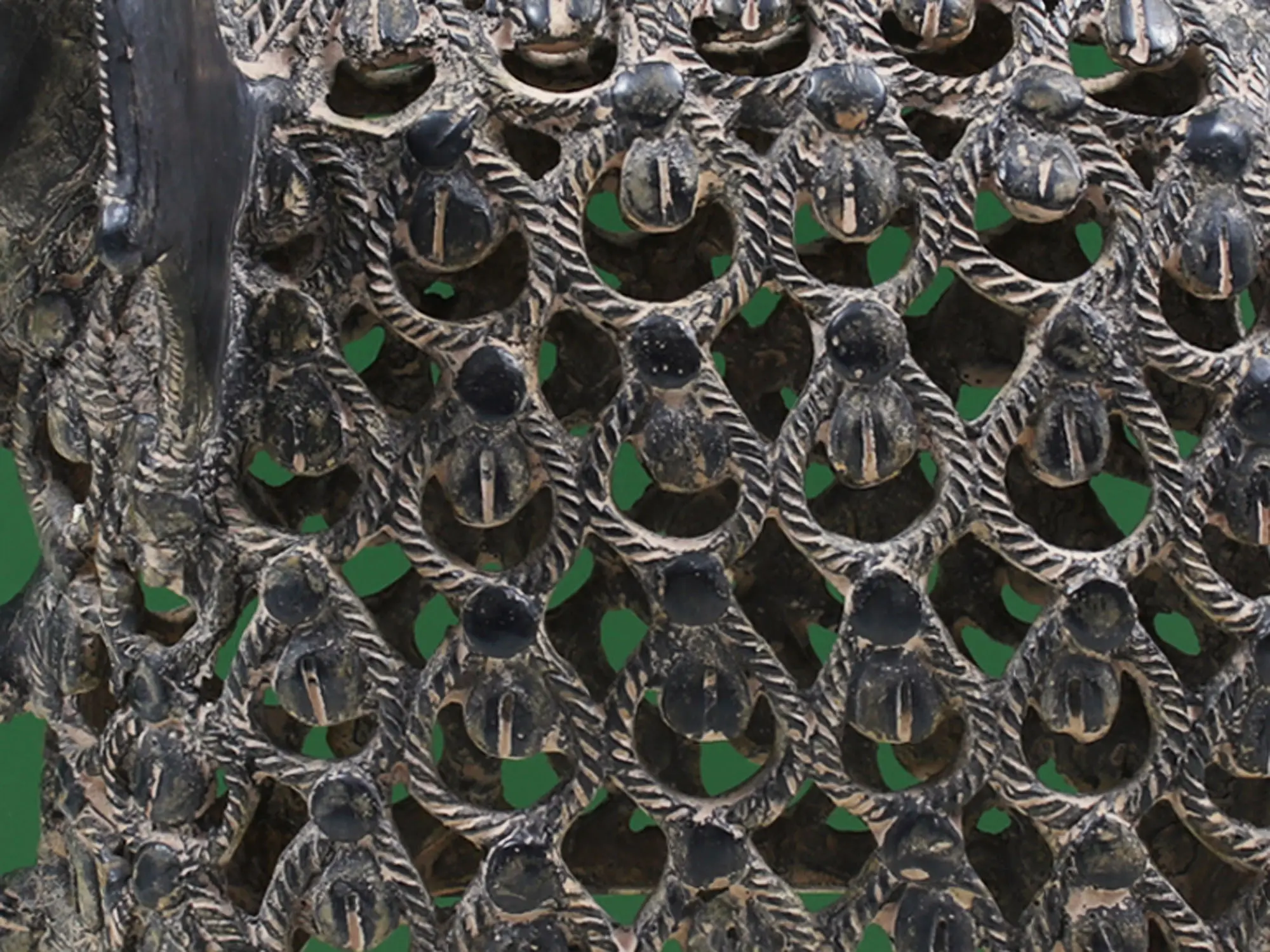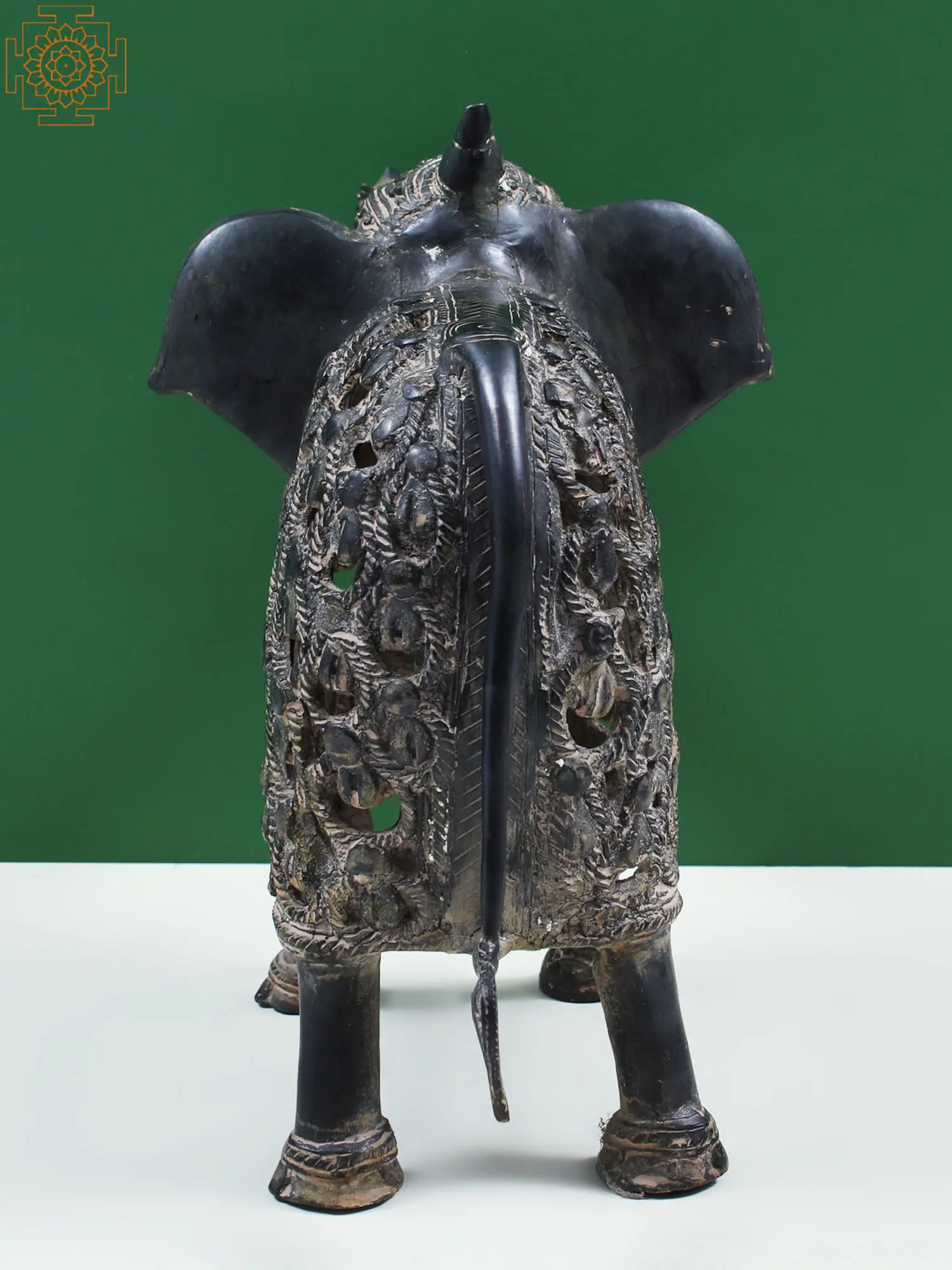 Beautiful patterns, characteristic of Dhokra art, cover the entire artwork. In his trunk raised in the air, the elephant holds a flower, as if offering it to someone. With hollow casting, eye-catching details on the elephant's body are realized, which are marked by tiny cowrie-shaped motifs. A remembrance of the undying art tradition of India, this Dhokra elephant is a marvel to add to your home decor.