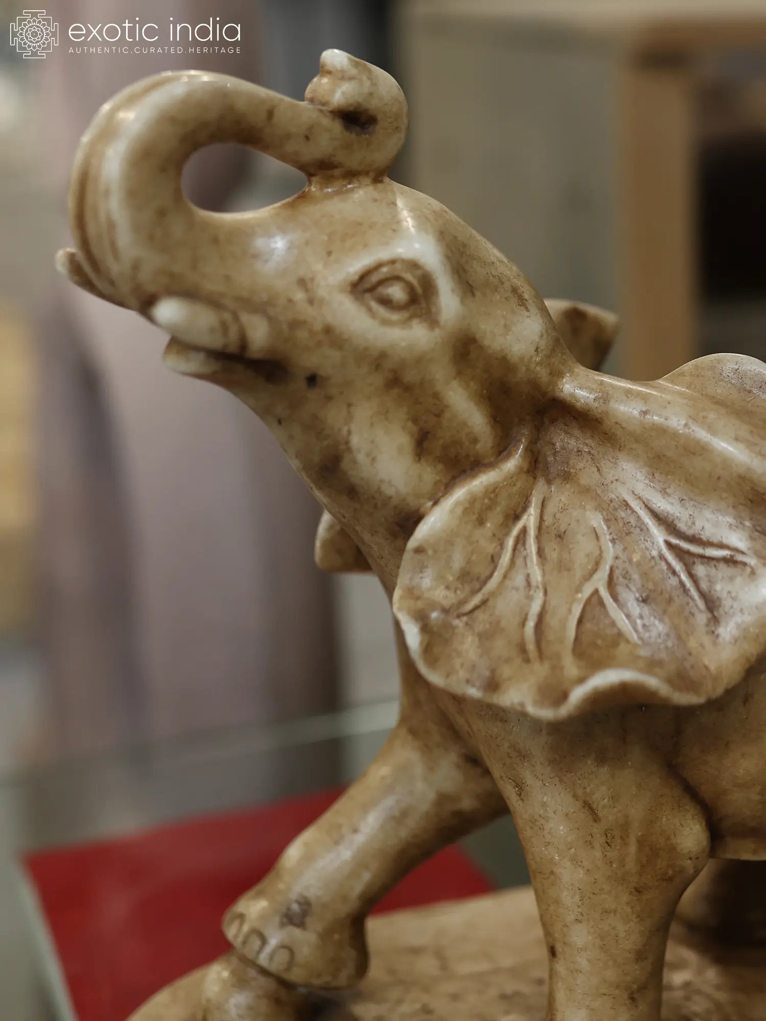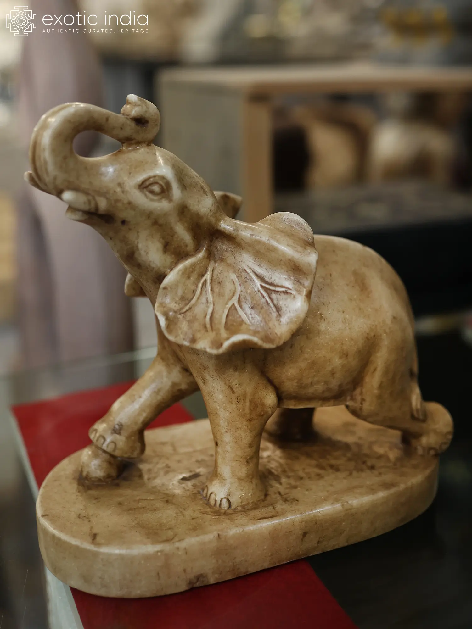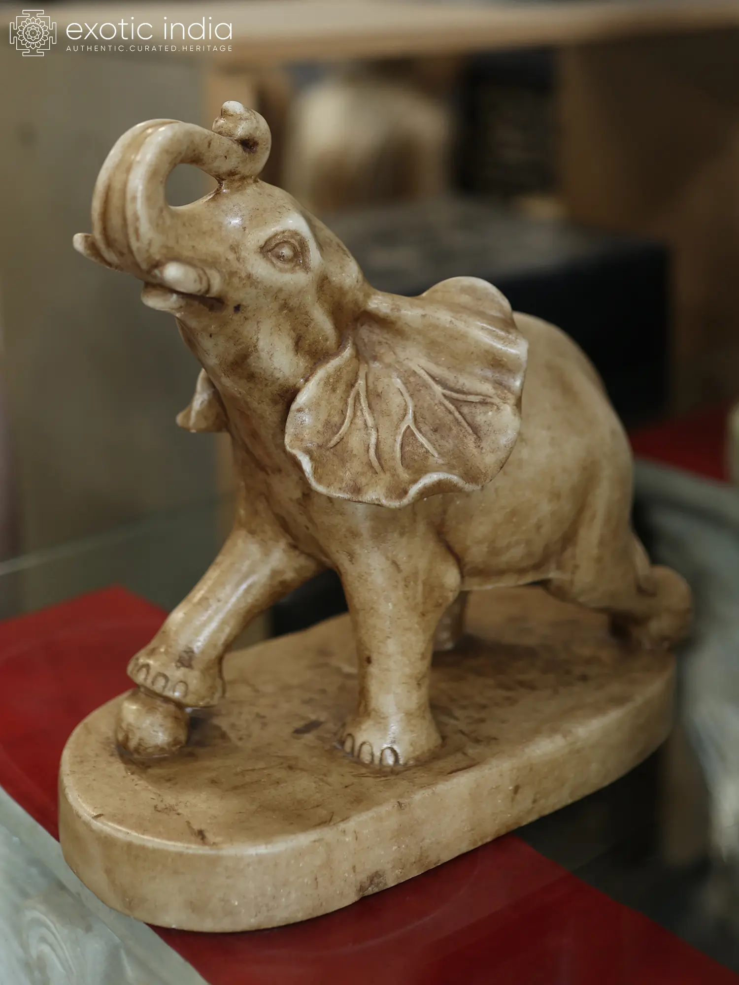 Standing at thirteen inches tall, with a width of twelve inches and a depth of six inches, this sculpted form is a study in refined proportions. The trunk is raised with spirited energy, a gesture often associated with victory and celebration. Subtle details, from the textured folds of the skin to the delicate delineation of the tusks, speak volumes of its exquisite craftsmanship.