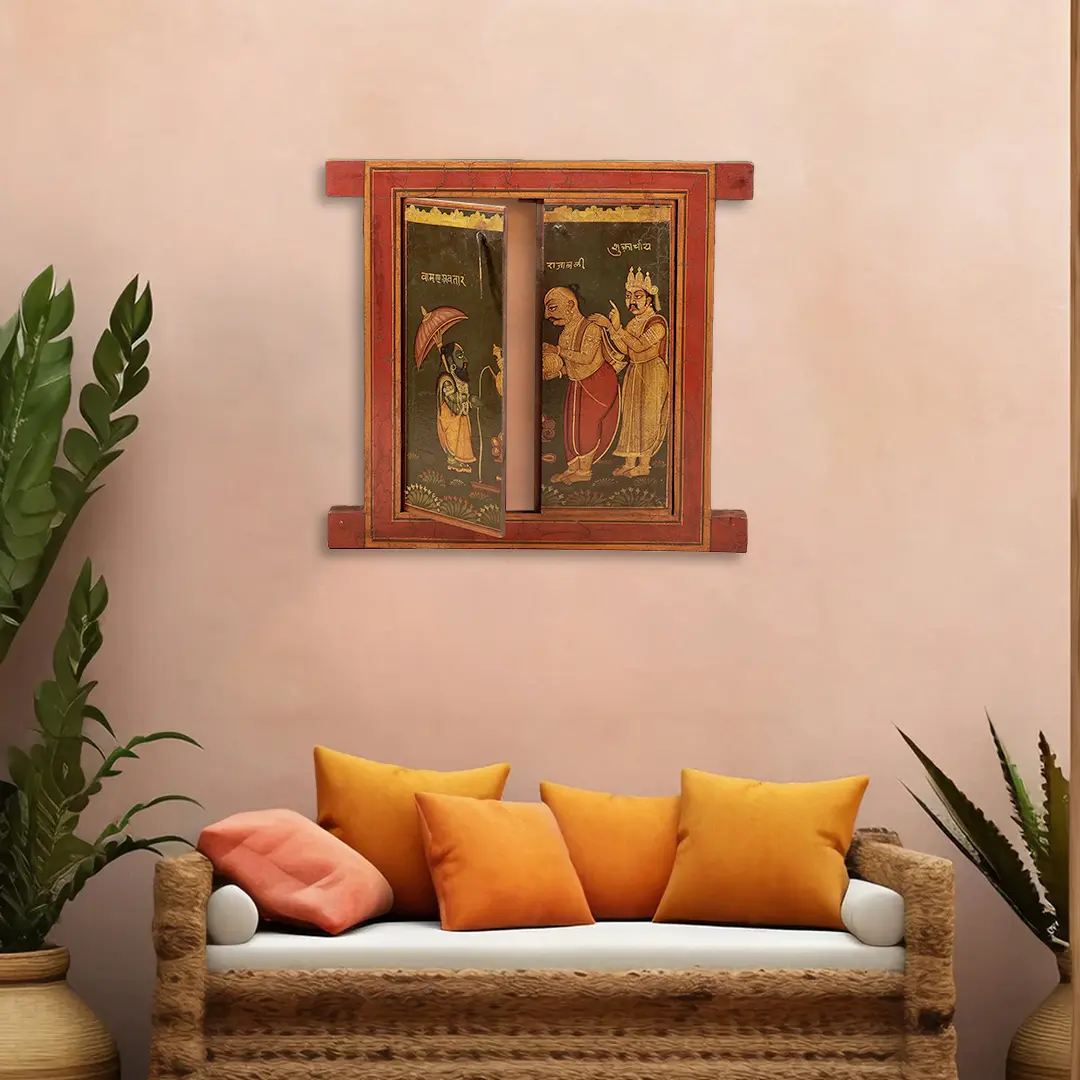 This magnificent hand-painted quality wooden window in aesthetic colors engraved with 24 K gold, depicting three characters- king Bali, Lord Vamana, and demon guru shukracharya, is a unique piece of art for your dwelling.