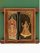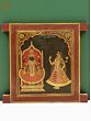 The majestic, multi-colored wood painting of the Hindu deity Shreenathji, is adeptly hand painted. A charming and beautifully attired lady Bhakt (Jamunaji) admires the standing Shrinathji, holding arrows, mace, a manuscript, and a conch shell in his hands.