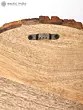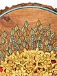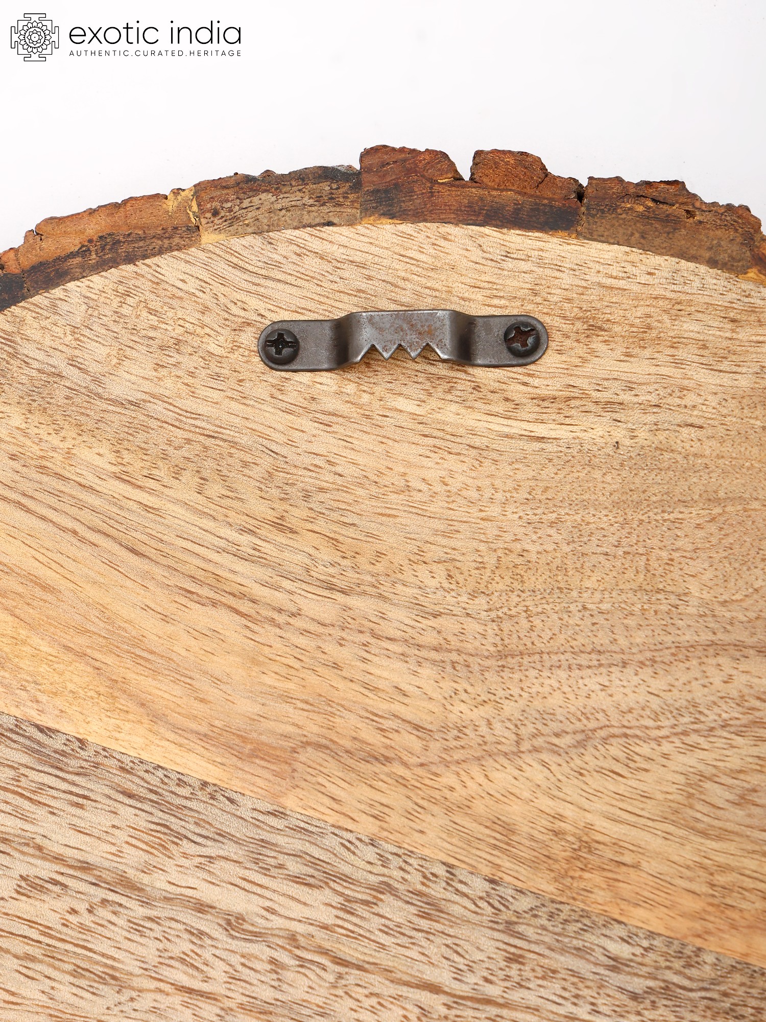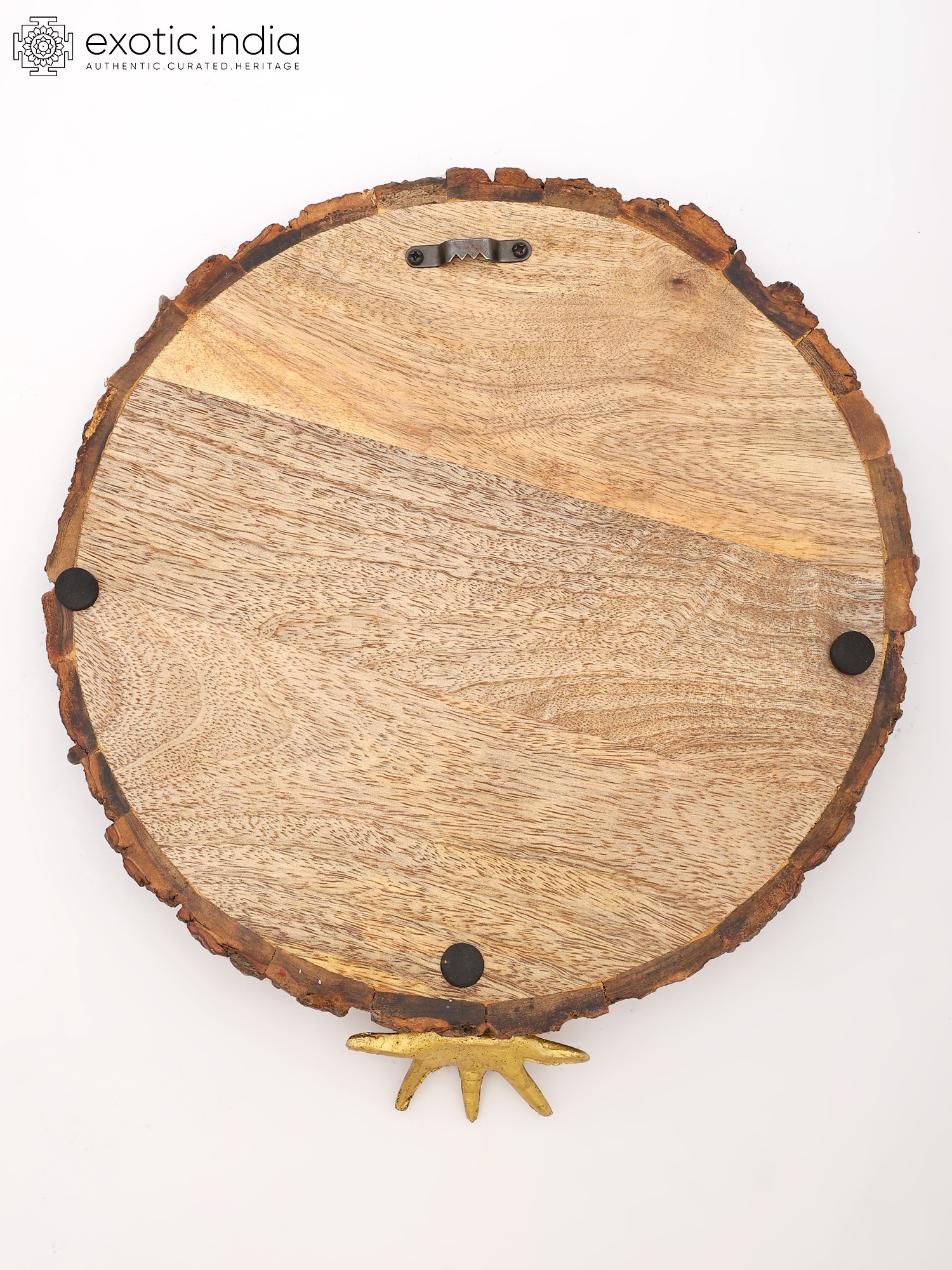 Mounted on a hand-painted round wooden base with a rustic bark edge.