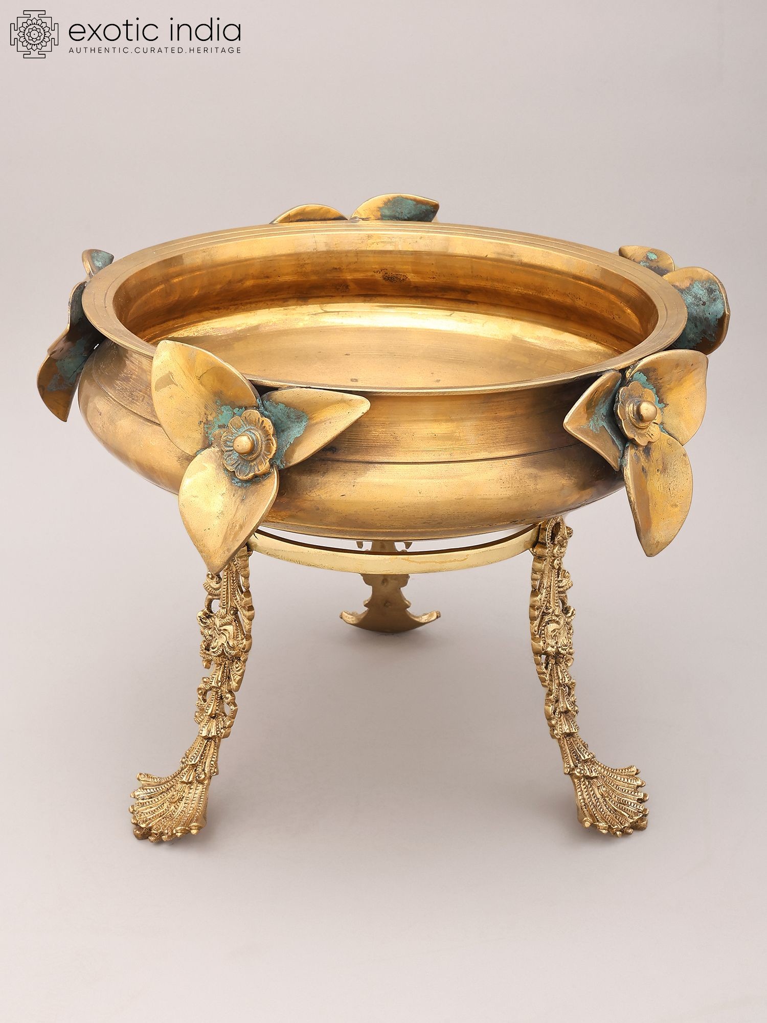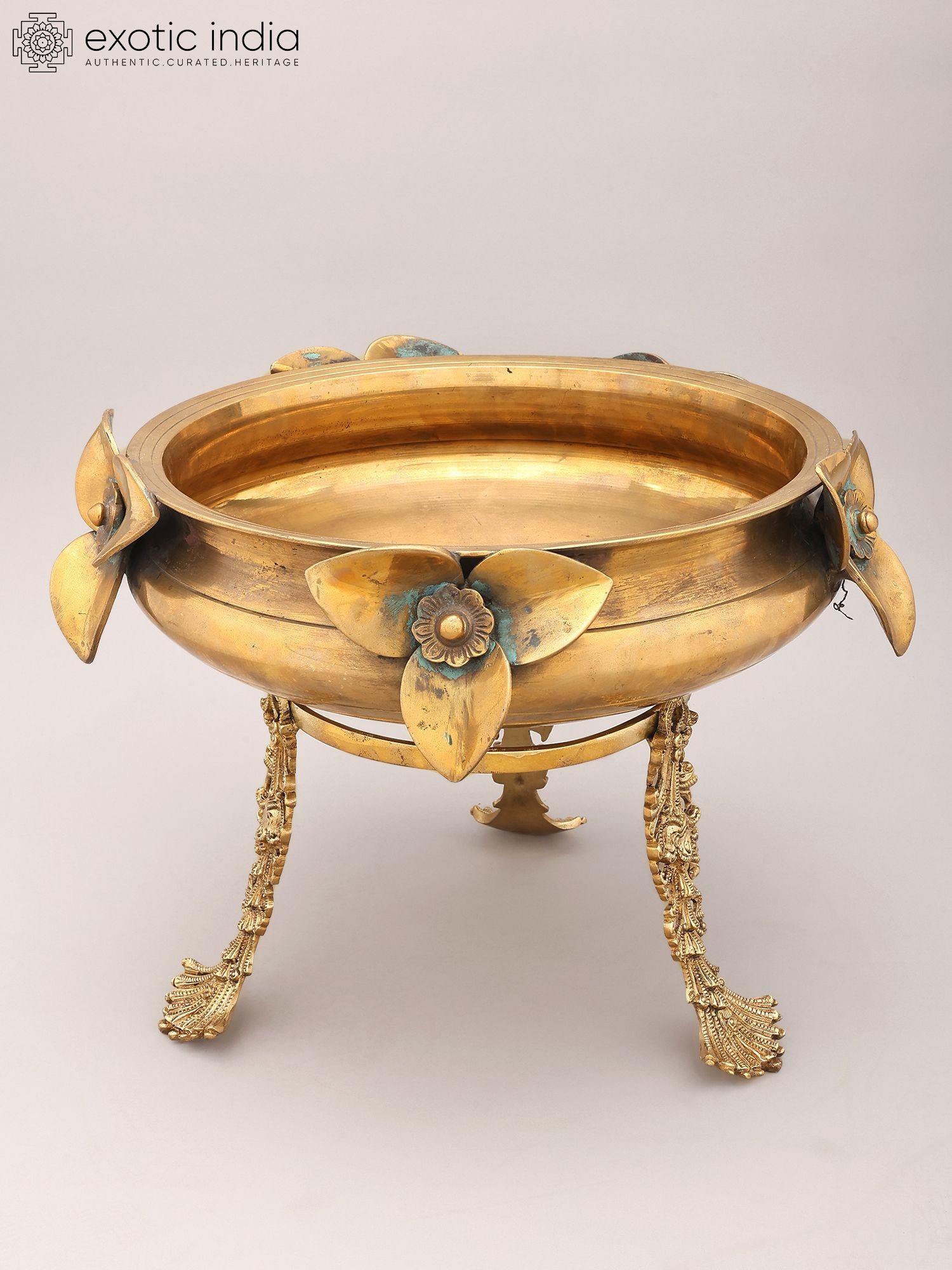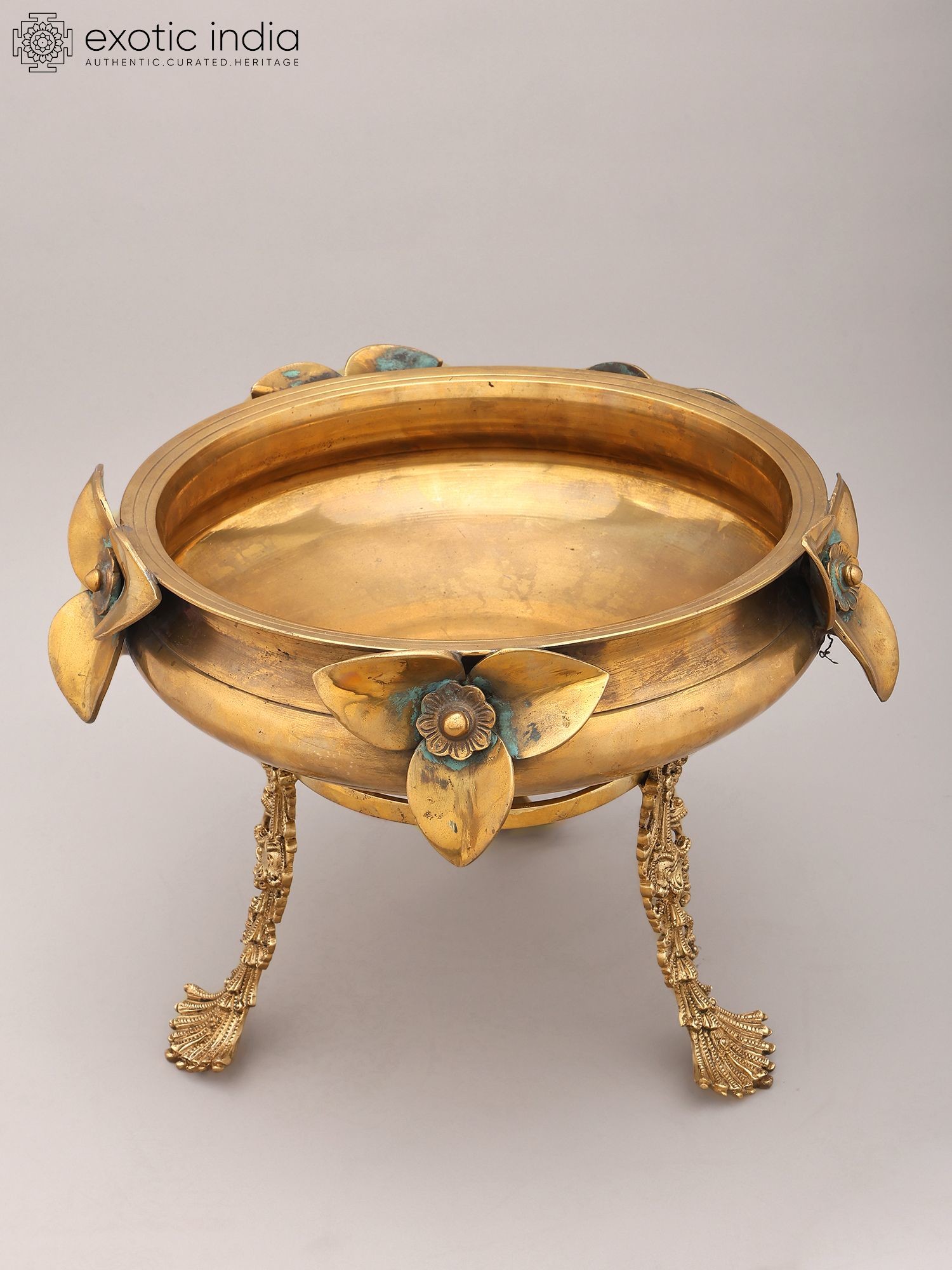 17" Brass Urli with Flower and Bird Design