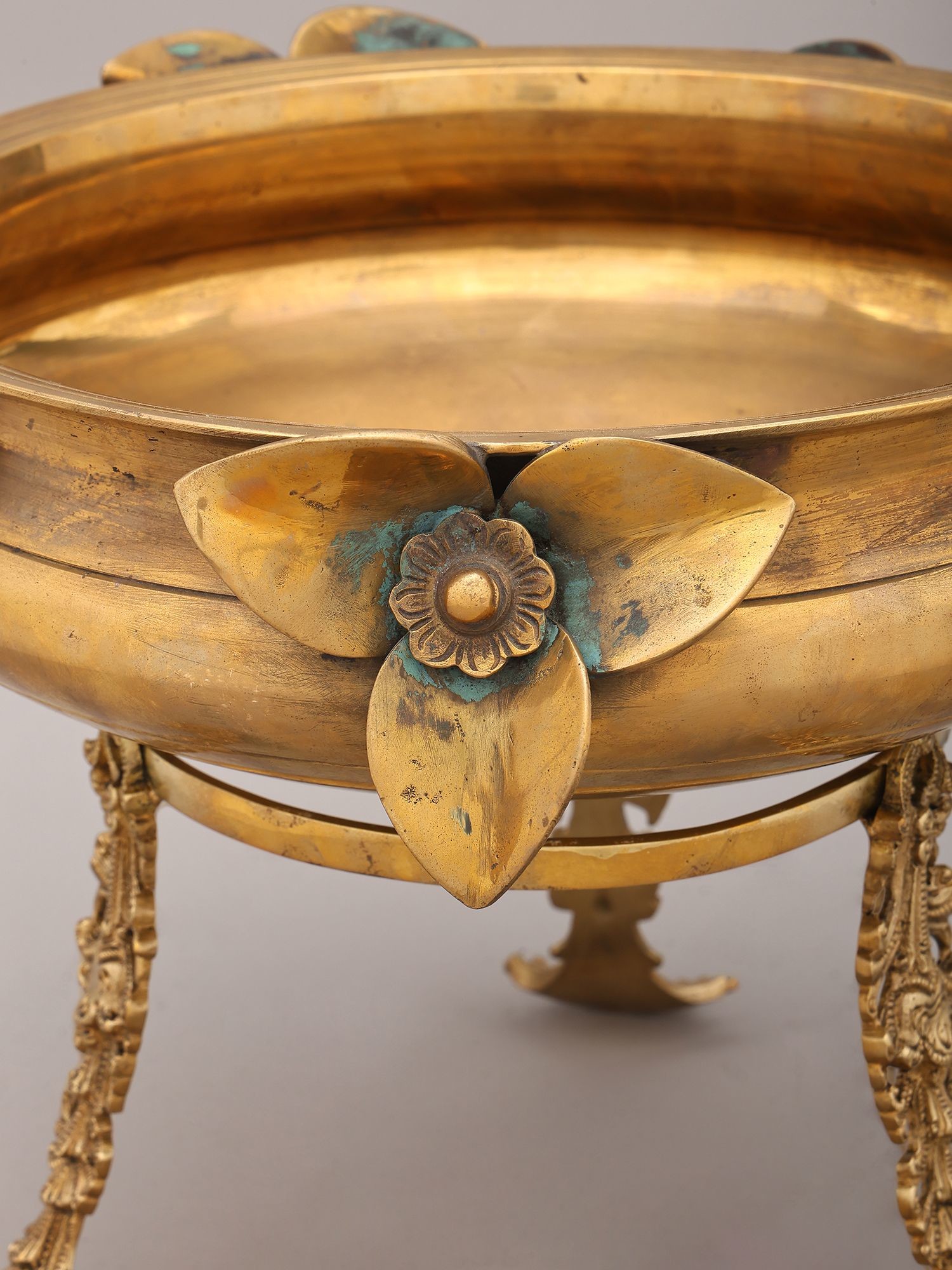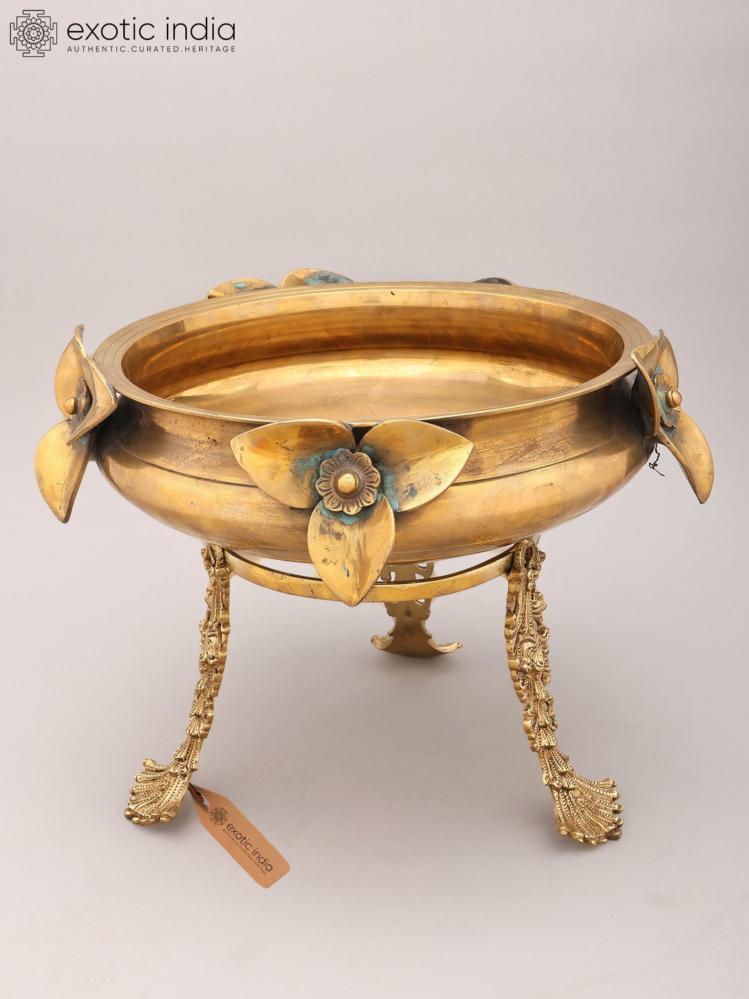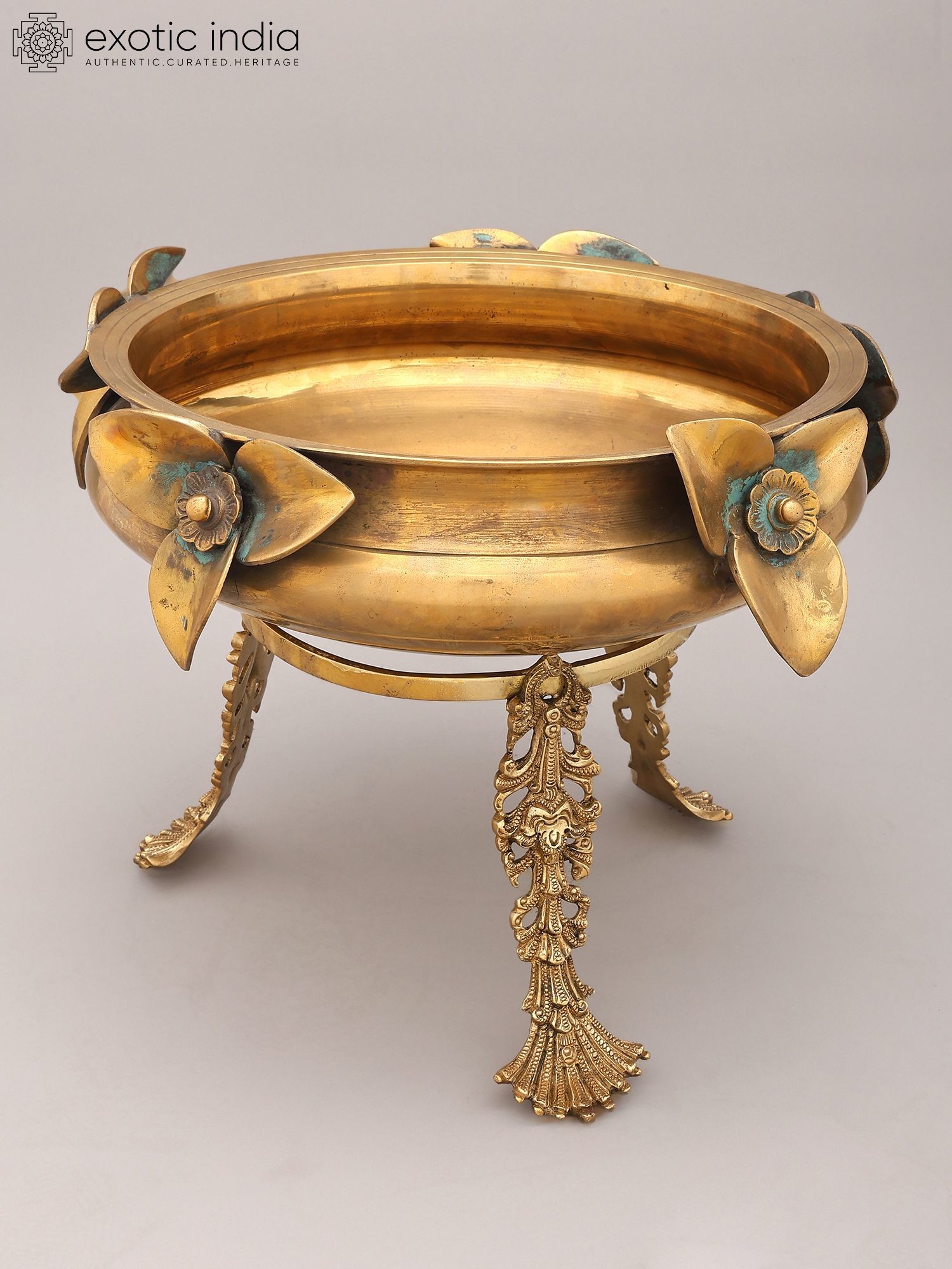 17" Brass Urli with Flower and Bird Design