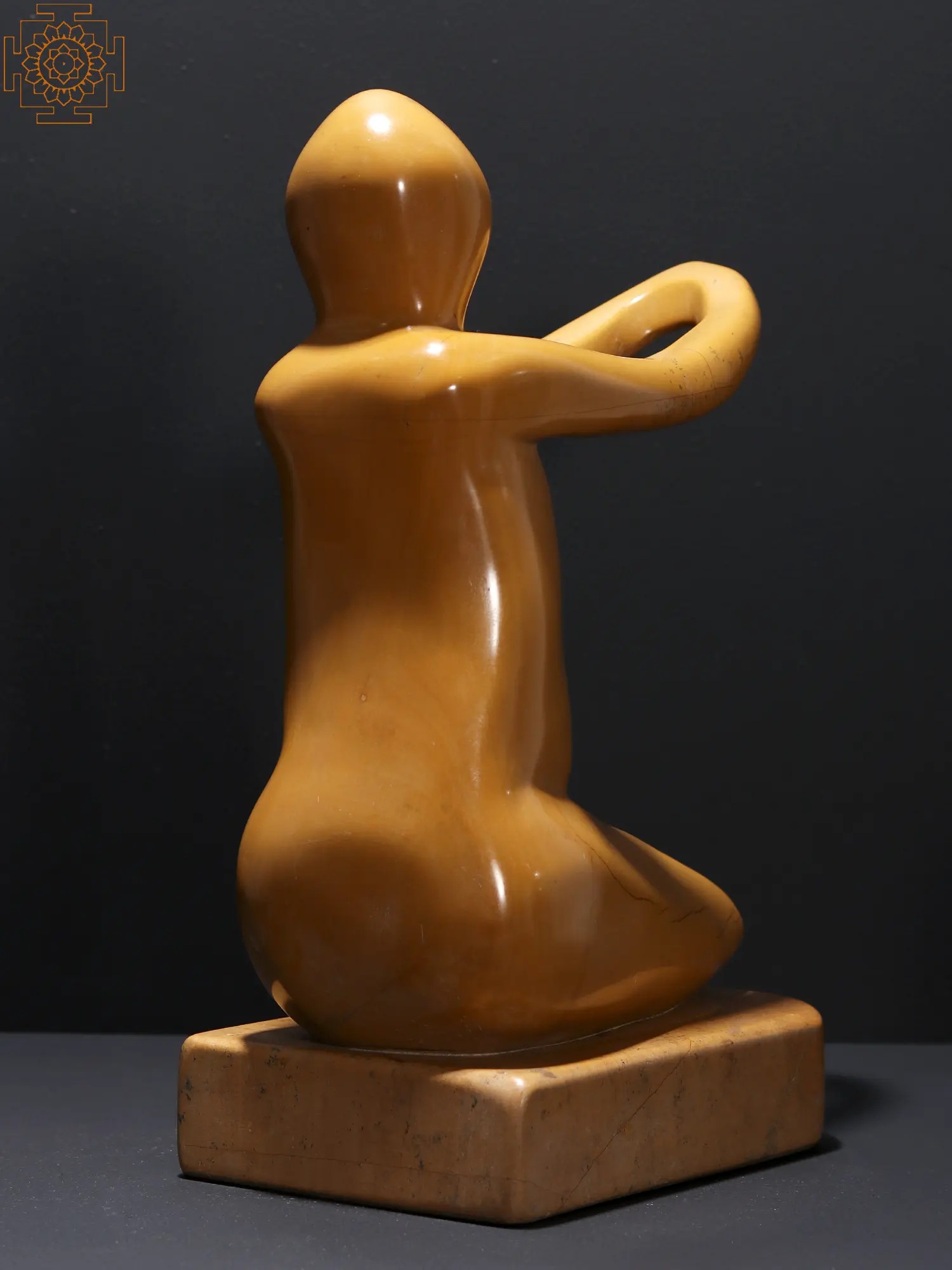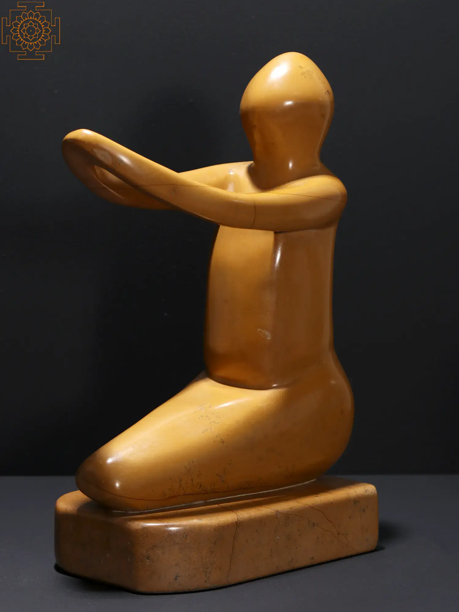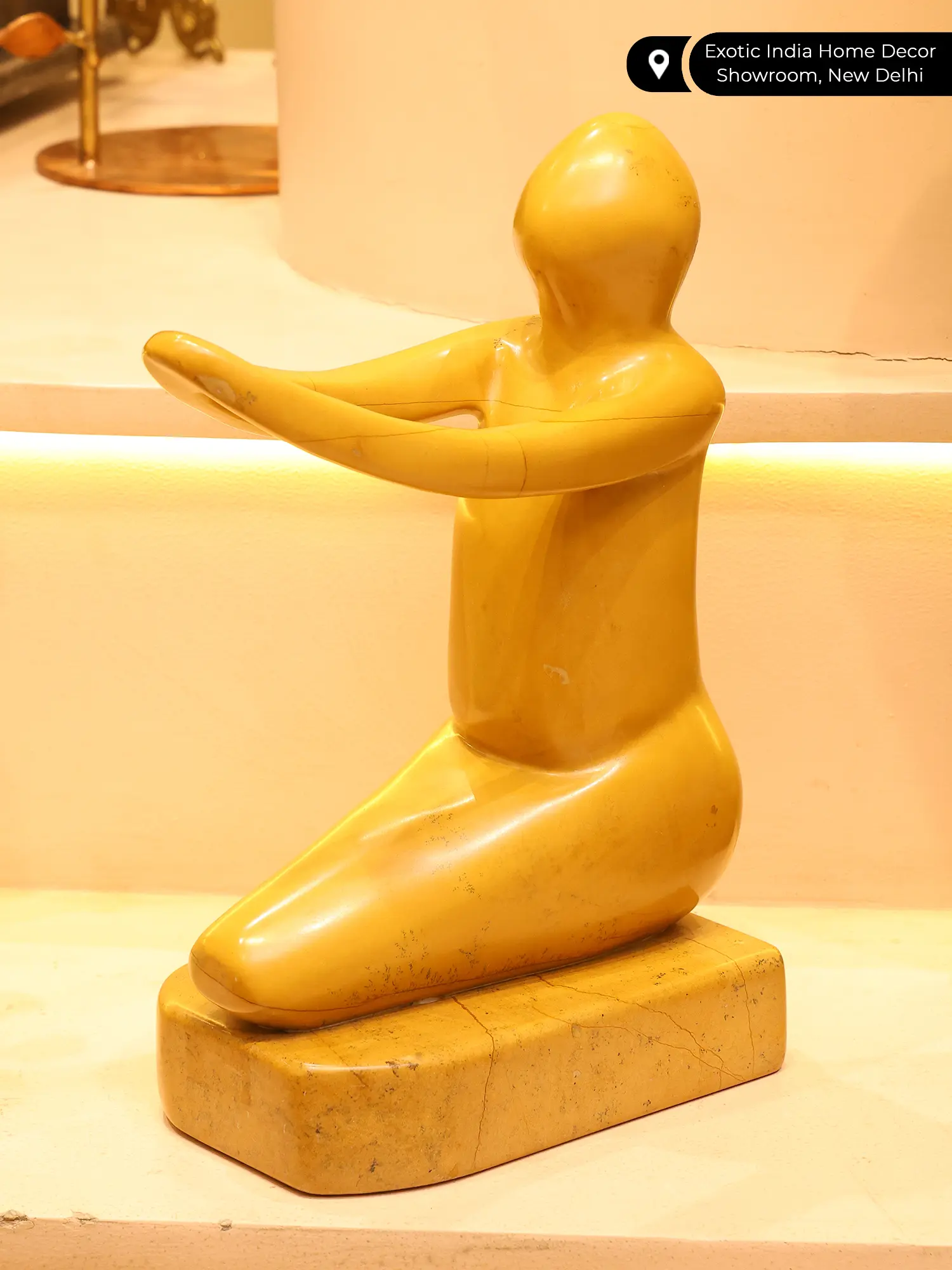 This contemporary art sculpture, made of Jaisalmer Yellow Gold Stone, is a true tribute to artistic creativity and spiritual reflection. This intriguing work depicts a peaceful figure sitting with folded knees and stretched hands lifted in prayer. The Jaisalmer Yellow Gold Stone, known for its warm and vivid tint, gives lustre to the sculpture's calm presence. From the delicately carved elements to the flawless composition, every detail reveals the artist's talent and vision.