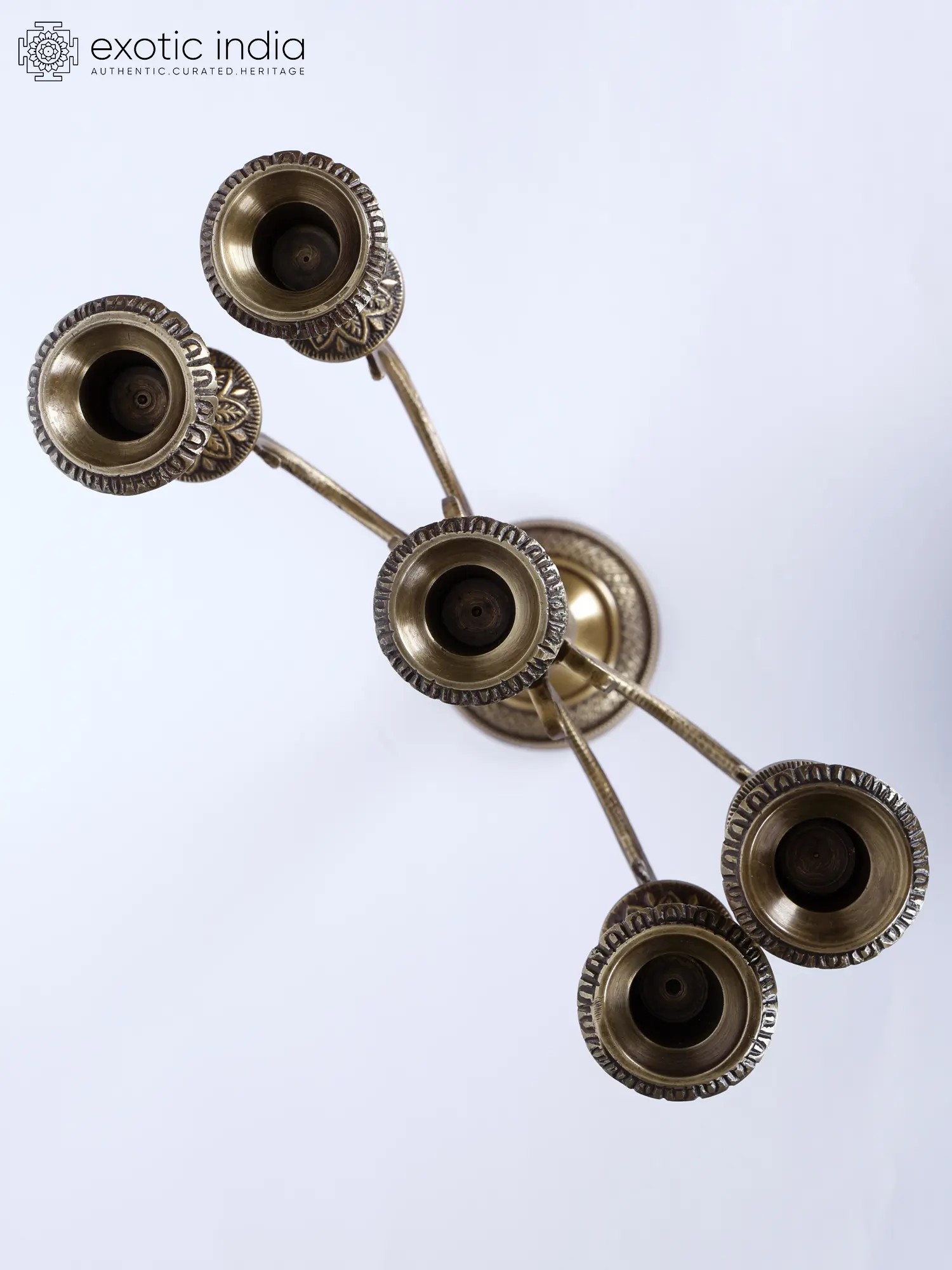 This vintage-style candelabra, made in brass, epitomises timeless elegance with its European-inspired leaf patterns. These intricate designs gracefully attach the candle holders to the central stand, enhancing its ornamental appeal. The candelabra features five holder points, each designed to securely plant long candles, creating a stunning visual display when illuminated.