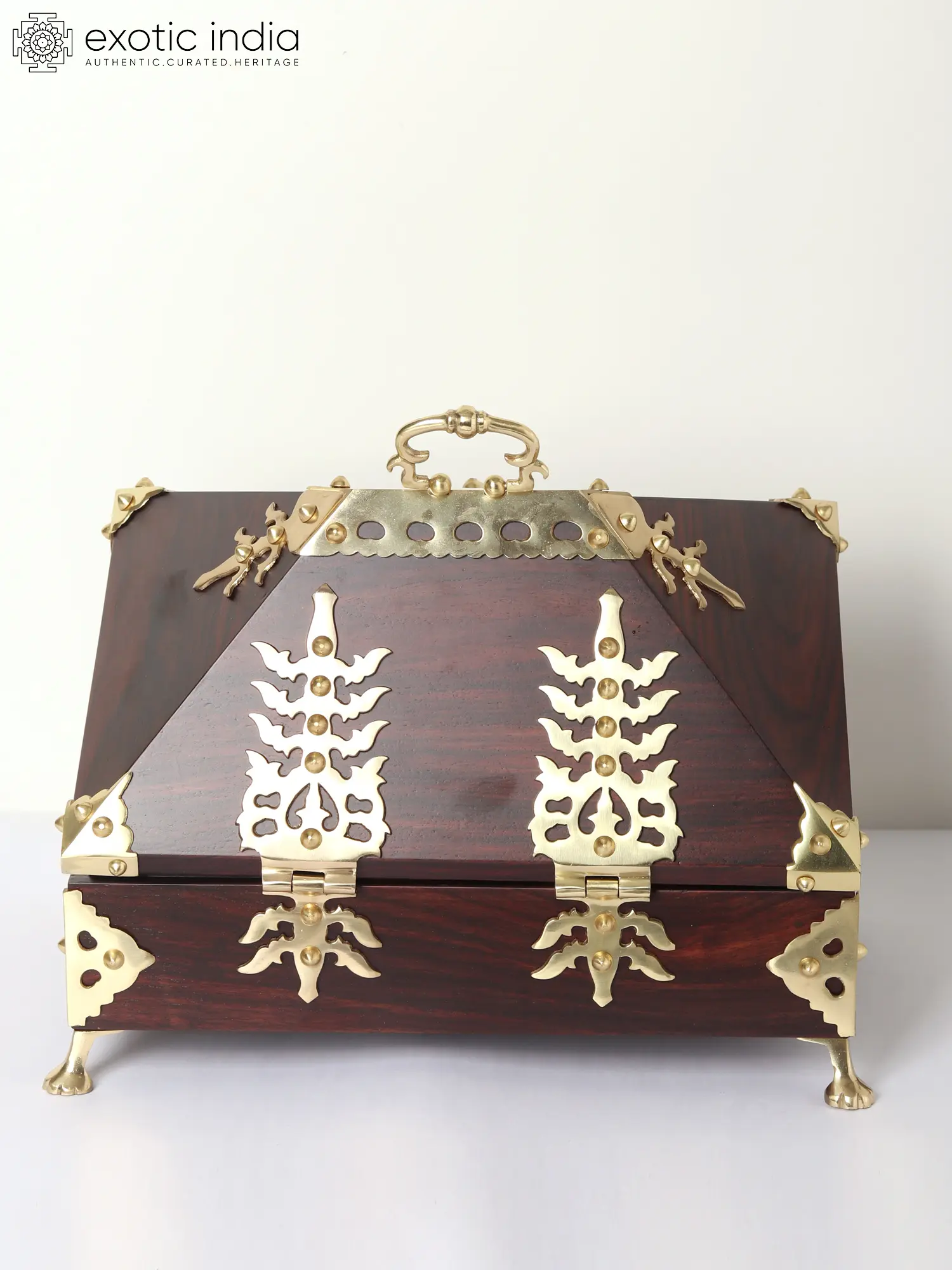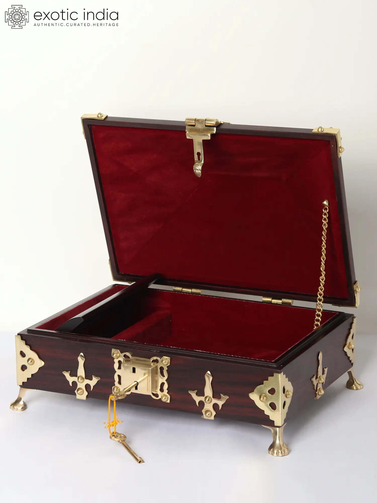 The Wooden Jewellery Box with Brass Fitting, known as the Nettur Petti, represents the epitome of fineness and cultural significance. In India, jewelry holds immense importance, especially among influential women. This wooden box serves as both a functional and aesthetic treasure, designed to organize and safeguard precious jewels. Reminiscent of traditional wood and gold boxes, it caters to the needs of affluent women, ensuring their jewelry is secure, whether at home or during travels.